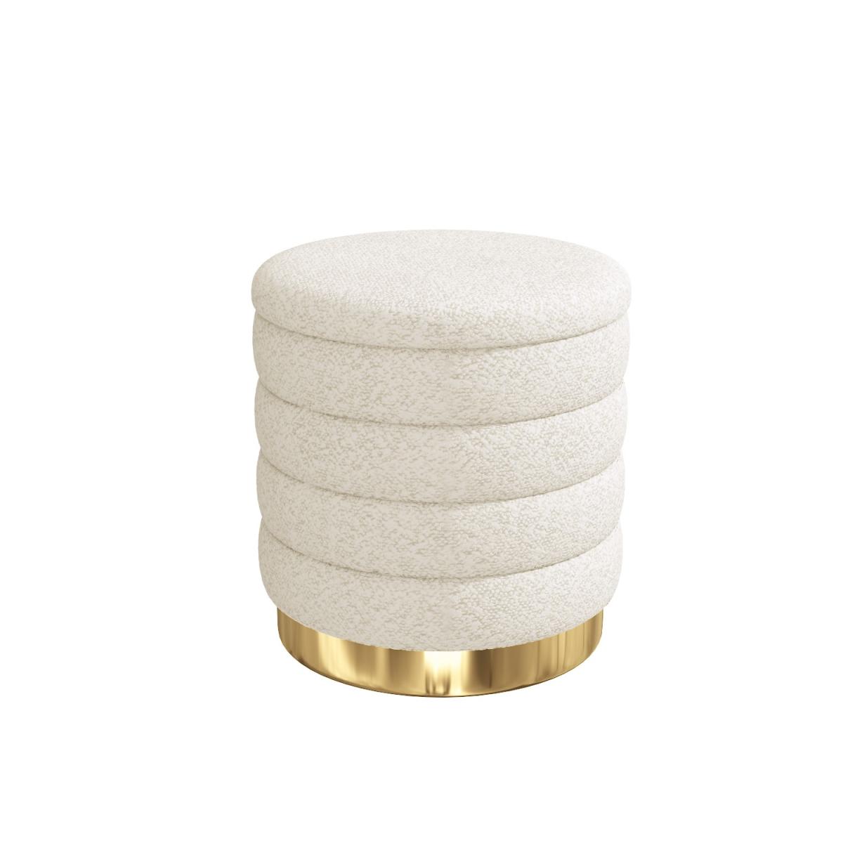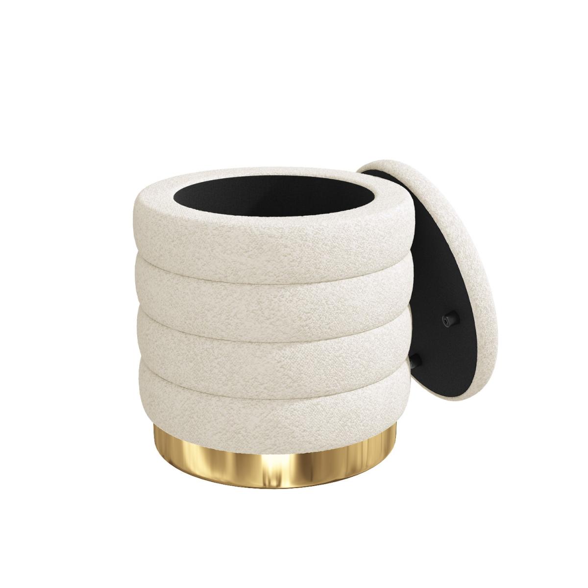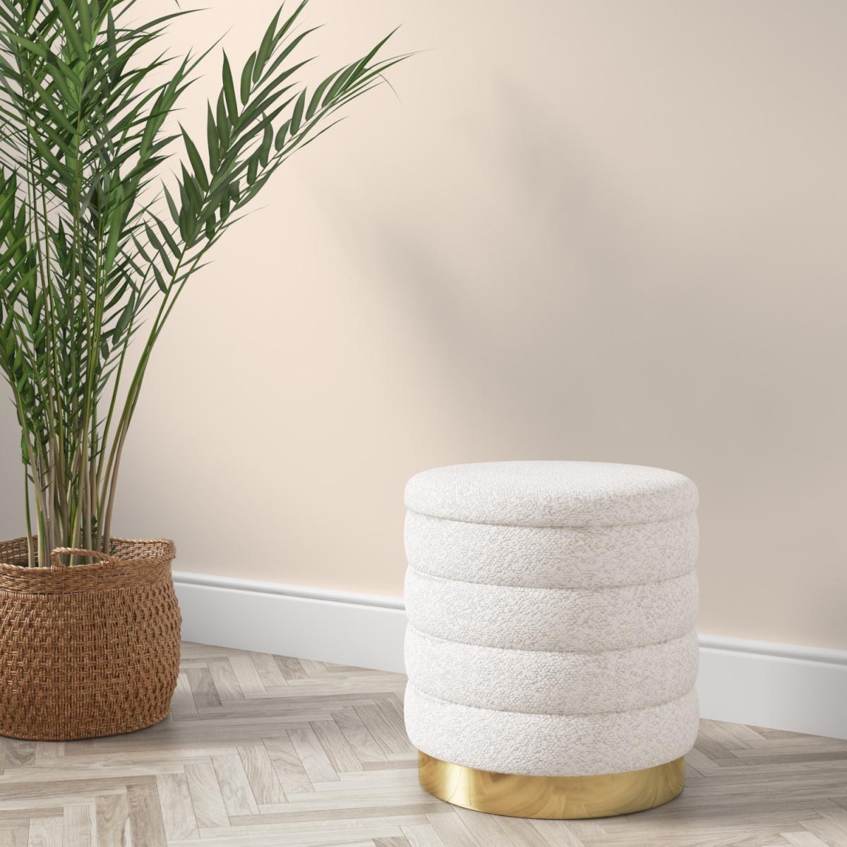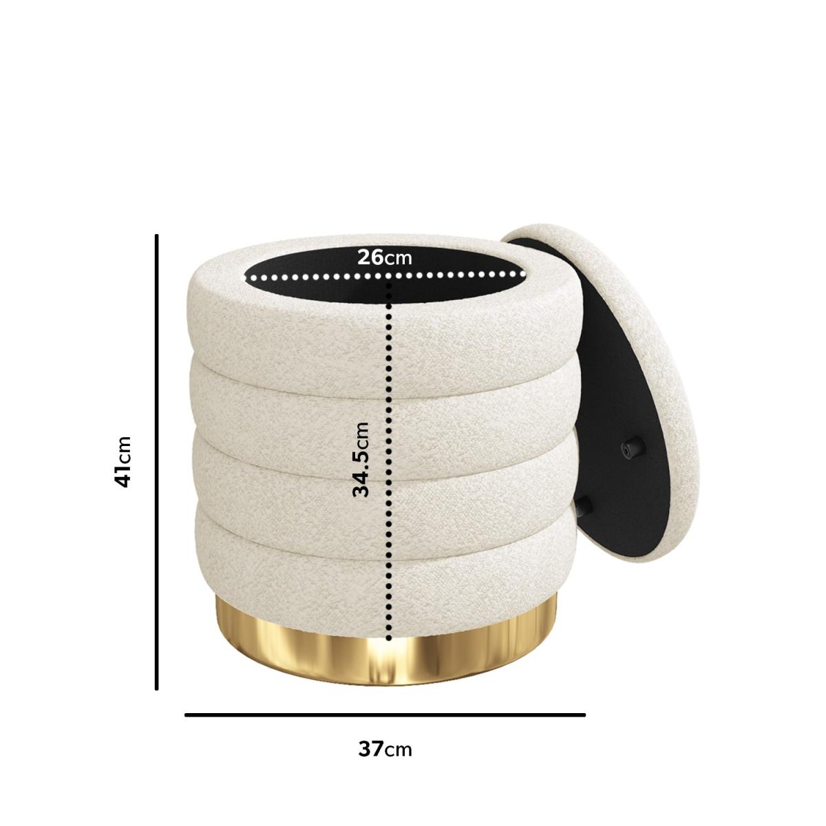 Features we love Small round storage pouffe with ribbed detailing. Discreet internal compartment offers handy storage. Upholstered in cosy boucle fabric. Suits any living room dressing room. Available in other fabrics colours and shapes. All about me. Add a touch of style and elegance to your home with the Astrid storage pouffe. Upholstered in soft boucle fabric not only does it offer storage the gold banding also brings a stylish feel to any room. Use your storage pouffe as a footstool or stool in any living area or even as a feature in your dressing room. Simply lift the lid to reveal the internal storage compartment measuring Φ26 x H34.5 cm. Need to know. Dimensions. H41 x W37 x D37cm Internal dimensions. D26 x H34.5 cm Colour. Cream Finish. Upholstered Material. Boucle fabric wood and metal Assembly required. No