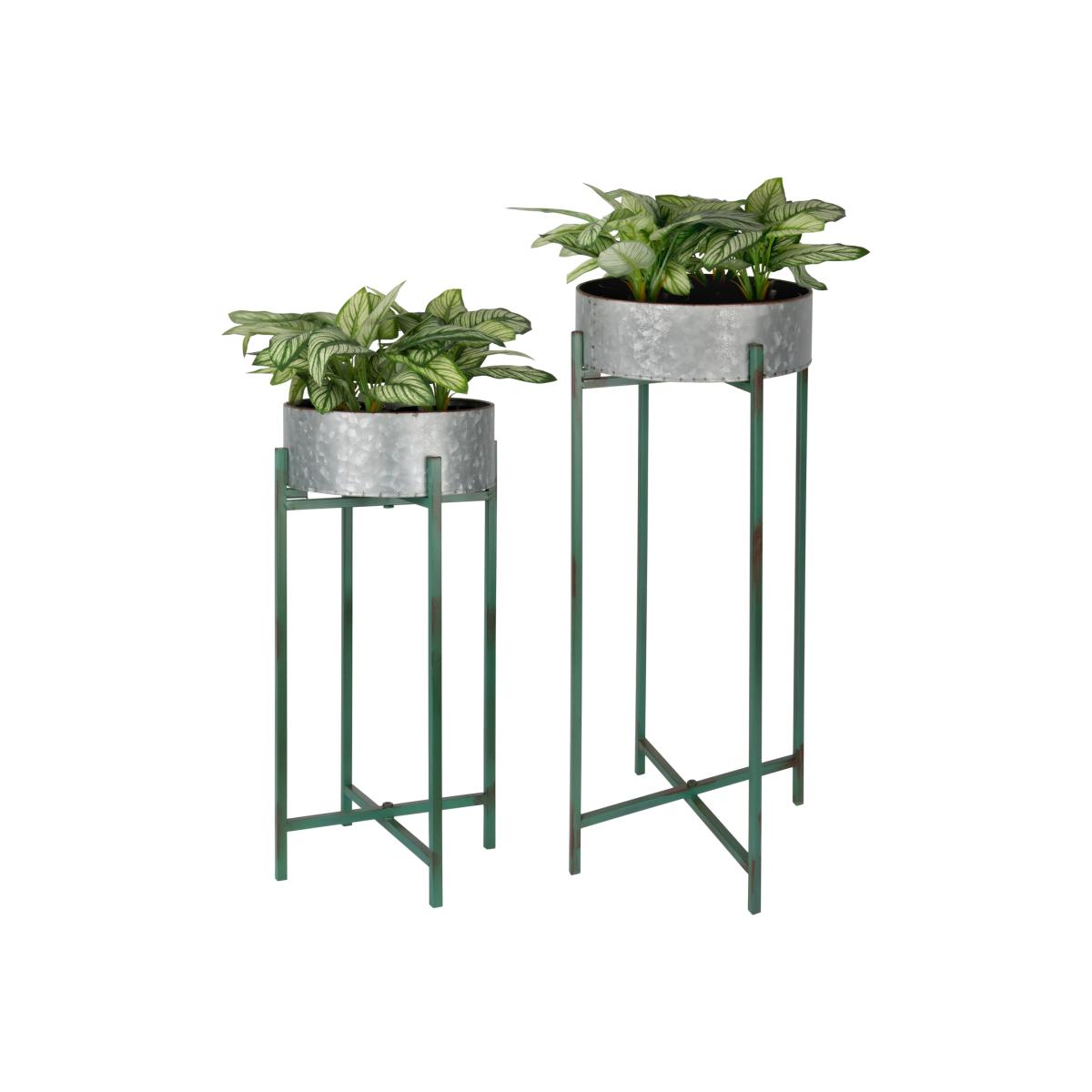 Shallow, round planters on a green metal stand. Comes in a set of 2 and can be used indoor or outdoor for plants and small shrubs.