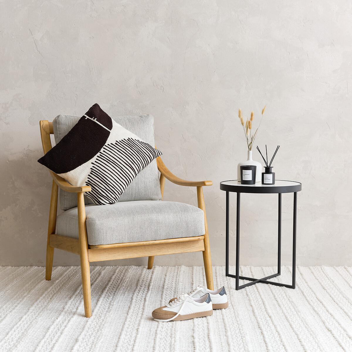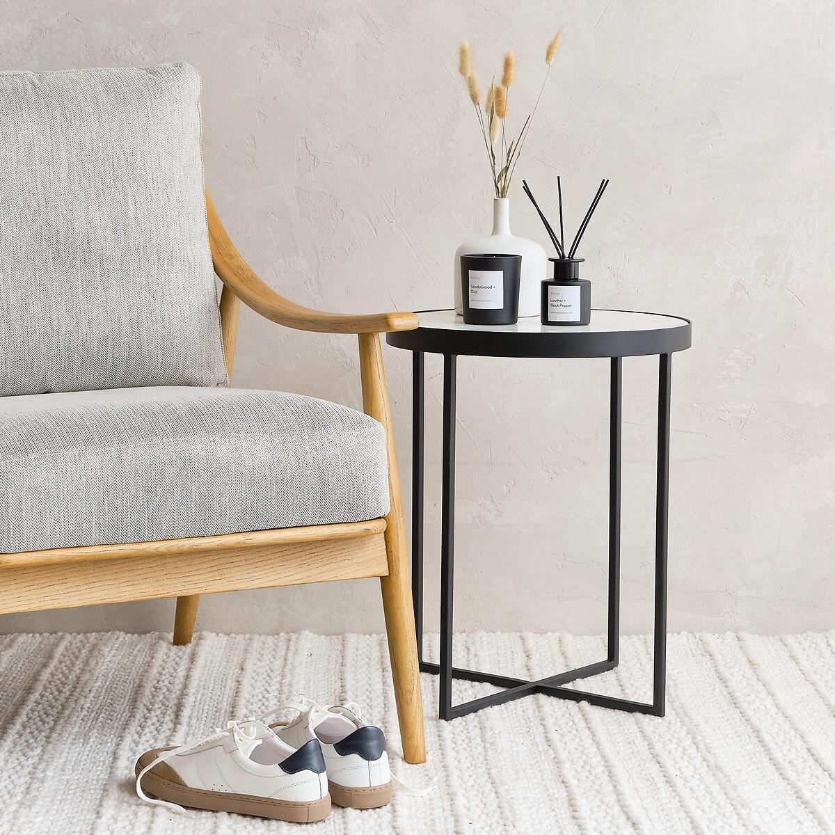 I really like this round side table because of its sleek combination of white marble and black iron, which makes it versatile for both modern and classic interiors. It works especially well in minimalist schemes or interiors with monochrome or metallic accents, adding a touch of sophistication without overwhelming the space. Practical styling tips include using it as a bedside table, or grouping a few with different heights for a layered, curated look in a living area. It’s perfect for holding a lamp, books or decorative objects, and its understated elegance means it can easily be paired with colourful accents or more neutral palettes.