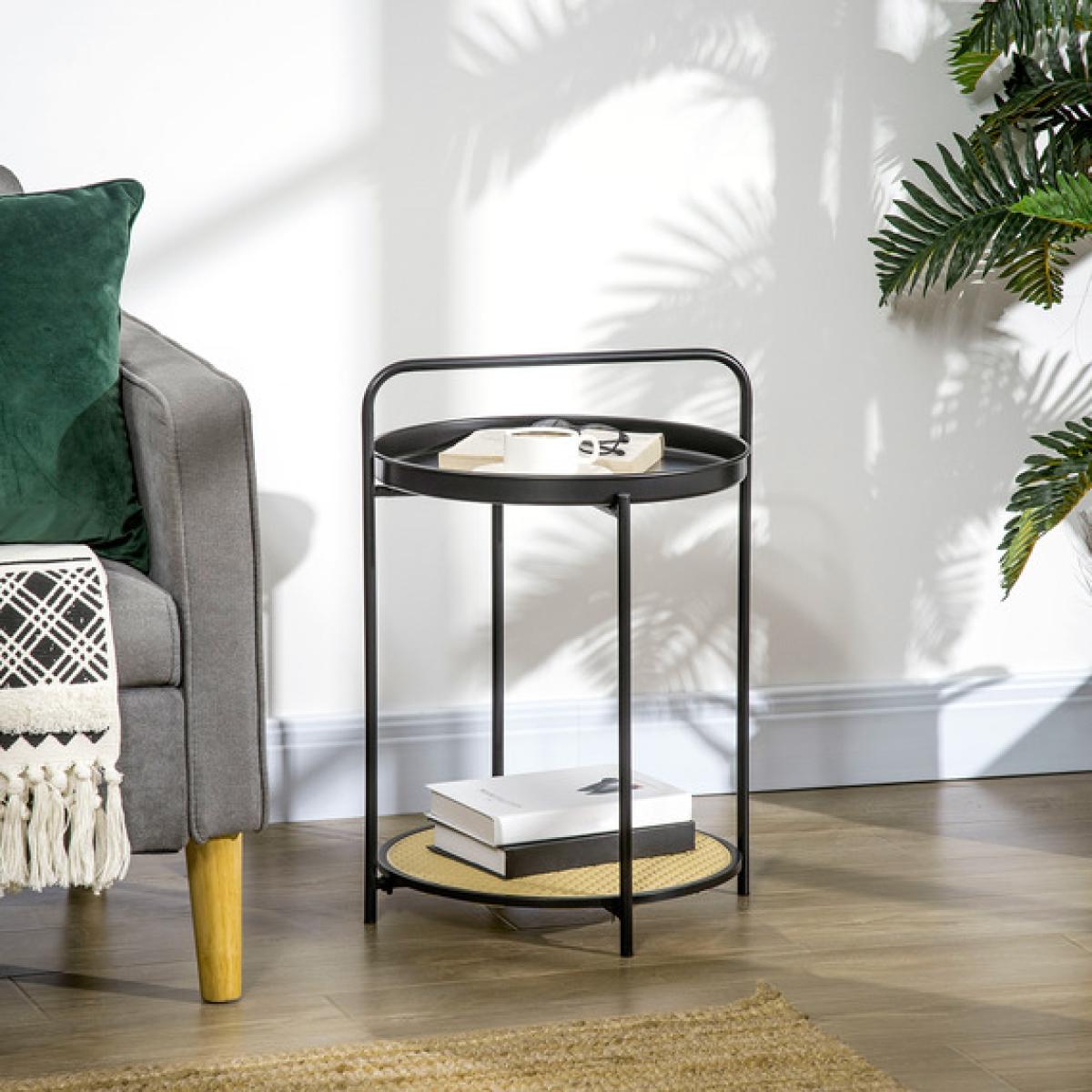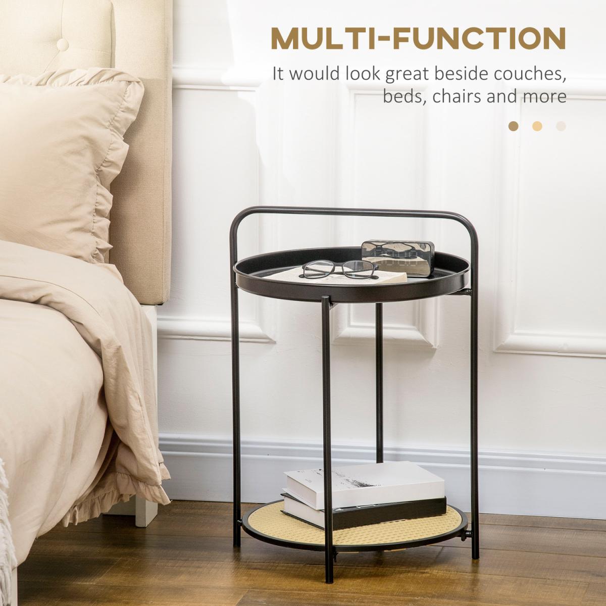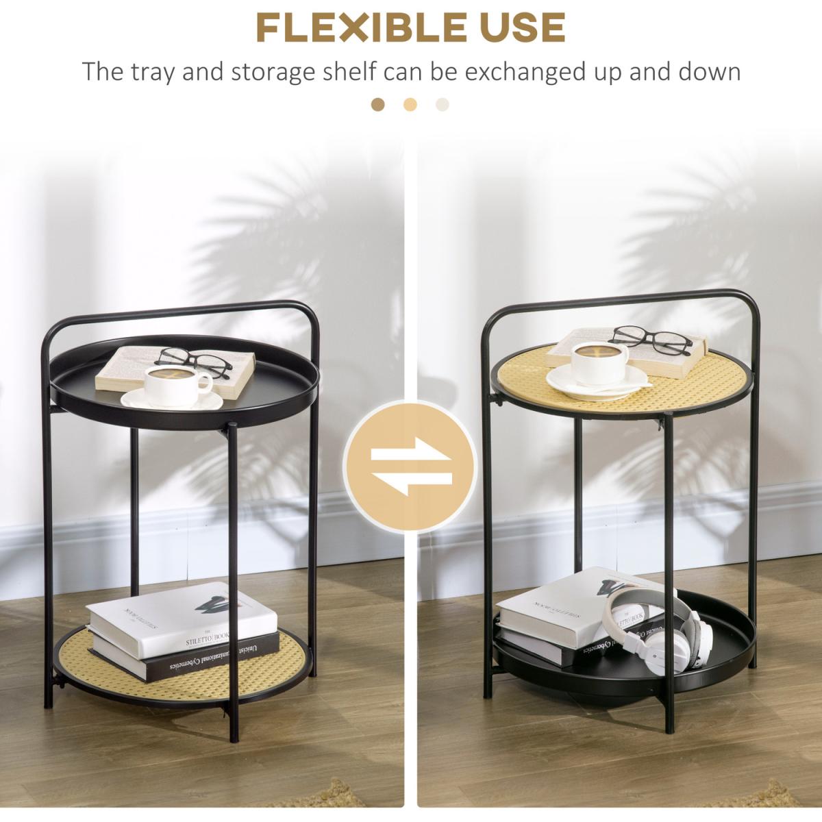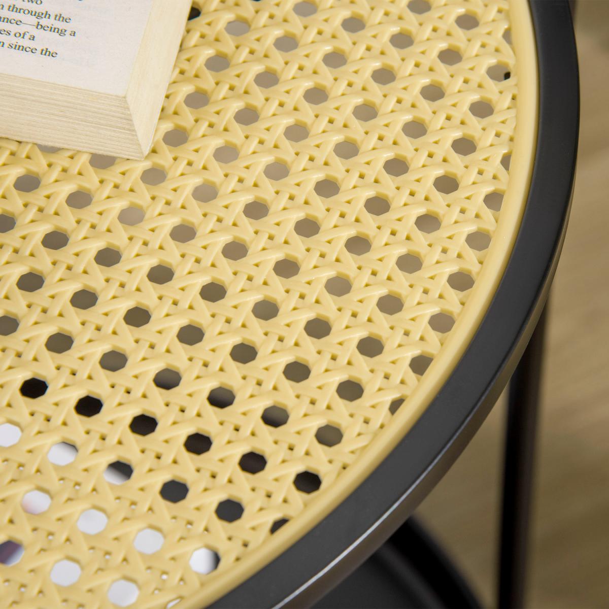 Round Side Table with Detachable Tray and Plastic Rattan Shelf - Black, Light Yellow