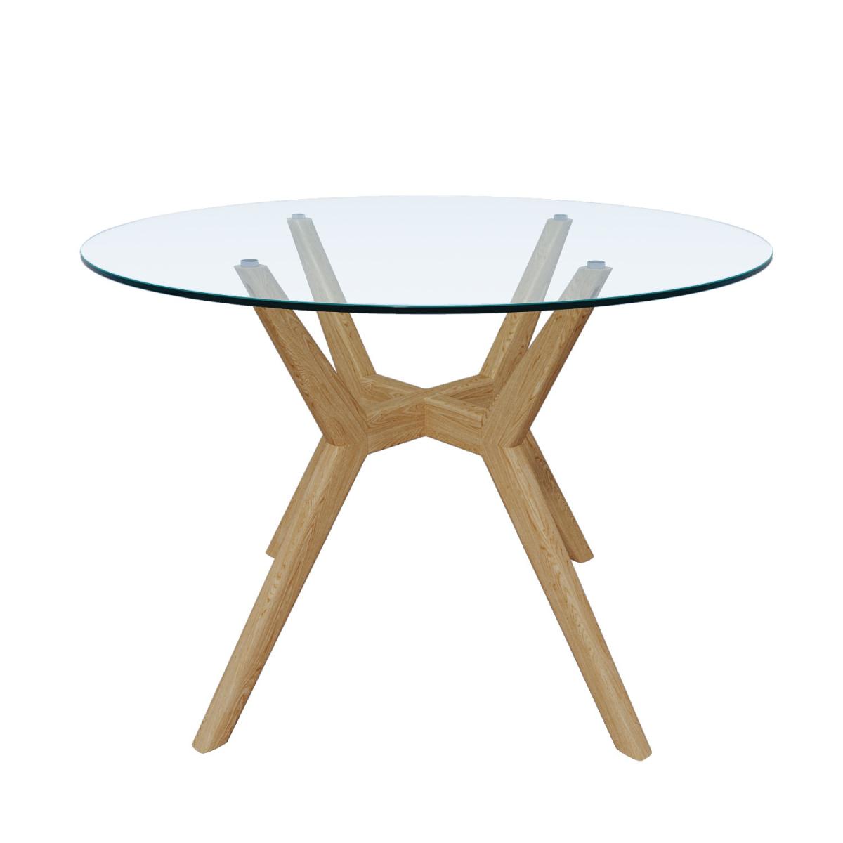 Heat and scratch-proof tempered glass top Sturdy and durable solid oak legs Includes adapters to secure glass tabletop to the legs Retro Scandi inspired oak dining chairs With a solid oak frame and faux leather seating Need to know Dining Table Information Finish: Natural wood and glass Material:Solid oak and tempered glass Assembly required: Yes Dining Chair Information Number of chairs: 4 Material: Solid oak wood (frame) and PU (seat and back) Finish:Woven PU and natural painted frame Assembly required:Yes Range: Bree