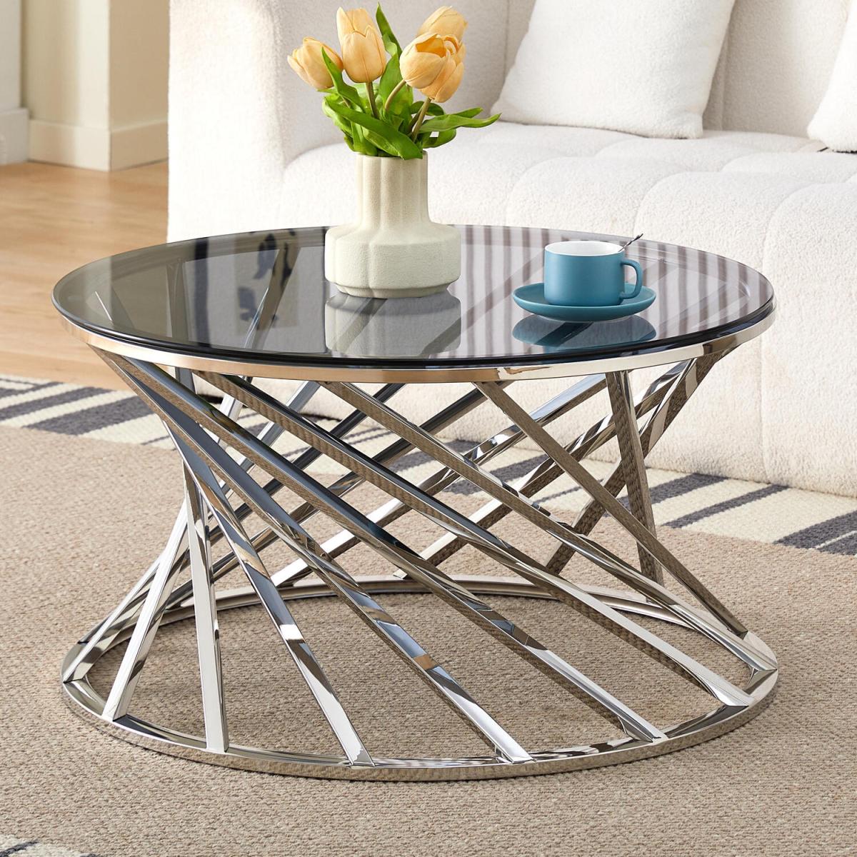 Transform your living space into a stylish and inviting haven with this stunning round metal coffee table. Crafted with a sleek, geometric design, this table features a tempered tinted glass top that rests atop a sturdy, criss-cross effect metal base in a luxurious gold or silver finish. Its unique and eye-catching silhouette adds a touch of sophistication and modernity to any room. Effortlessly complement your existing decor while providing a functional surface for displaying decorative accents, books, or beverages. With its durable construction and timeless appeal, this coffee table is a versatile and practical addition to your home. Elevate your interior with this elegant centrepiece that seamlessly blends form and function. Please note that all dimensions are approximate, please allow room for slight variations.