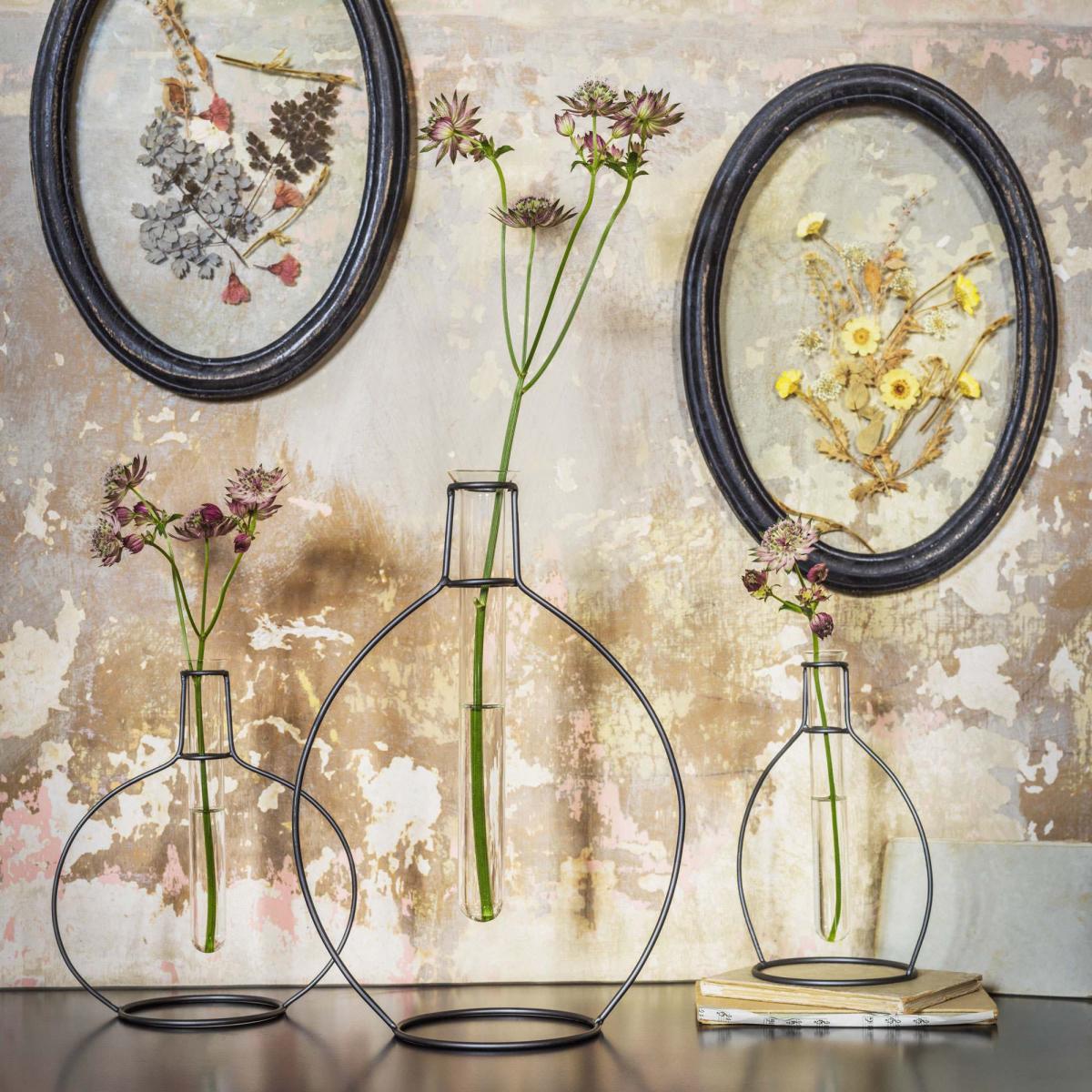 A collection of test tube vases secured in delicate iron frames. Mix various sizes together with single stems for a quirky approach to your floral displays.