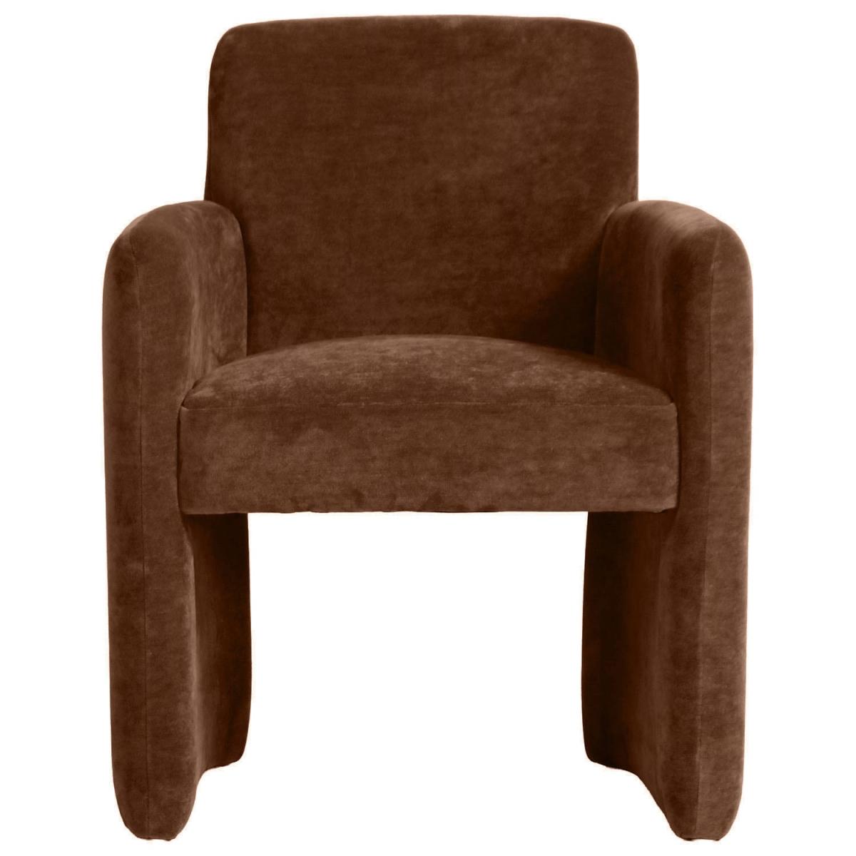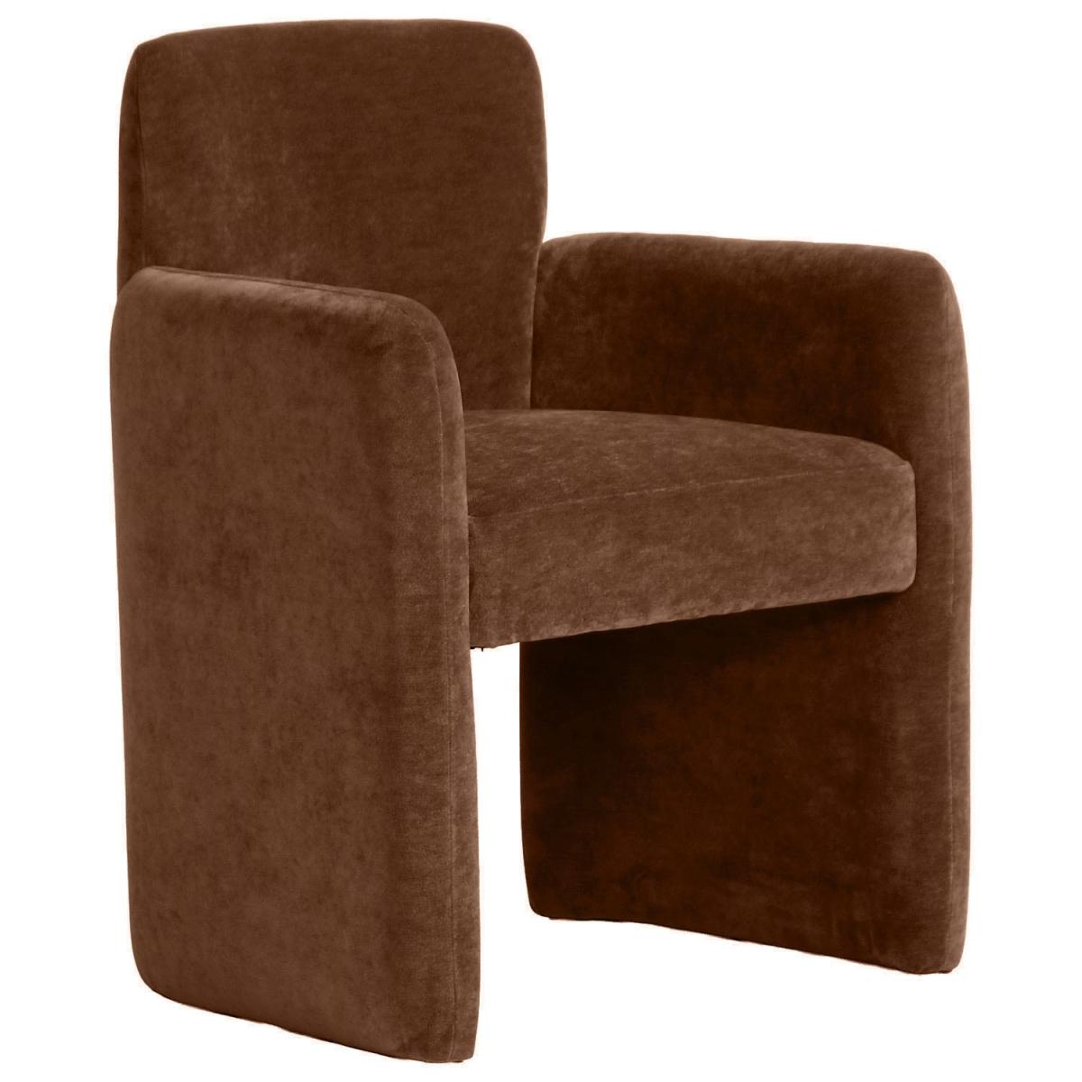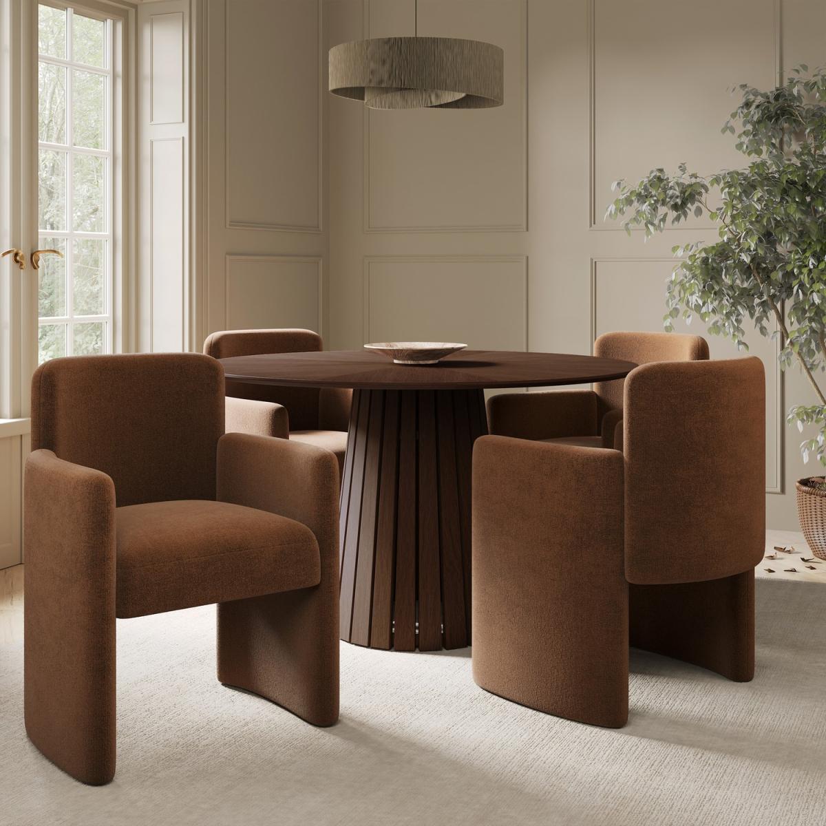 Rich walnut-stained wood adds warmth and timeless elegance to your dining space. The unique slatted base not only adds visual interest but also creates a bold, architectural statement with sturdy support. The soft rust-coloured chenille fabric and round soft edges provides both comfort and elegance, making them perfect for everyday use. Designed for daily use but styled to impress, this set offers practicality without compromising on style. Enhance your dining area with the Owen Dining Set, a perfect combination of style, function, and timeless appeal. The round walnut dining table features a walnut tabletop that comfortably seats four, making it ideal for intimate dinners or family meals. The slatted pedestal base offers not only stability but also creates a focal point in your dining space. With its rich walnut finish, the table seamlessly blends into contemporary, mid-century, or classic interiors, making it a versatile addition to any home. Paired with the Mae fully upholstered dining armchairs, this set brings warmth and comfort to your dining space. The rust-coloured chenille fabric and soft, round edges offers a cosy yet refined look, perfect for everyday use while maintaining a stylish aesthetic. The Mae chair provides the perfect balance of form and function, elevating your dining room with both comfort and sophistication. This Dining Set adds lasting elegance and practical style to any dining area, creating a welcoming atmosphere for every meal. Please use heat-protective mats & coasters when placing items onto the table to protect the tabletop, clean up any spills straight away as wood is porous and will absorb liquids.
