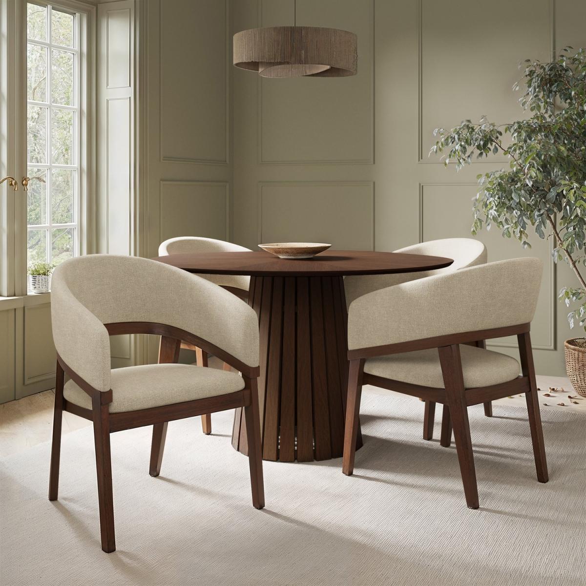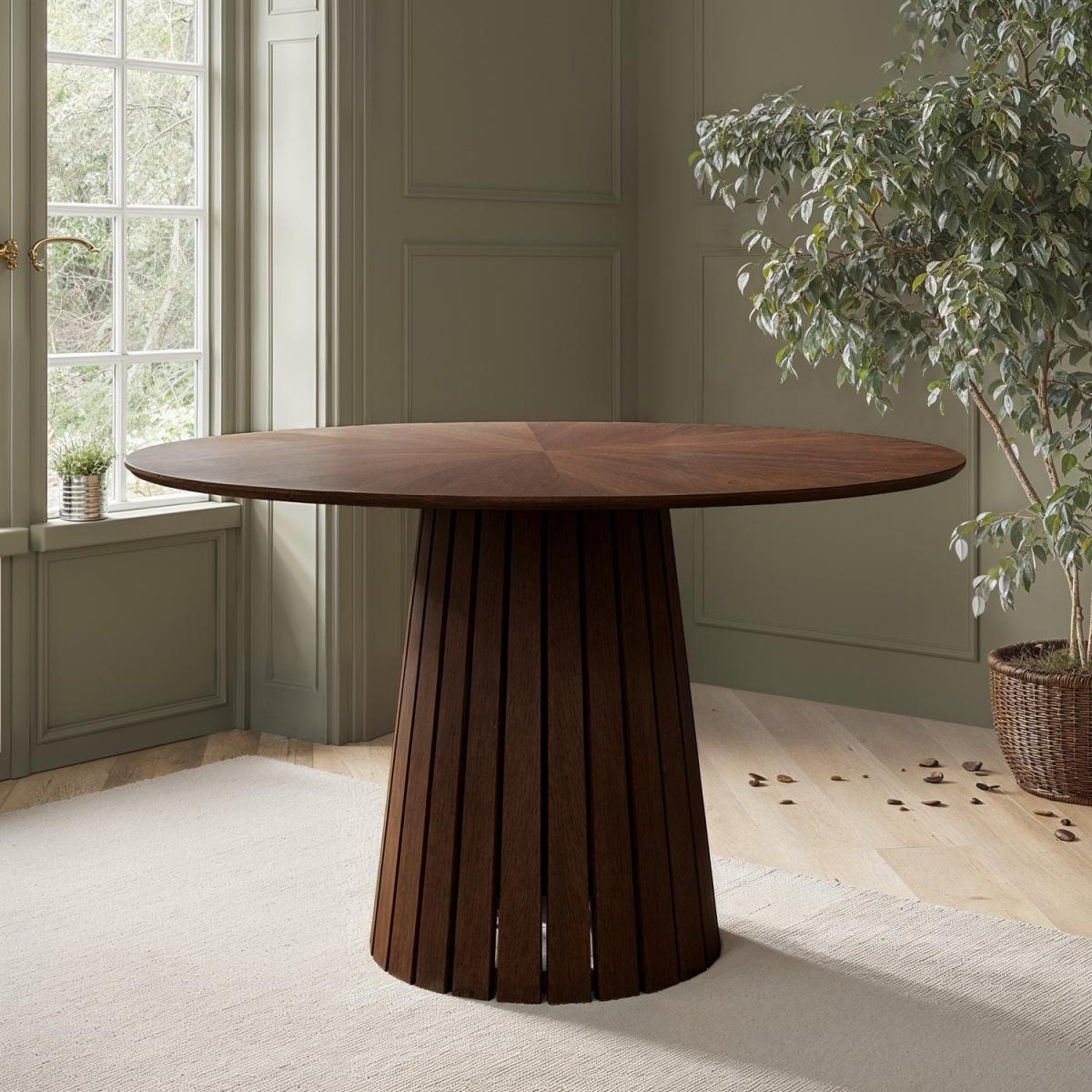 Rich walnut-stained wood adds warmth and timeless elegance. Vertical wooden slats create a bold, architectural statement with sturdy support. Smooth surface offers ample room for dining, drinks, and décor. Built from durable materials for long-lasting strength and stability. Designed to elevate any dining space, this round walnut dining table combines style, function, and durability. The sleek round tabletop comfortably seats four, making it perfect for intimate dinners or family meals. The slatted pedestal base not only provides stability but also maximizes legroom for a spacious feel. The rich walnut finish blends effortlessly with contemporary, mid-century, or classic interiors. Whether paired with upholstered dining chairs or sleek wooden seating, this versatile piece creates a timeless focal point in any dining area. Please use heat-protective mats & coasters when placing items onto the table to protect the tabletop, clean up any spills straight away as wood is porous and will absorb liquids.