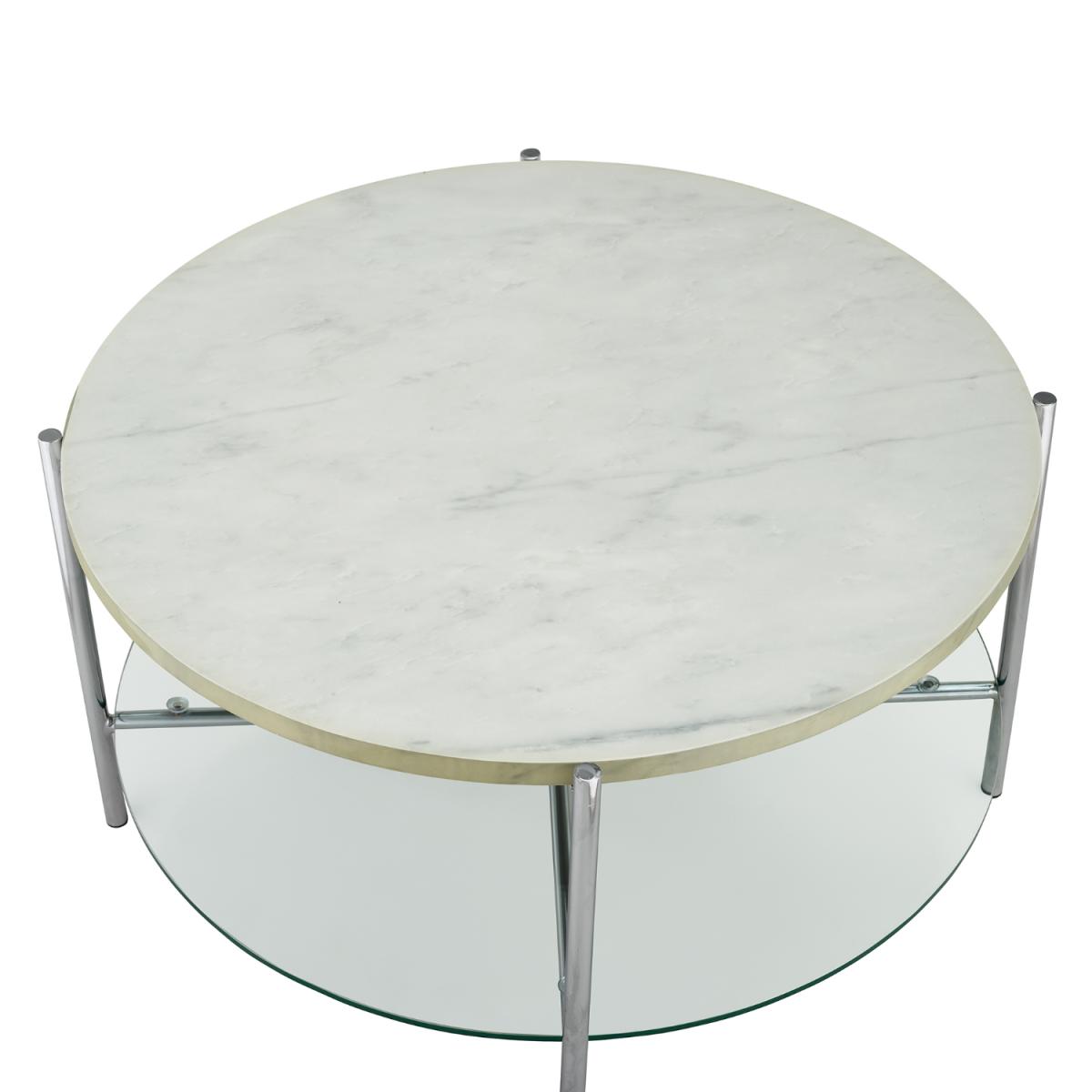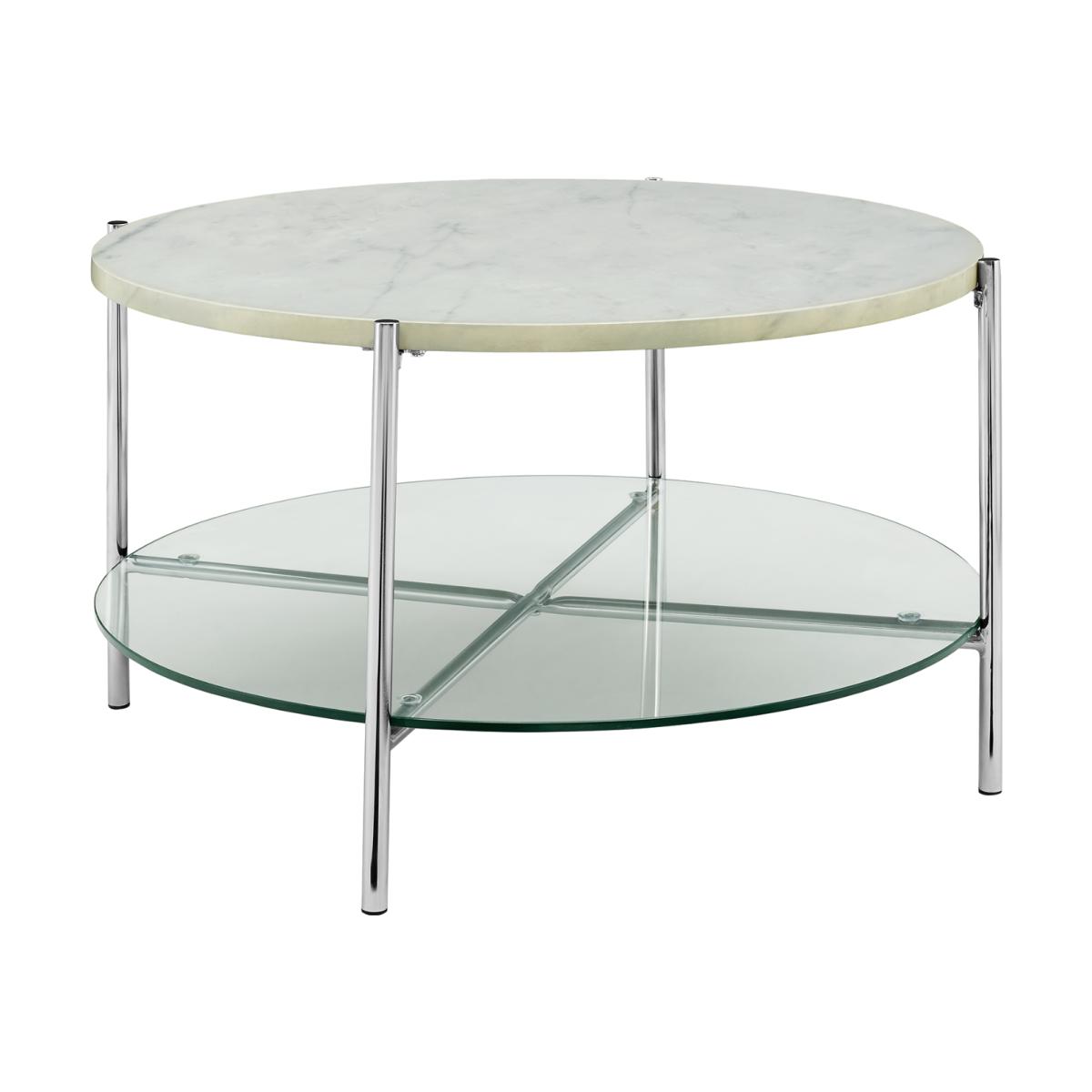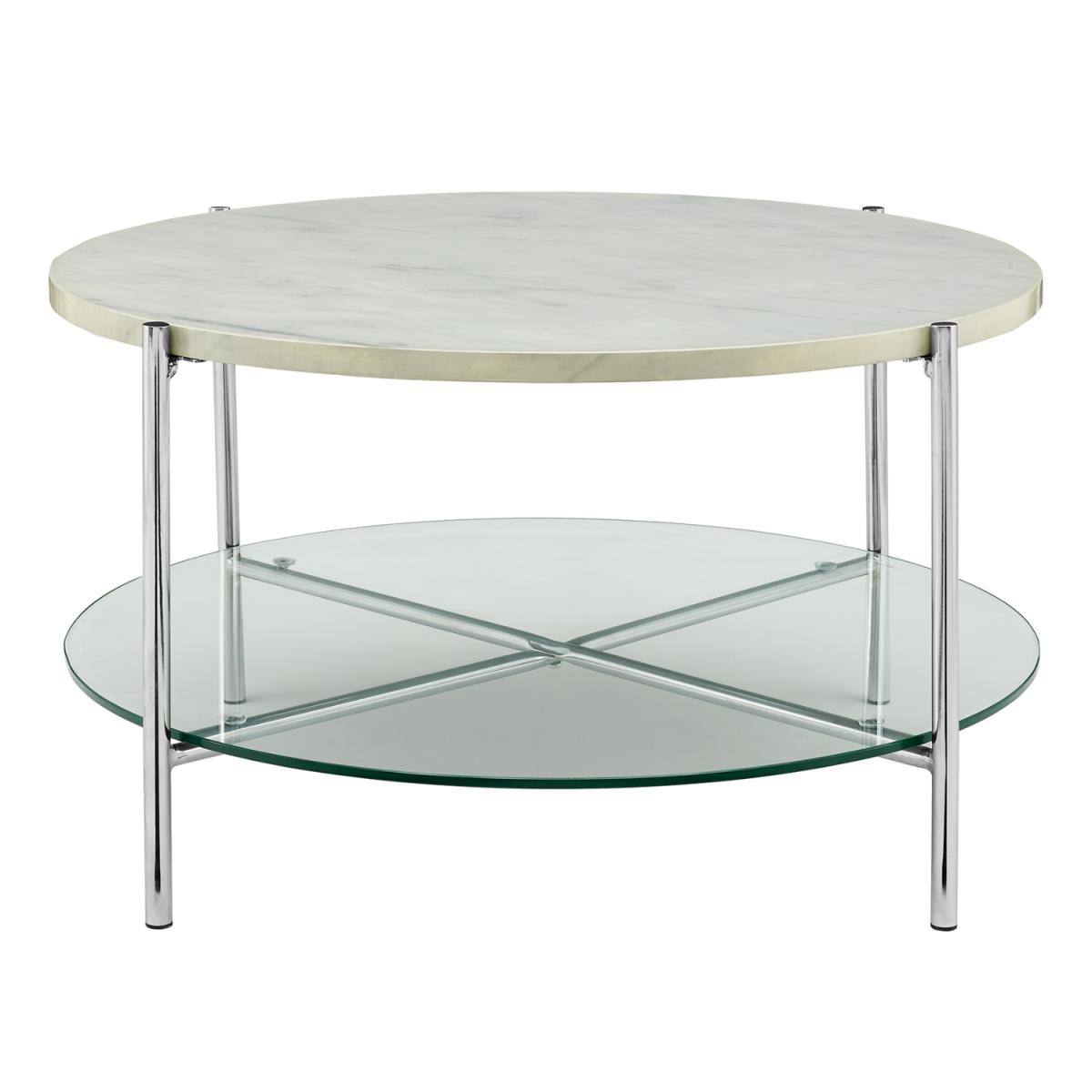 Round White Coffee Table in Faux Marble with Glass Shelf - Foster