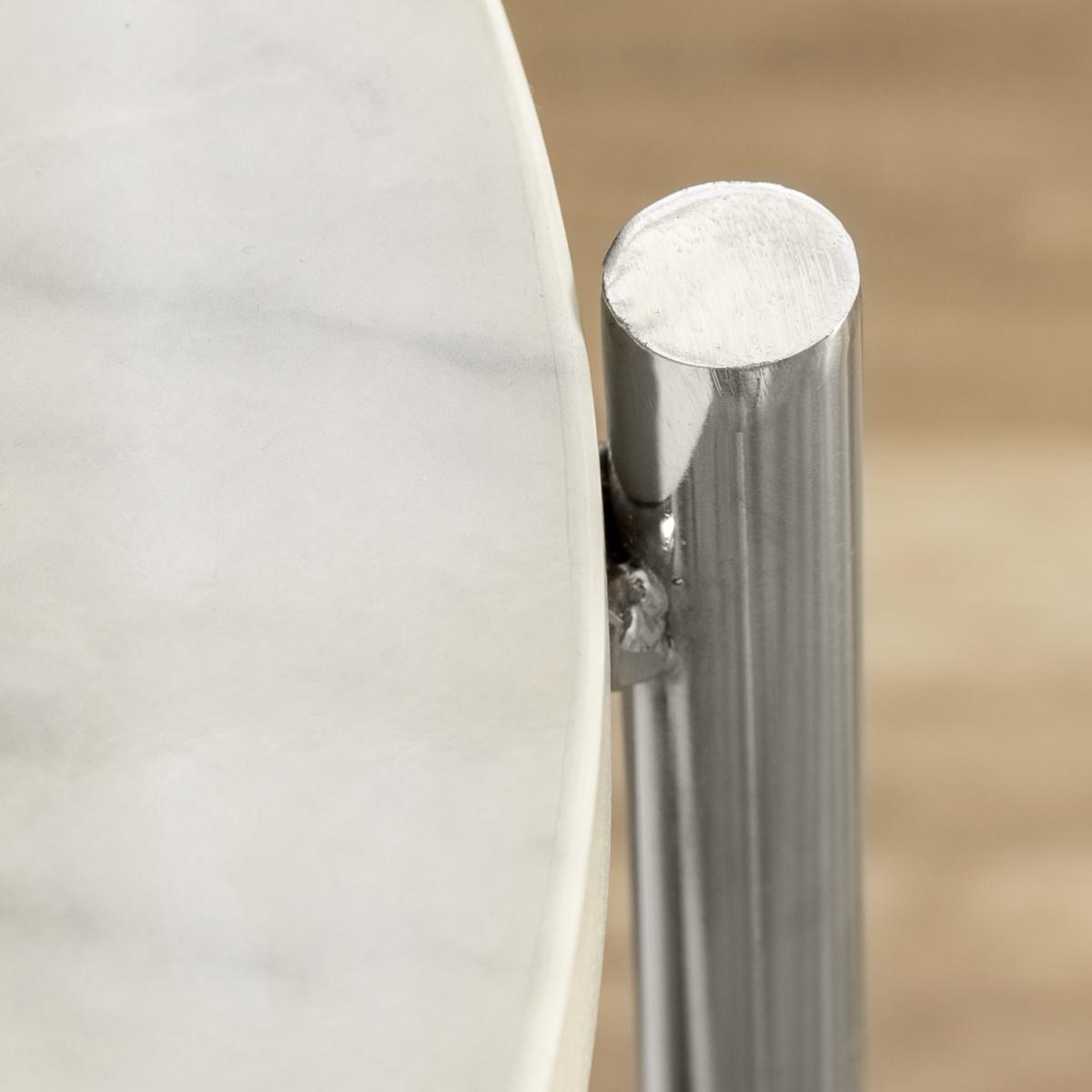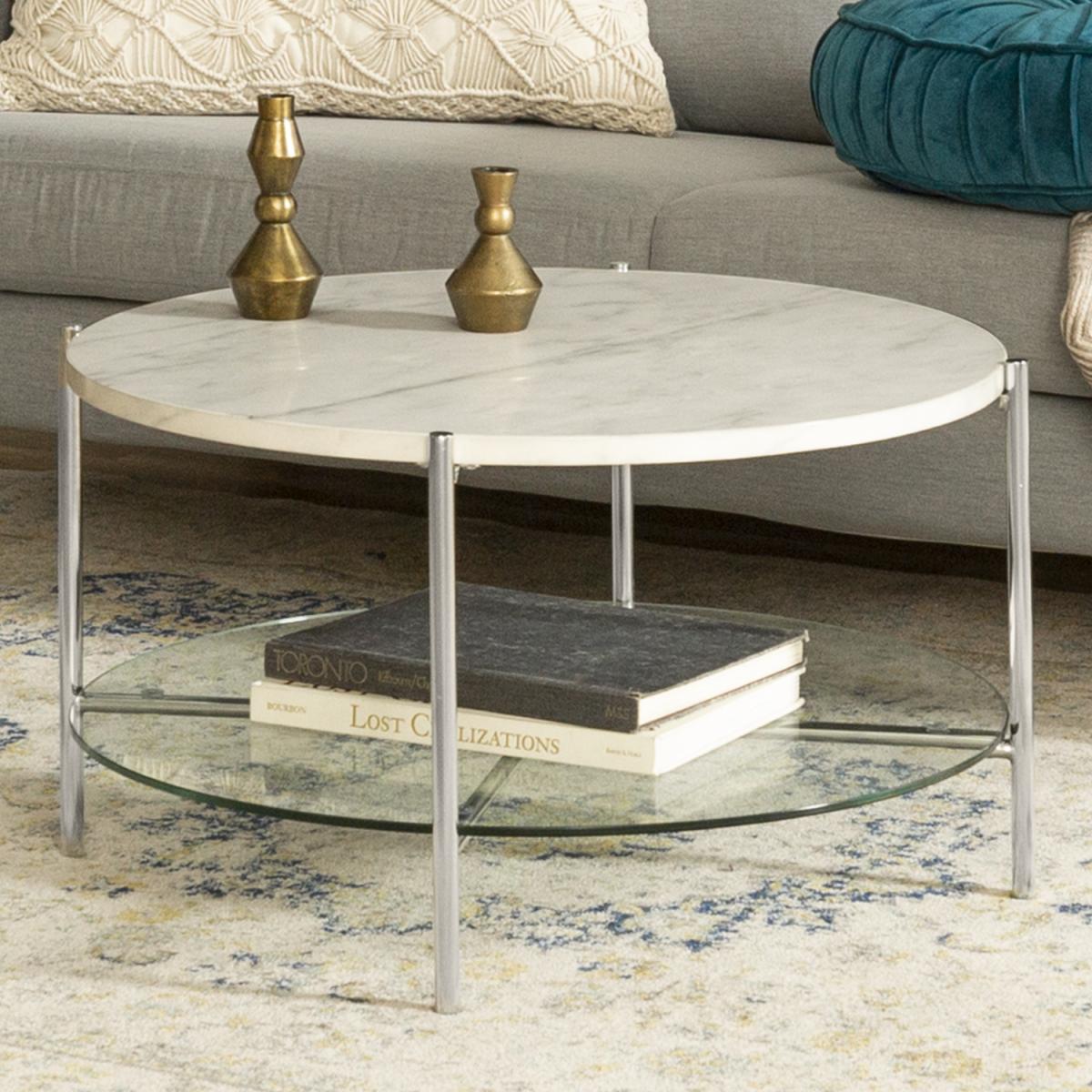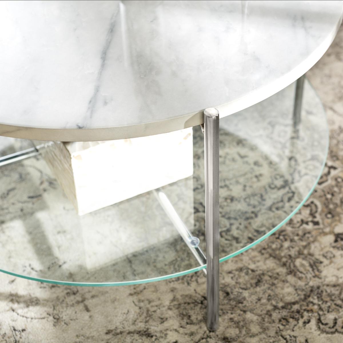 Round White Coffee Table in Faux Marble with Glass Shelf - Foster