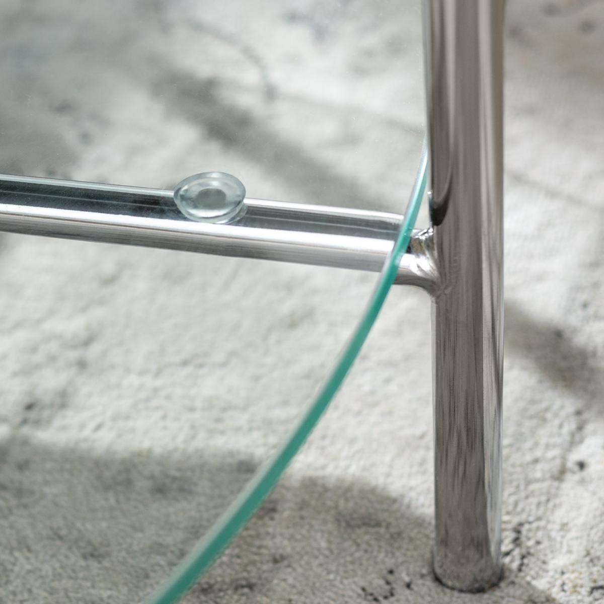 Make a statement in your living room with our coffee table. This round coffee table has a glam, mid-century modern feel that will compliment your current home interior. With a mixed material design of a bottom glass shelf, durable laminate table top, and round chrome metal legs for an altogether stunning piece. The table top is protected in a UV coating for a high shine finish and moisture resistance.