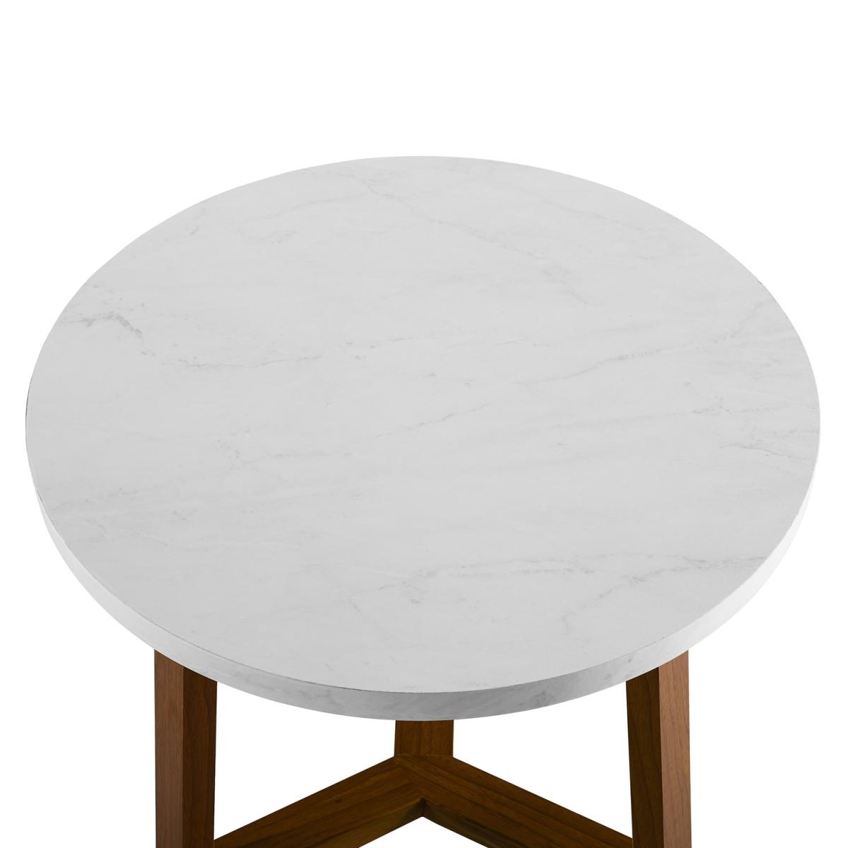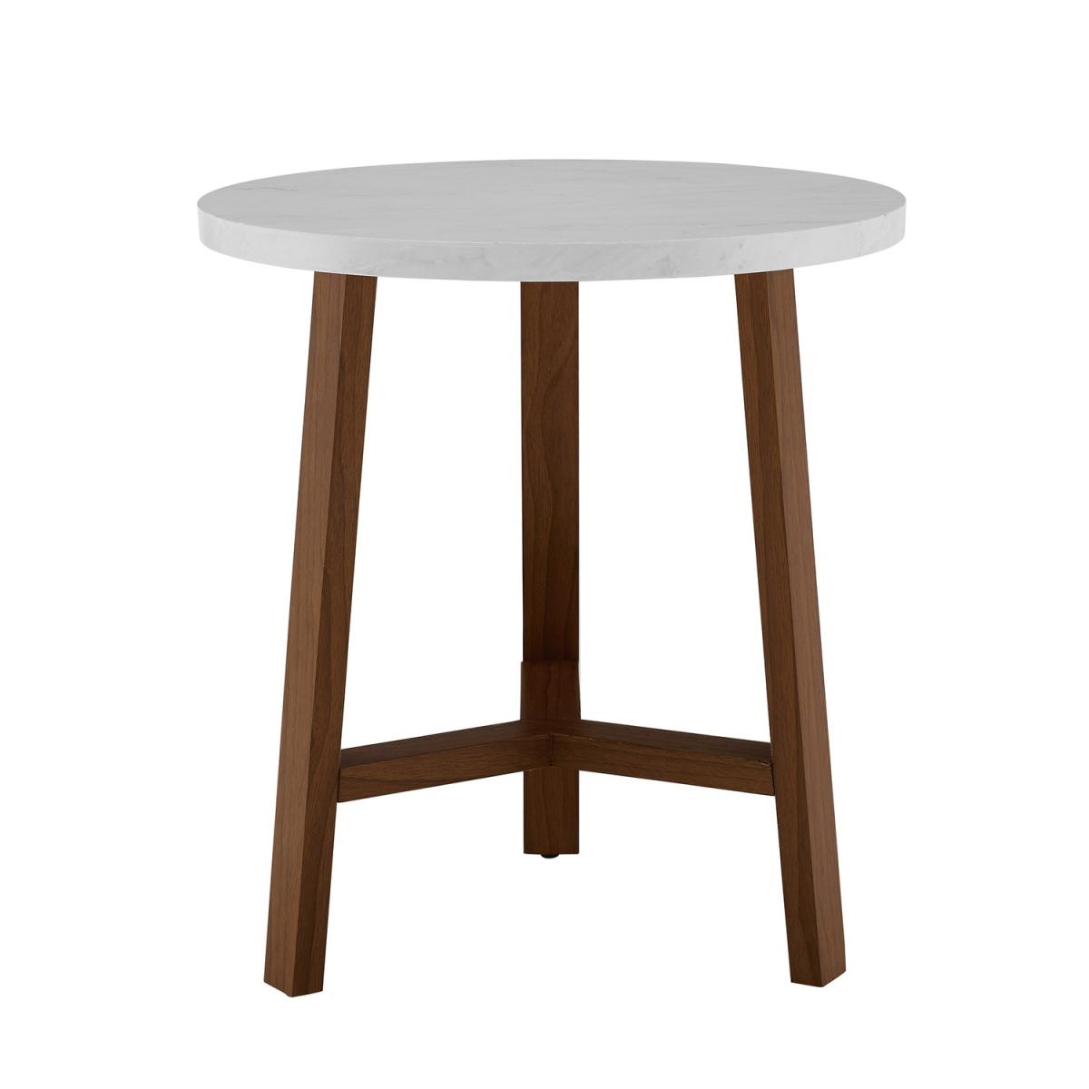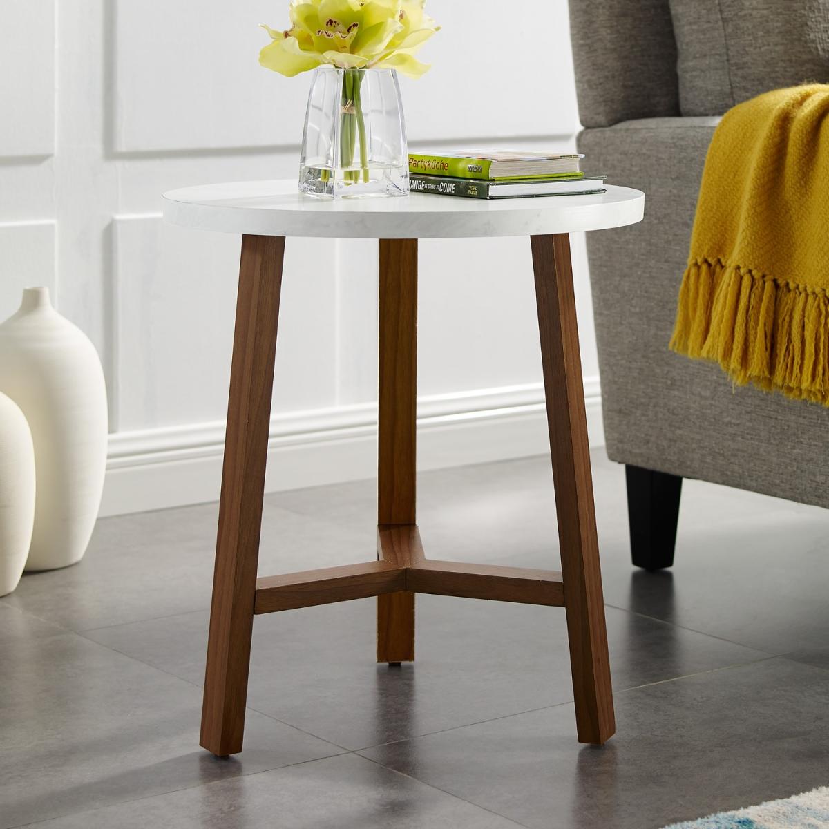 Add this stunning mid-century modern round side table next to your couch to complete your living room décor. This table encompasses transitional, contemporary and mid-century modern style, altogether creating an accent table that will look appealing in any room. The compact structure makes it easy to place next to your couch, chair, or to use in your bedroom as a nightstand. Three wood legs hold up the gorgeous faux marble top, for both a reliable and on-trend piece.