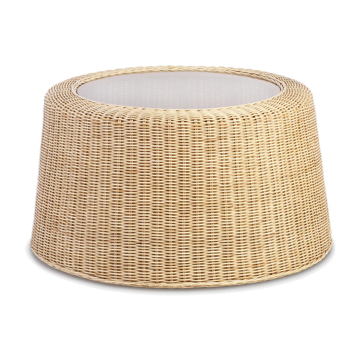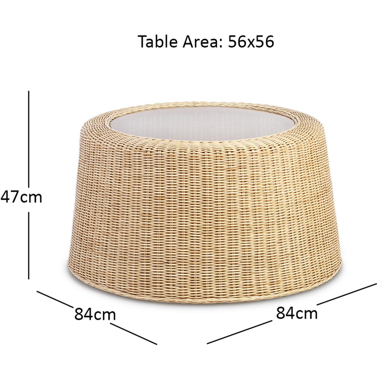 A sustainable natural rattan coffee table with 5mm toughened glass top and intricate wicker weave
