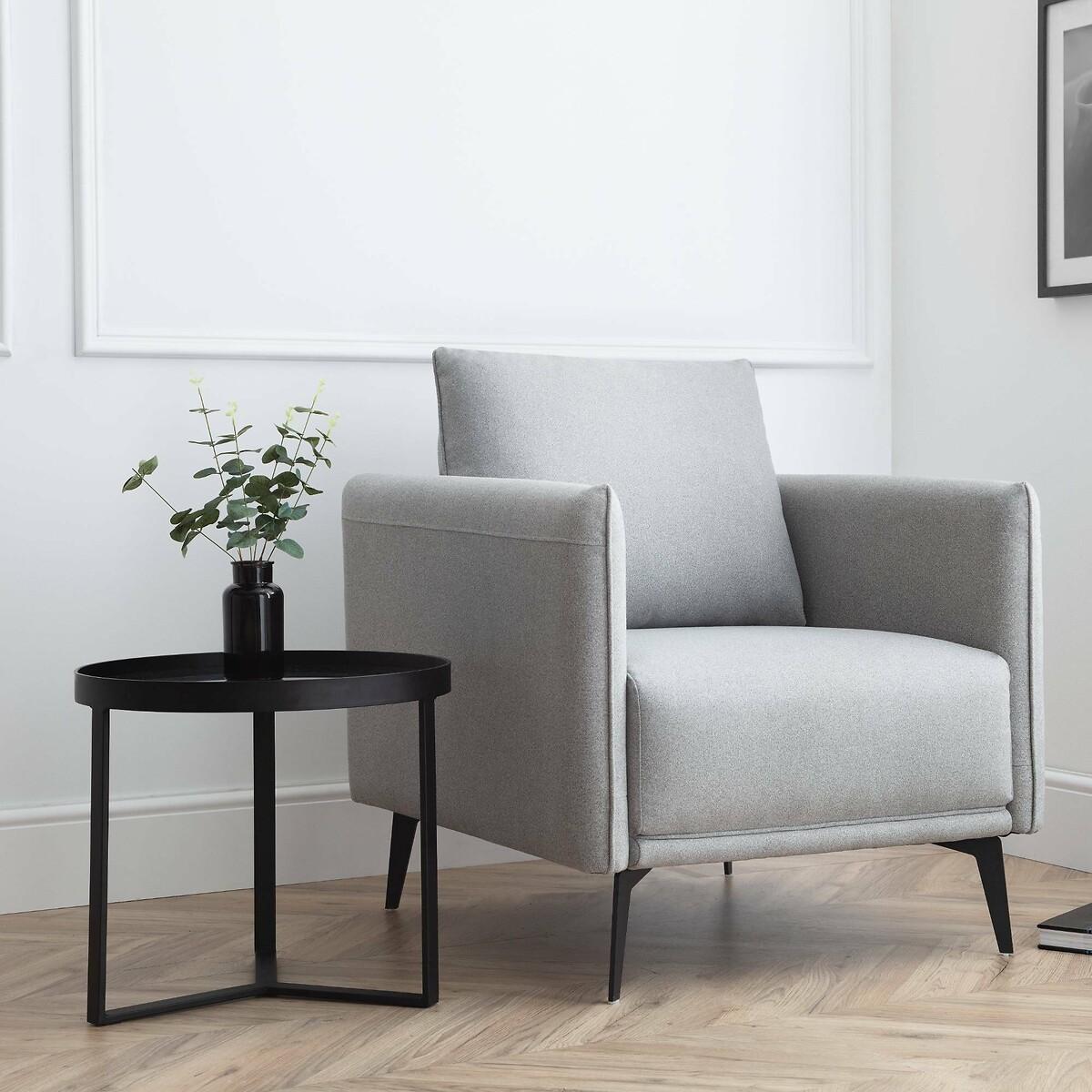The Roux sofa collection is a stunning, contemporary upholstery set with stylish fixed seats and centre piping details. Upholstered in a light grey wool effect fabric, Roux offers comfort with an ultra modern feel, with removable bolster cushions and sleek black metal legs. The Roux collection includes a compact armchair, 2 seater sofa, and 3 seater sofa allowing you to create the perfect arrangement to wind down after a tough day. Product details• Upholstered in wool effect fabric• Tapered metal legs• Wood frame• Foam fillings• Medium comfort• Full assembly required. Product Composition - 25% Wood, 25% Foam, 25% Fabric, 25% Metal. Product Dimensions - 83 cm x 89 cm x 57 cm , Weight - 25.5 KGPackage Dimensions - 88 cm x 82 cm x 56 cm, Weight -31.1 KGThis product will be dispatched by one of our trusted suppliers. You’ll be contacted by their selected courier about your delivery. Please note: this product cannot be delivered to all Offshore Islands, Northern Ireland or Republic of Ireland. JULIA01