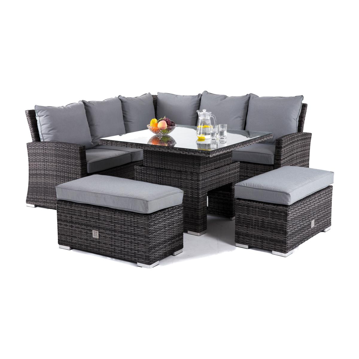 Design. A comfortable way to enjoy time in the great outdoors, the Rovsham garden corner dining set comes with an adjustable table that can be lowered for casual affairs and raised for sit-down meals. Featuring a spacious corner sofa and two benches, all with cushioned seats, it’s the perfect place to soak up the sun all day long. In gorgeous grey rattan, this corner garden dining set is sure to take centre stage each and every summer.