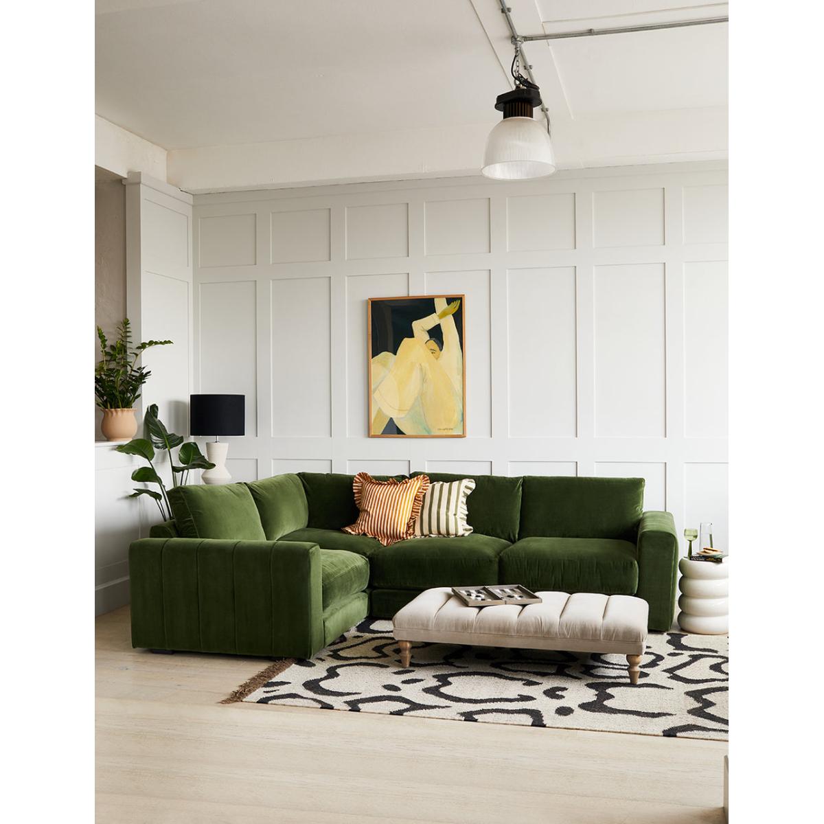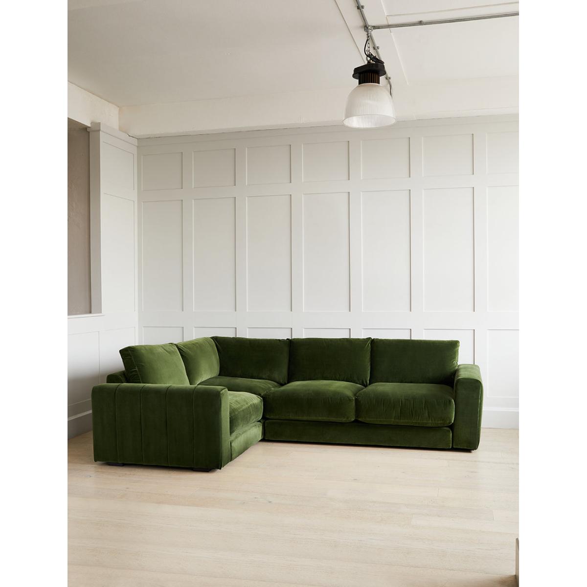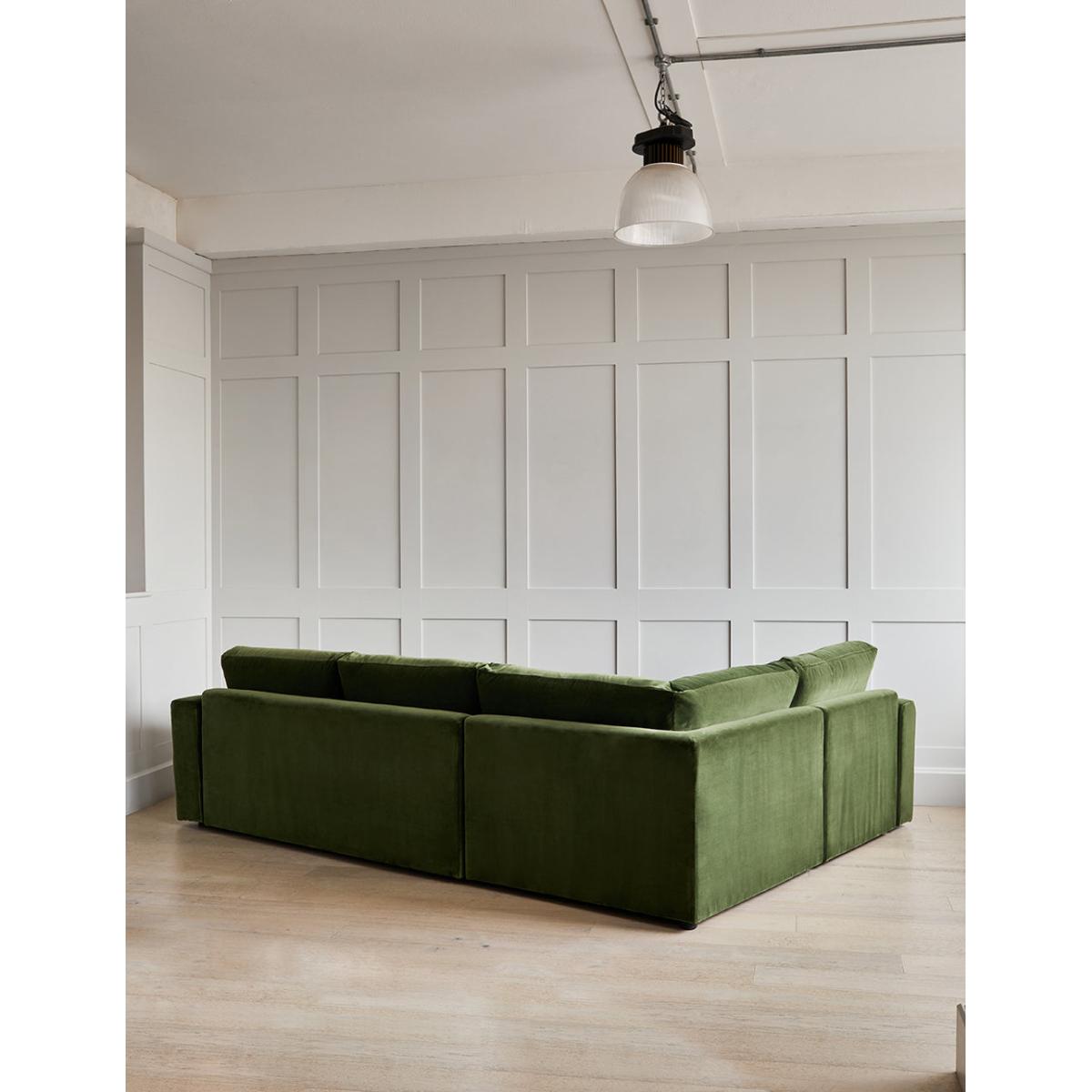Meet our Rowan Corner Sofa. This super soft and plump L shape sofa is our largest family sofa yet. The Rowan is a roomy 4-seater sofa with plenty of space for more people to snuggle up at the end of a long day. With ultra-deep fibre filled cushions for maximum comfort, there’s room for the whole family. The Rowan Corner Sofa is low to the ground and boasts a beautiful panelling detail on the arms that elevates this contemporary sofa to a unique statement piece of furniture. Choose between a right-hand facing sofa or a left-hand facing sofa to suit the shape of your home and style this contemporary sofa. Photographed here as a left hand facing in Vintage Green Velvet. The leg colour in the product image is Black. We recommend you order a free fabric swatch to see your chosen material up close before ordering your sofa.