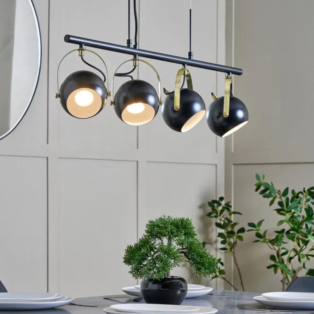Transform family dinners with the Rowan Eyeball Diner Ceiling Pendant in Black. Featuring a chic black finish and brass accents, this stylish pendant bar offers seamless pairing with monochromatic homes and becomes the focal point of any room. This light fitting boasts optimal illumination with the four adjustable spotlight heads, allowing you to choose the direction of light to your preference.