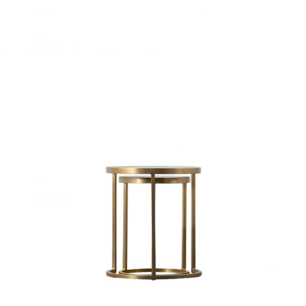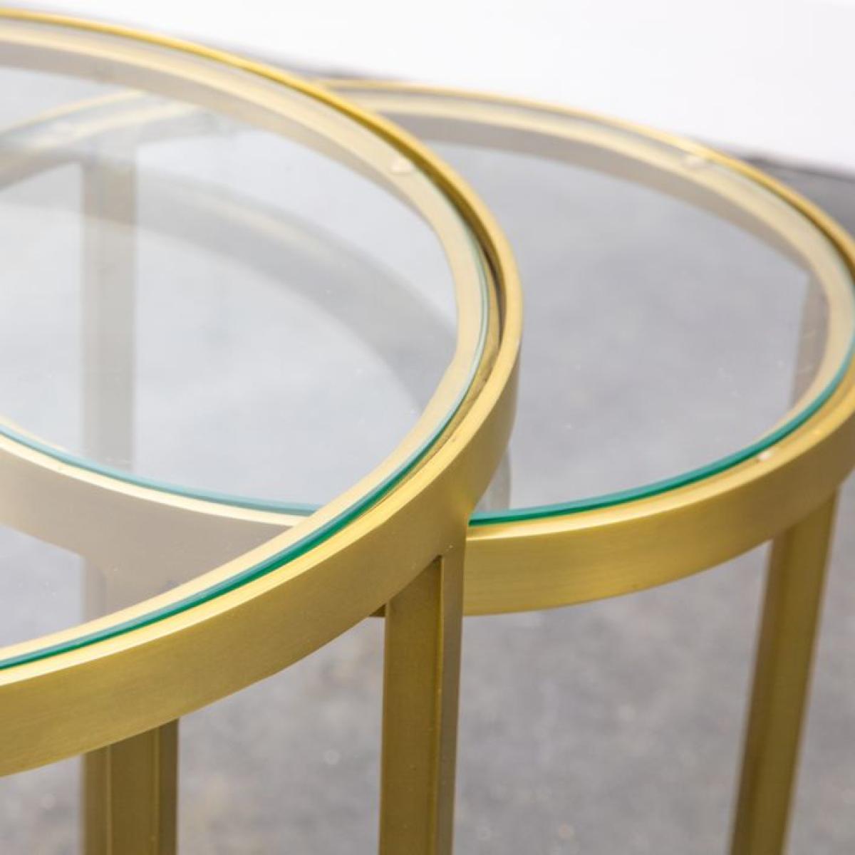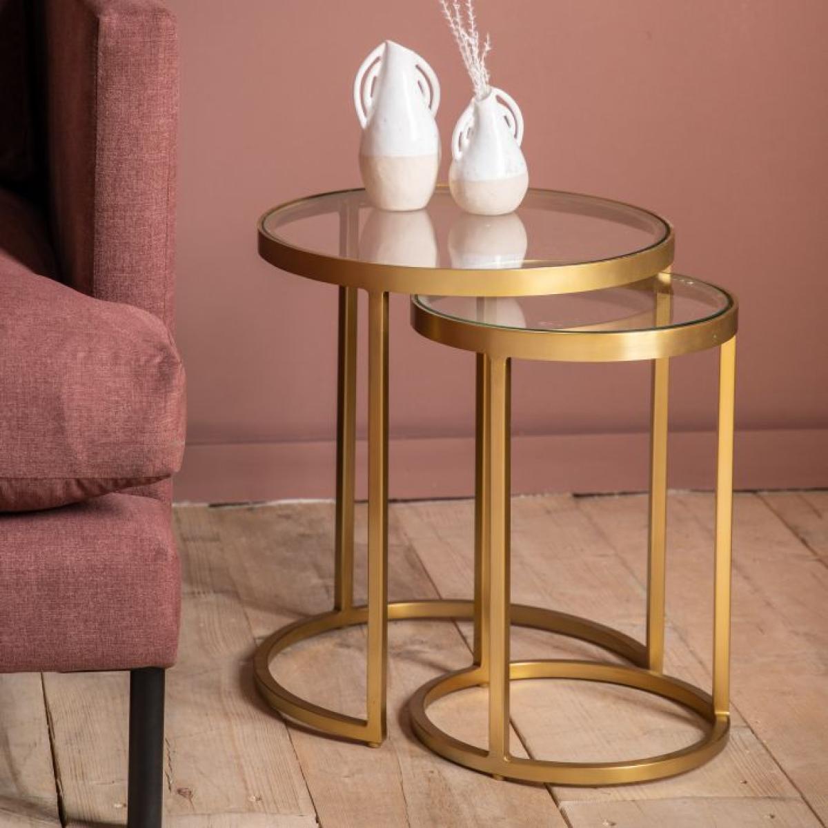 Nest of two tables ideal for adding a touch of glamour to a room. They pair metal frames with a lovely gold finish and glass tops to give an elegant look. The tables are also available in silver.
