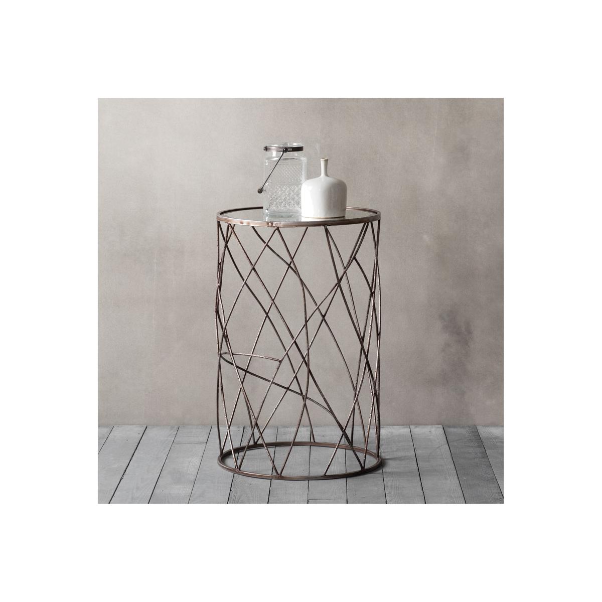 I love this small side table for its modern, sculptural appeal and versatile design. The combination of a glass top with twisted metal legs makes it a stylish statement piece that can work well in a variety of interiors, from industrial to contemporary or minimalist spaces. Its open, airy structure adds visual interest without feeling bulky, making it perfect for smaller spaces or as a complement to larger statement furniture. Practical styling tips include layering it with contemporary vases, books, or decorative objects to enhance its architectural qualities. Its transparency and intricate metalwork lend themselves to a minimalist aesthetic, but it can also serve as a striking contrast in more eclectic or textured environments.