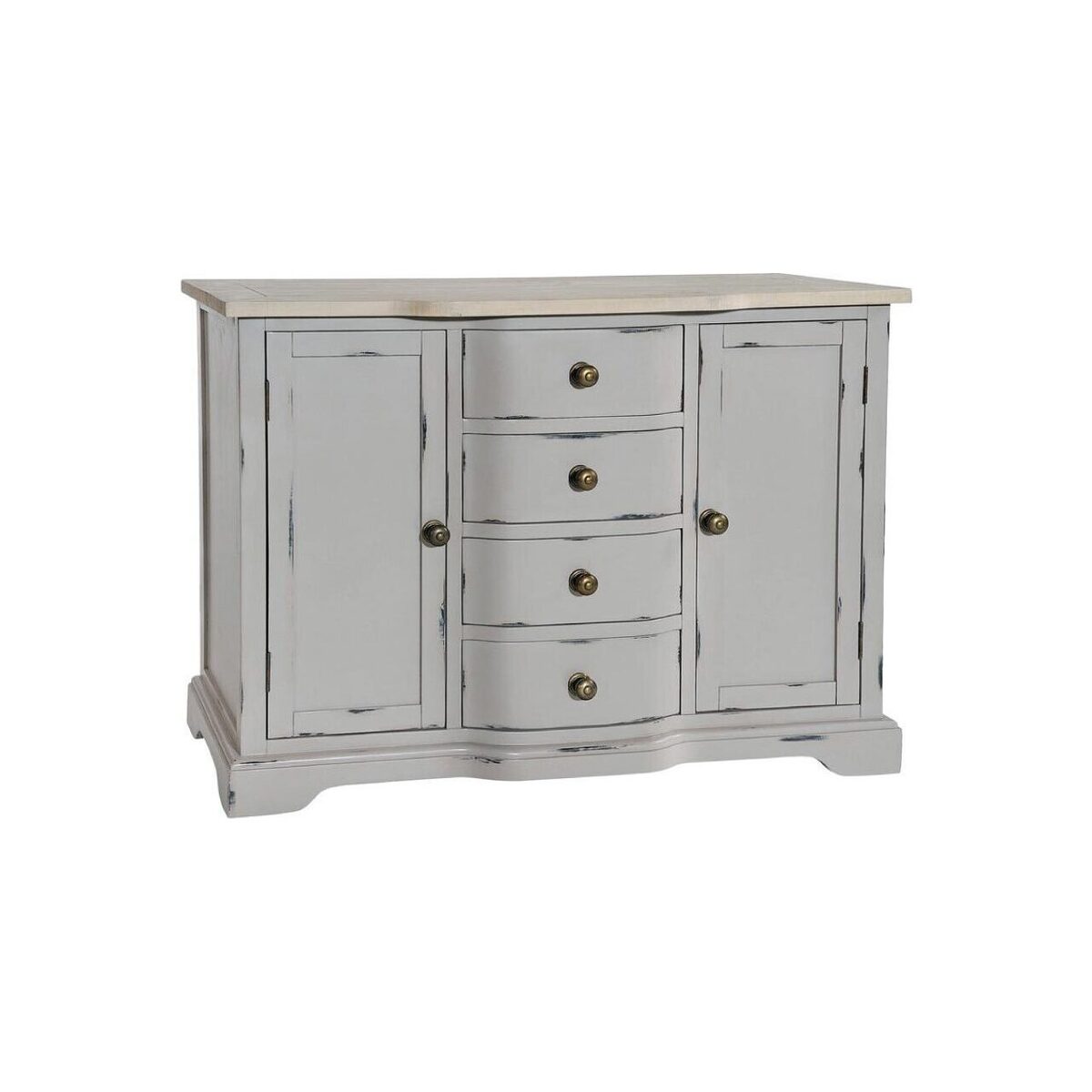 Small Sideboard. Finish: Distressed Painted Limed Top. Material: Grey distressed painted new pine with lime wash tint surface.