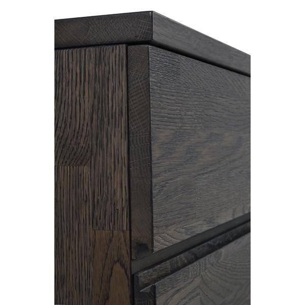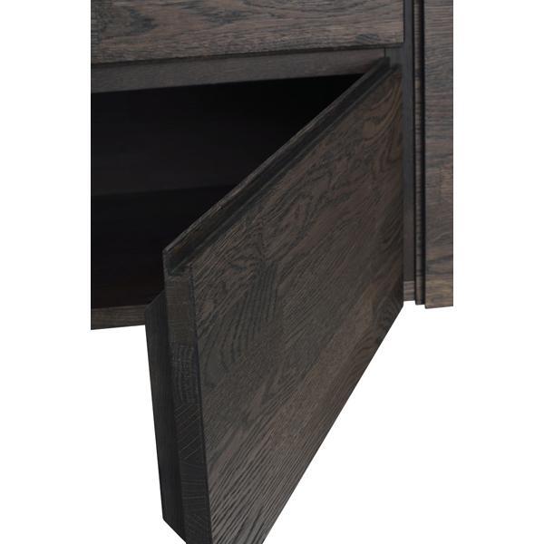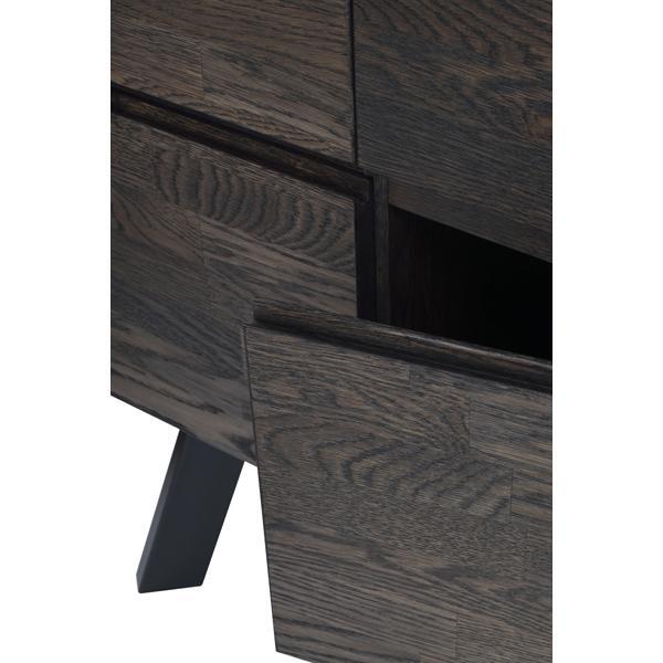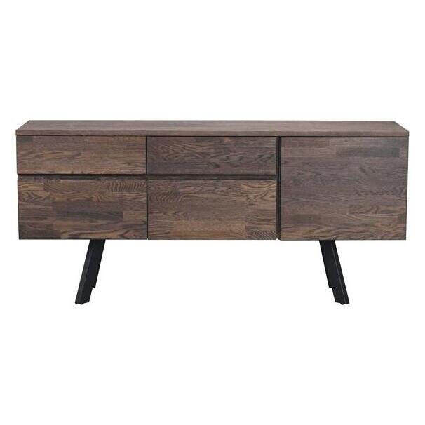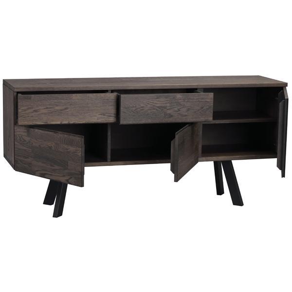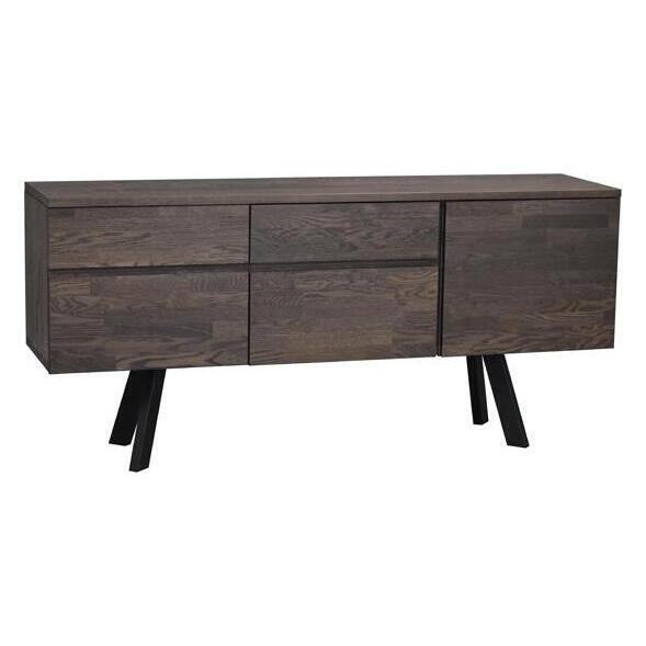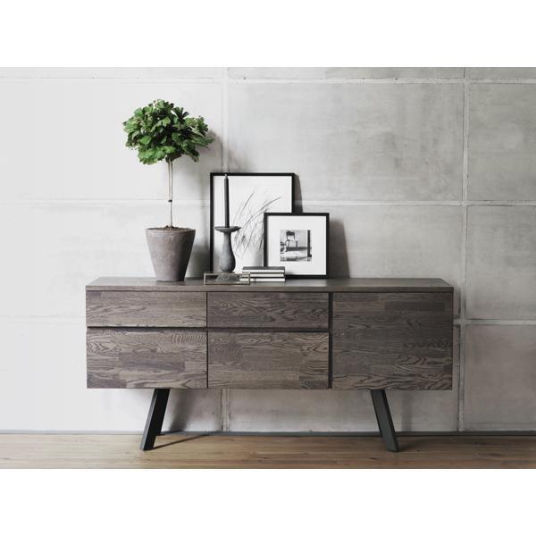 Sideboard in smoke coloured oak. Steel legs in powder coated black metal. Plenty of storage space with both drawers and hatches with removable shelves. The sideboard is part of our Fred Collection.