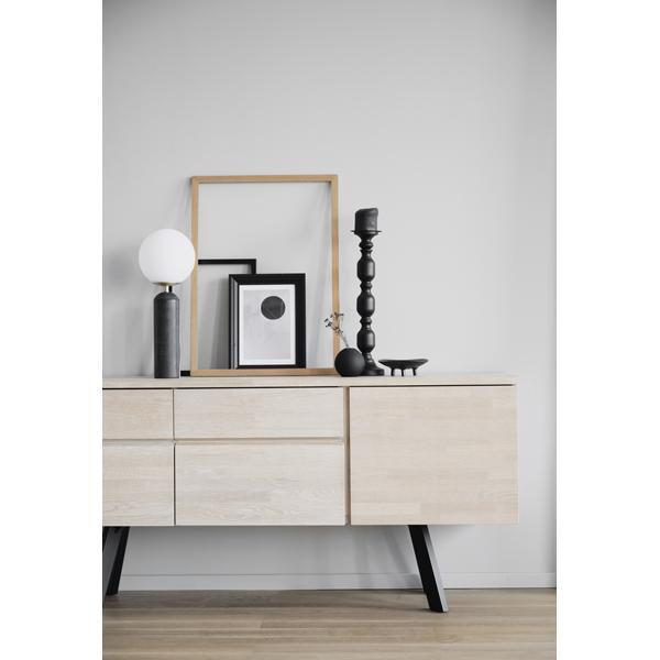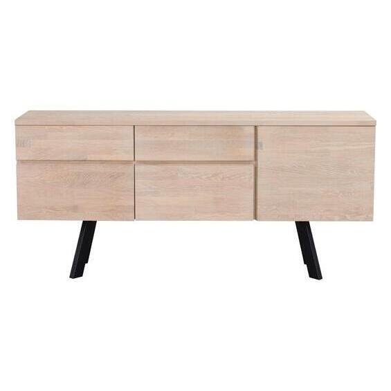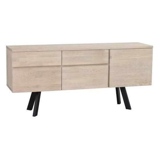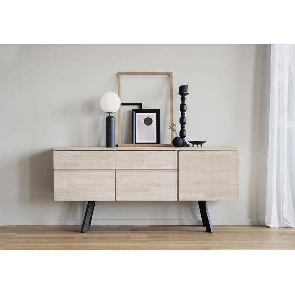 Sideboard in white pigmented coloured oak. Steel legs in powder coated black metal. Plenty of storage space with both drawers and hatches with removable shelves. The sideboard is part of our Fred Collection.