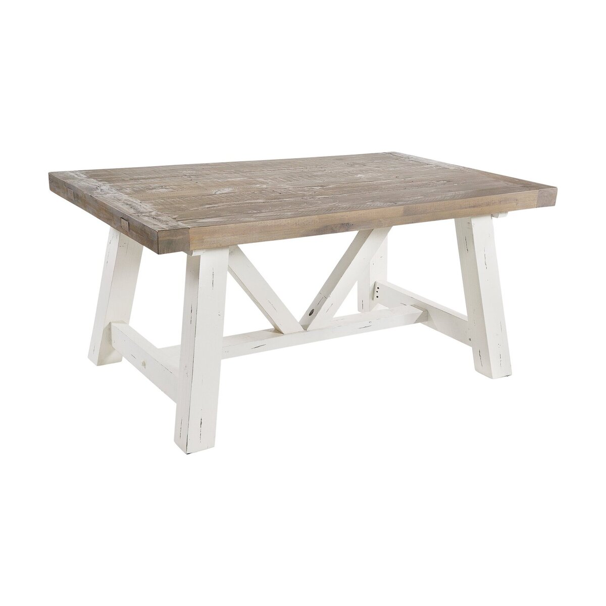 Extending Dining Table. Finish: Driftwood with Off White Distressed Painted Base. Material: Reclaimed Pine .