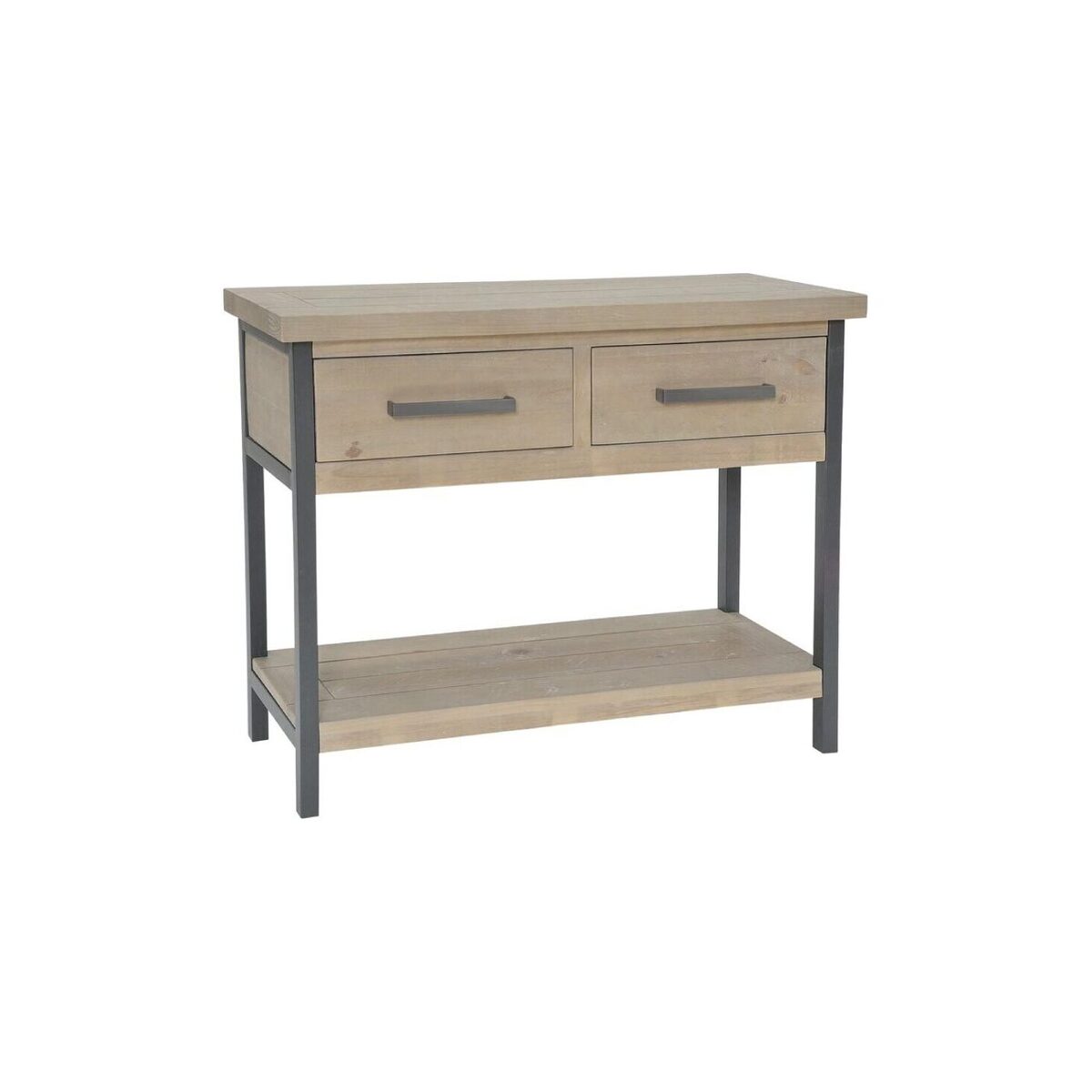 Console table. Finish: Pine Driftwood. Material: Powder coated steel & semi rough sawn new pine with grey wash tint.