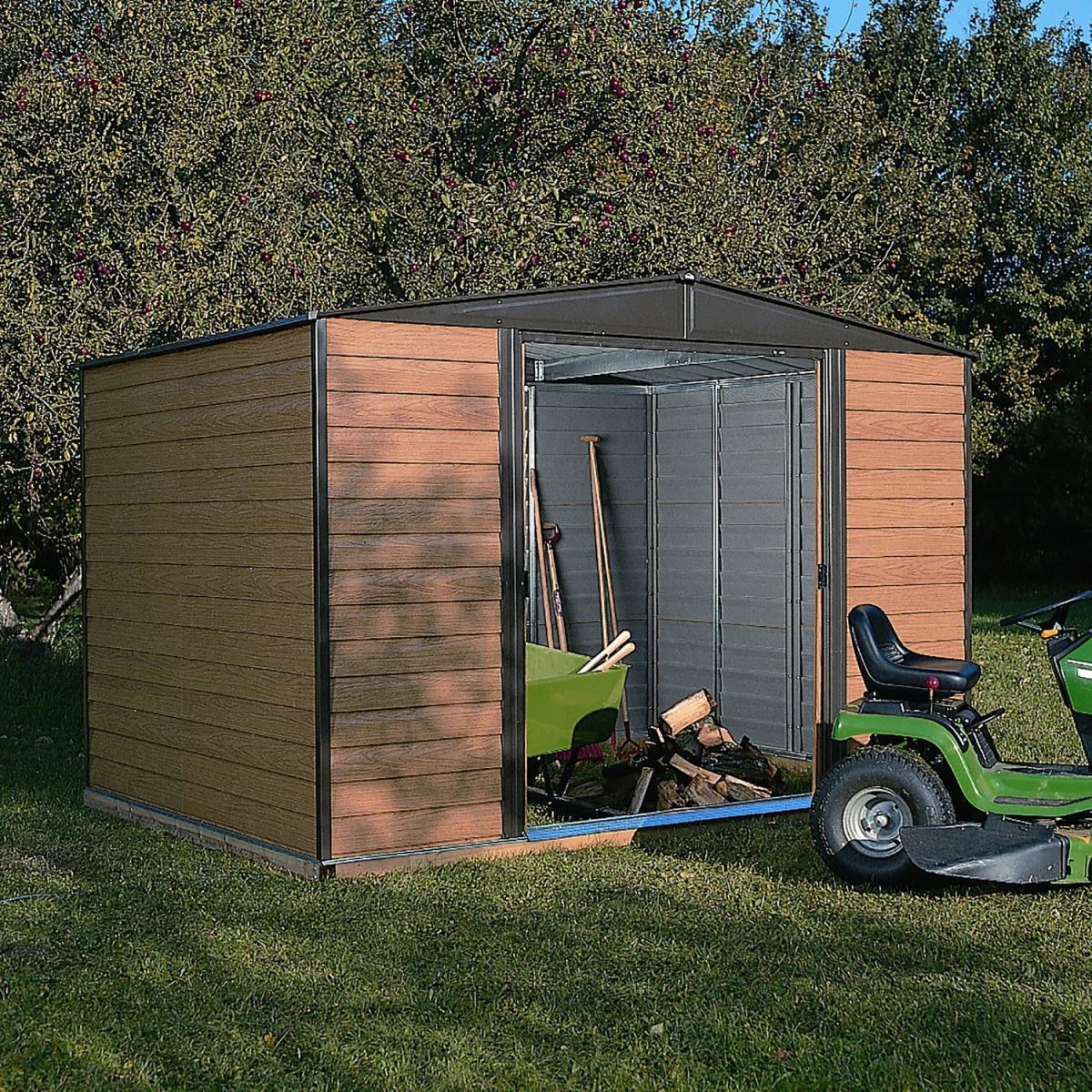 Dimensions H209cm x W313cm x D181cm Please note We are unable to deliver to Ireland The Woodvale 10x6 metal shed is the perfect storage solution for your outdoor storage needs The product is lockable and fire and rot resistant and comes pre-painted in wood grain effect panels and coffee trim. Features. Attractive wood grain shiplap-look wall panels. Coffee coloured trim. Double lockable sliding doors. Large door opening for easy access. Lockable (padlock not supplied)Pre-painted. Fire and rot resistant Floor not included. Door fitted on 10’ slide only. Assembly required.
