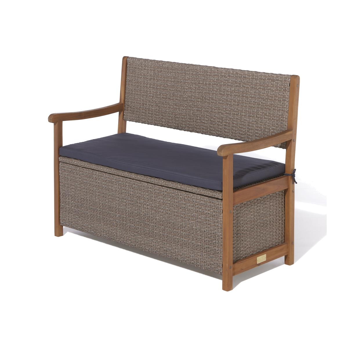 The Rowlinson Alderley Rattan Storage Bench cleverly combines outdoor seating with storage. The Alderley Storage Bench is constructed from weatherproof rattan effect weave around a sturdy hardwood timber frame that is also pre-painted in a factory stain with lacquer finish. The large under-seat storage compartment is accessed via the lift up seat and has an approximate capacity of 150 litres, making this an attractive, yet functional place to sit and enjoy your garden. Supplied in a natural weave coloured rattan with light grey seat pad.