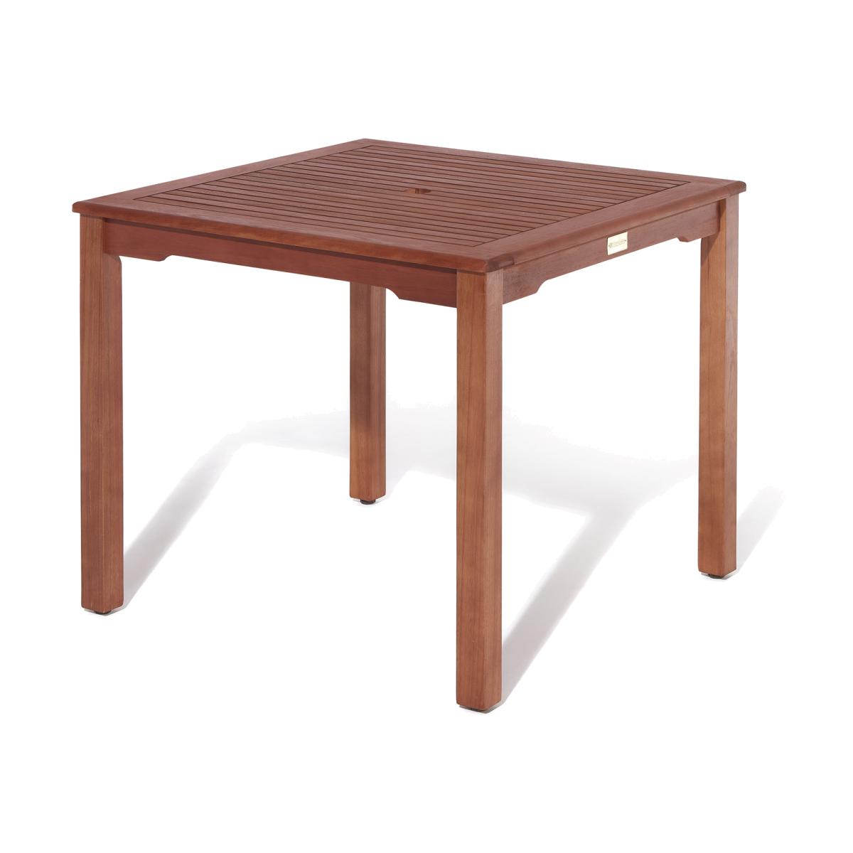 he Rowlinson Willington Square Table is an attractive hardwood furniture table ideal for al fresco dining. The table has attractive rounded corners and features a useful 50mm parasol hole through the table, allowing you to create an area of cooling shade over the set by introducing a parasol. Finished in a factory applied stain and constructed from durable Eucalyptus hardwood. Rowlinson Willington Hardwood Square Table 90cm - Brown