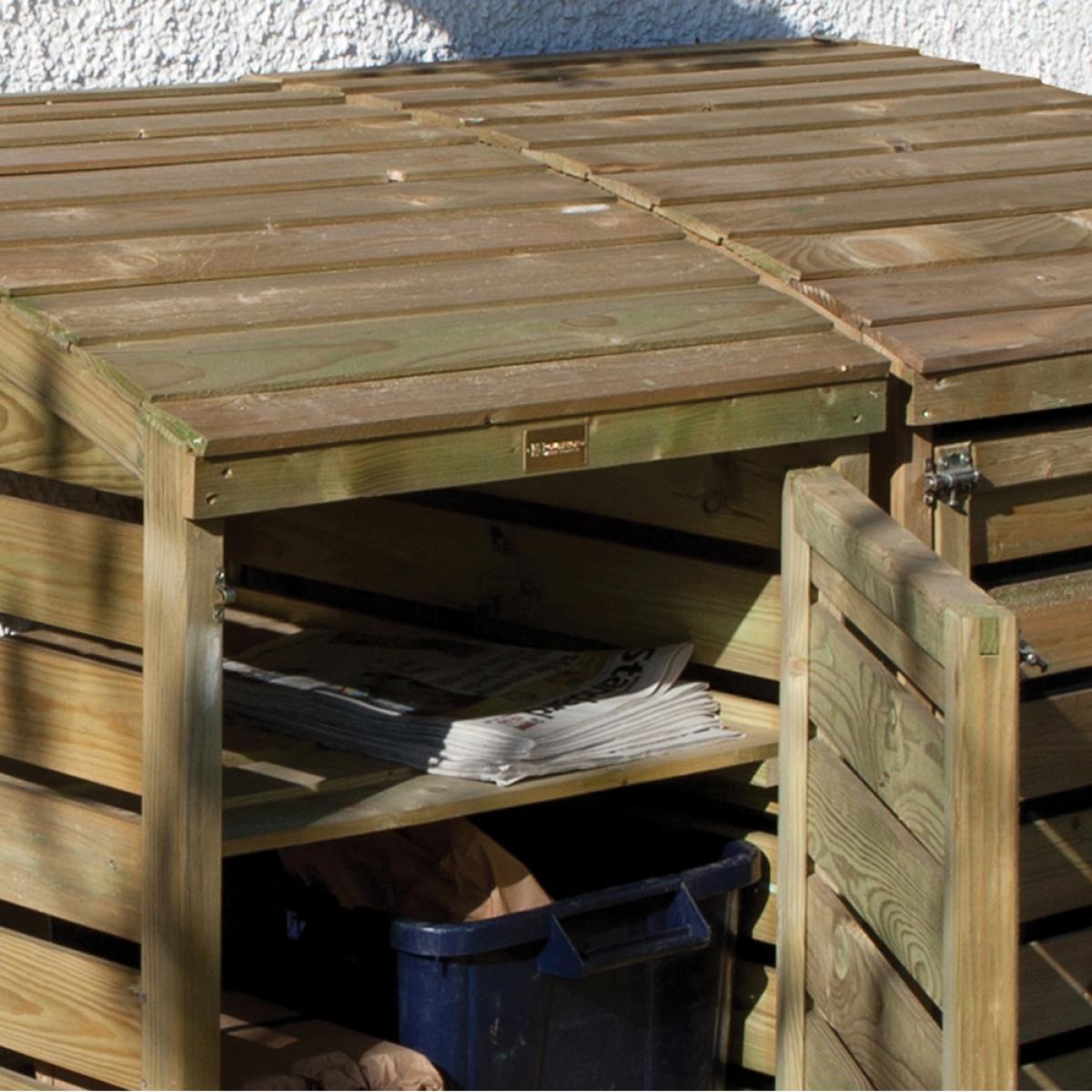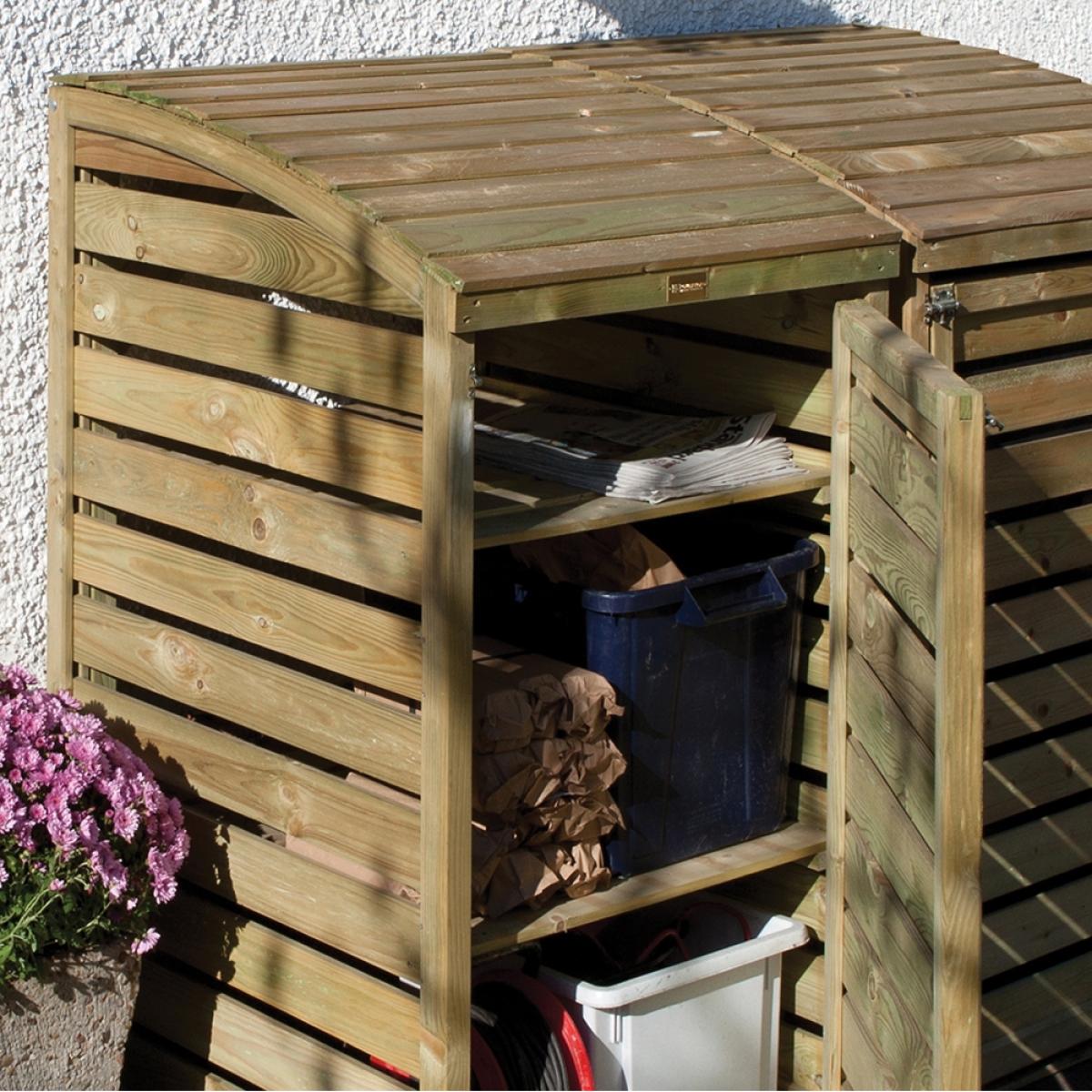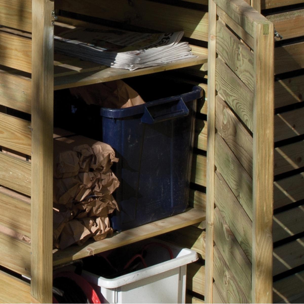 Safely stow your bins with the Wooden Recycling Box Store from Rowlinson. Manufactured from responsibly sourced timber, the unit features a lifting lid for easy access to your bins. Complete with adjustable shelves, different sized boxes can be accommodated. The natural wood comes pressure treated prolonging the life or your store and with the option to paint or stain, why not add a little colour to the garden! Assemble your storage shed outside on the patio and keep unsightly plastic bins safely housed and prevent unwanted pests from rummaging through your bottles and tins! When bin day comes around, simply remove your boxes ready for collection!.