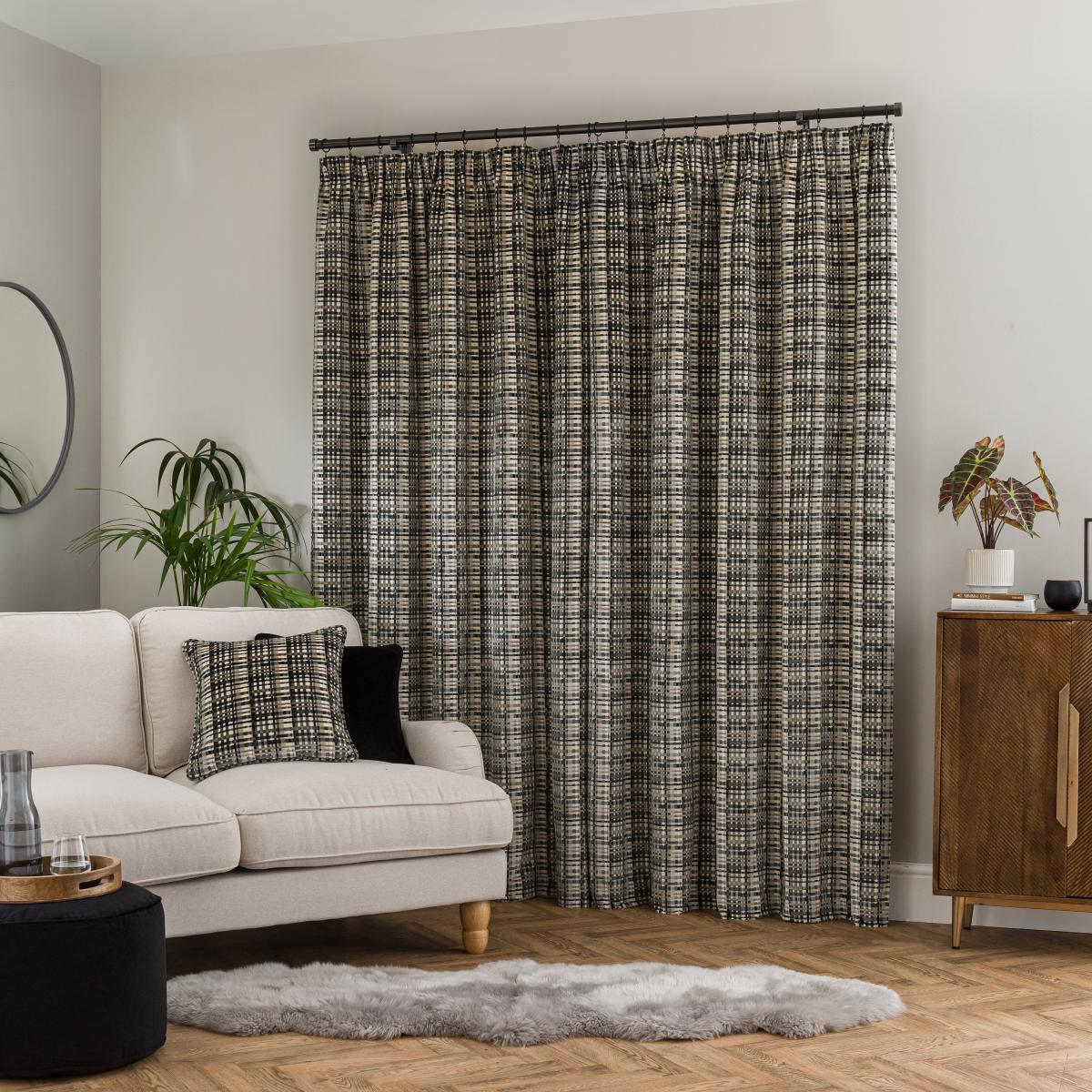 * Luxurious cut velvet finish* Geometric checked design* Choice of colours and sizes* Classic pencil pleat header* Coordinating cushion available The Roxana curtains feature a luxurious cut velvet design and a geometric, checked pattern - ideal for contemporary or country interiors alike. The recycled polyester fabric is fully lined and has a pencil pleat header for a beautiful drape. Available in a range of colours and sizes, these curtains also have a matching cushion available for a cohesive look. Please note: These curtains are sold as a pair. Once these curtains have been gathered, refunds or exchange cannot be given unless on faulty merchandise.
