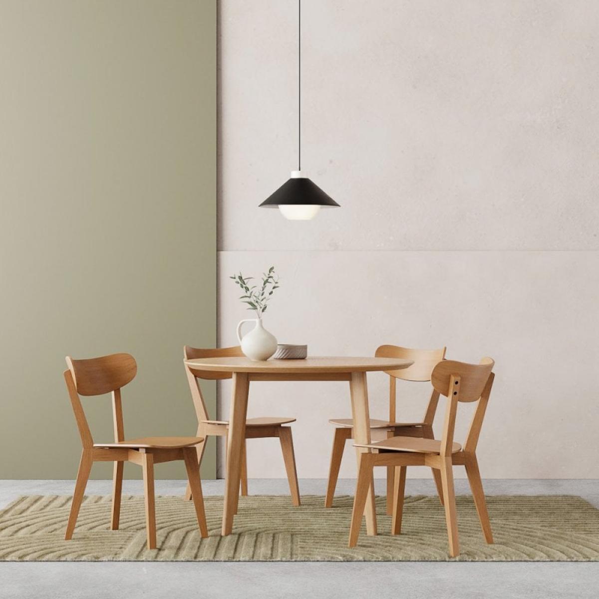 I love the Roxby 4 Chairs Round Table Dining Set because of its timeless oak finish, which brings warmth and flexibility to various interior styles. It works particularly well in Scandi-inspired or minimalist spaces where natural materials and clean lines are key. Practical styling tips include adding colourful or textured placemats to create visual interest and using modern, understated light fixtures like the hanging lamp in the image to keep the look fresh. This set also offers versatility, making it suitable for both casual family meals and more formal dining scenes - a real classic that adapts beautifully to different interiors.