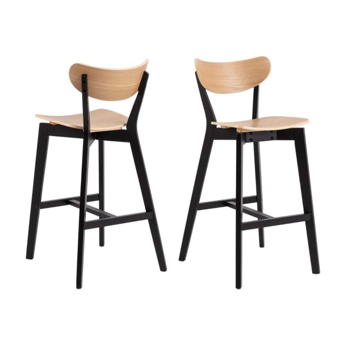 Elevate your home with our stylish bar stools, featuring a lustrous oak veneer and a matte black rubberwood base. These stools are sold in pairs, offering a seamless blend of durability and design for any modern interior.