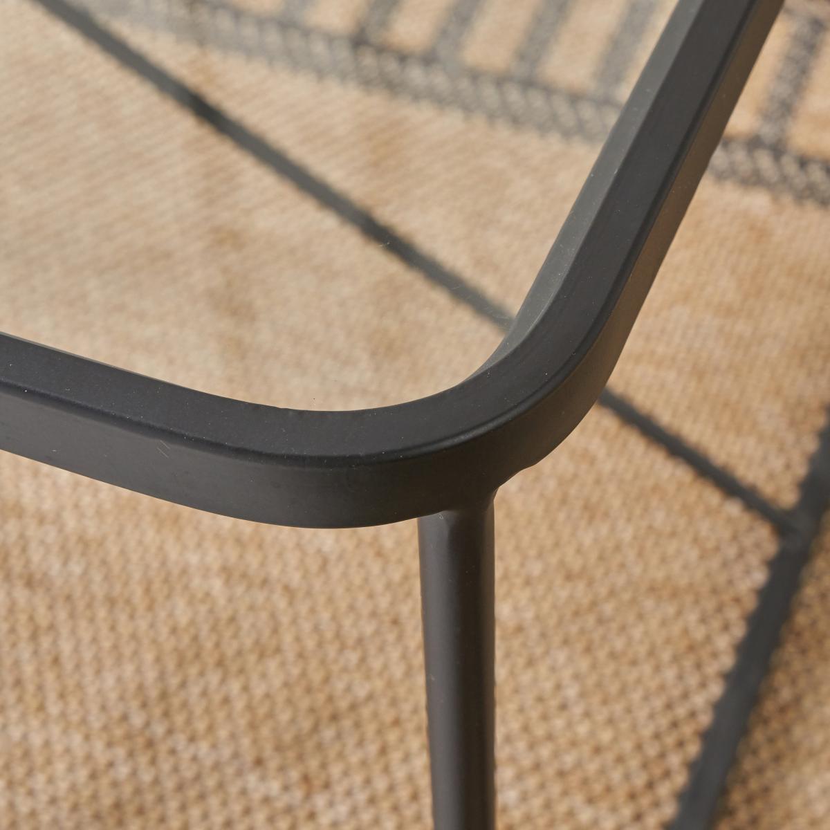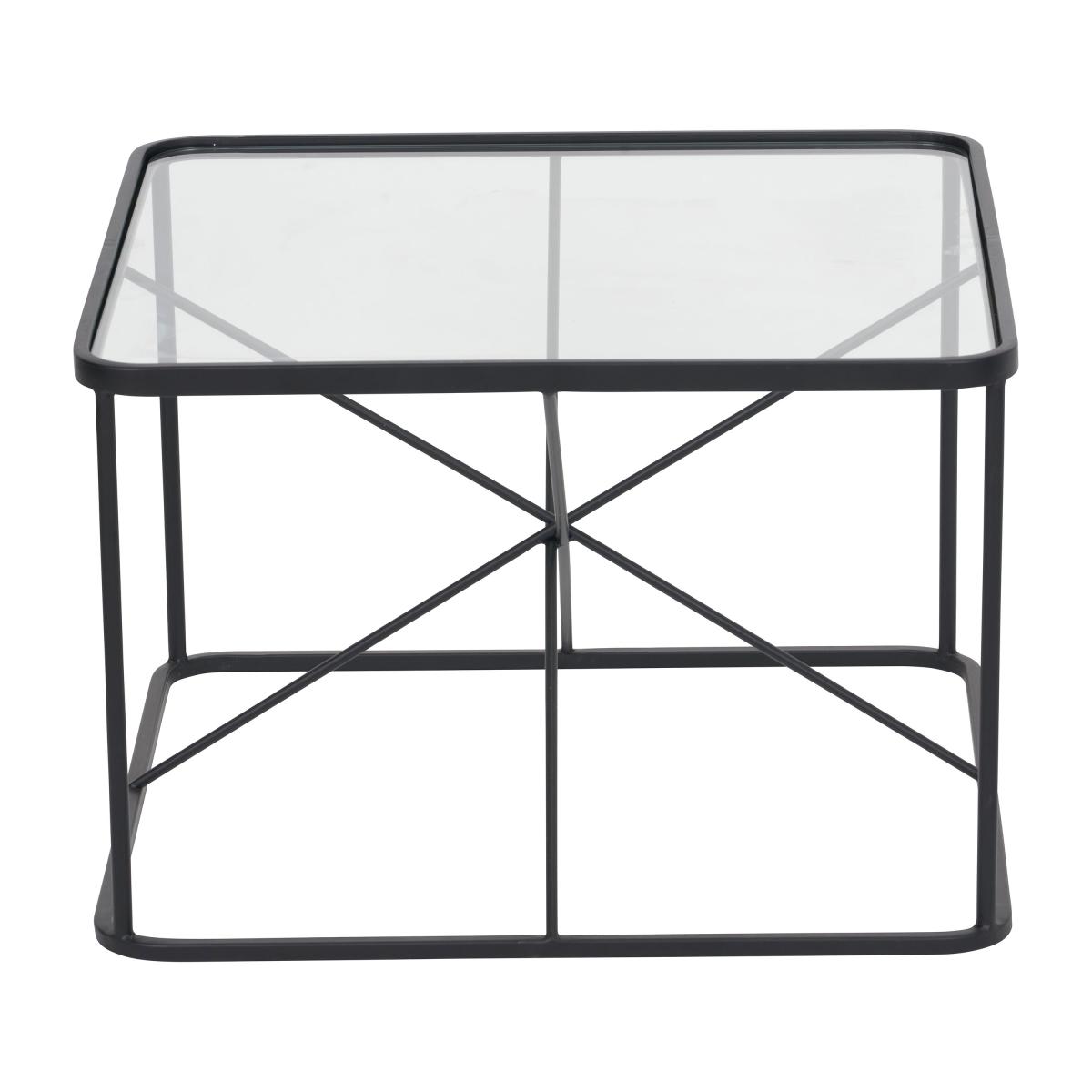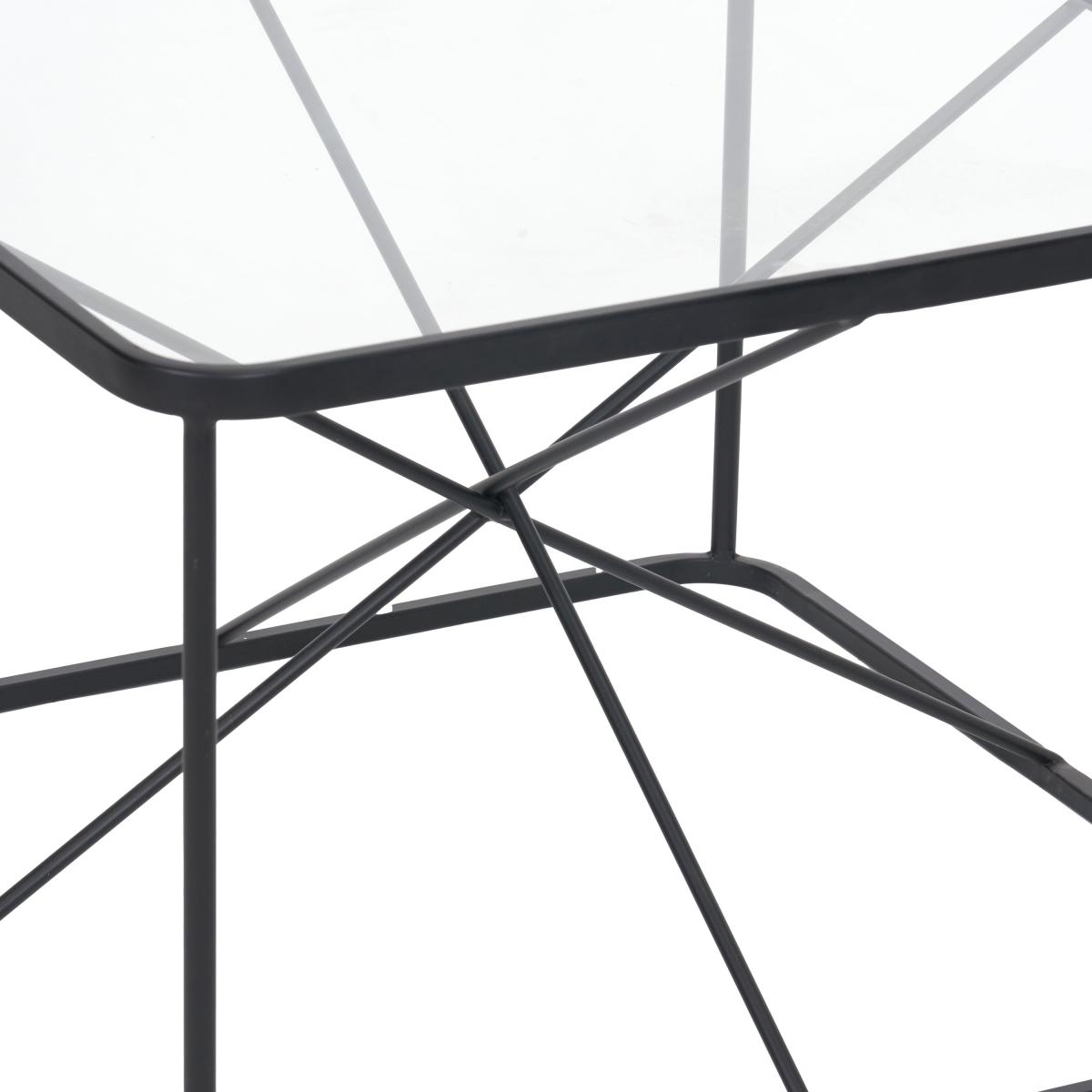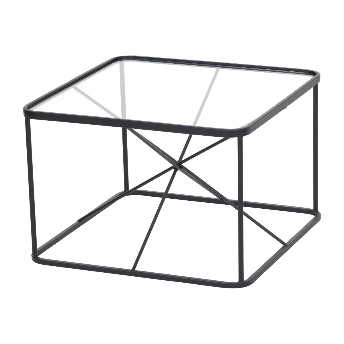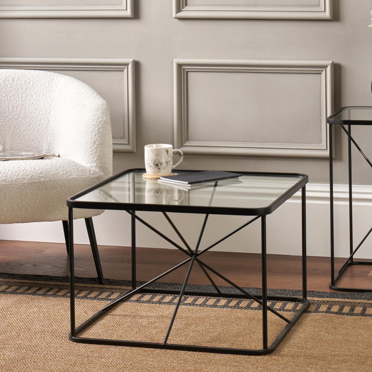 * Crossed black metal frame* Inset clear glass top* Curved corners This coffee table is a modern piece that combines practicality with contemporary design. The crossed black metal frame provides a sturdy and stylish foundation, while the inset clear glass top adds a touch of elegance. Its curved corners and sleek design make it a perfect centerpiece for any living room, offering both functionality and aesthetic appeal.