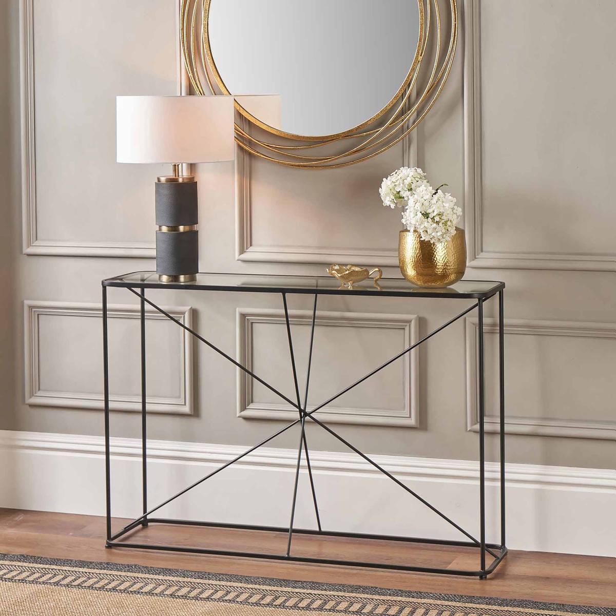 * Crossed black metal frame* Inset clear glass top* Curved corners This console table from the Roxy range features a star-like crossed black metal frame with an inset clear glass top, adding a contemporary touch to any hallway or living space. Its sleek and modern design ensures it blends seamlessly with any décor, while its practical features make it a valuable addition to your home.