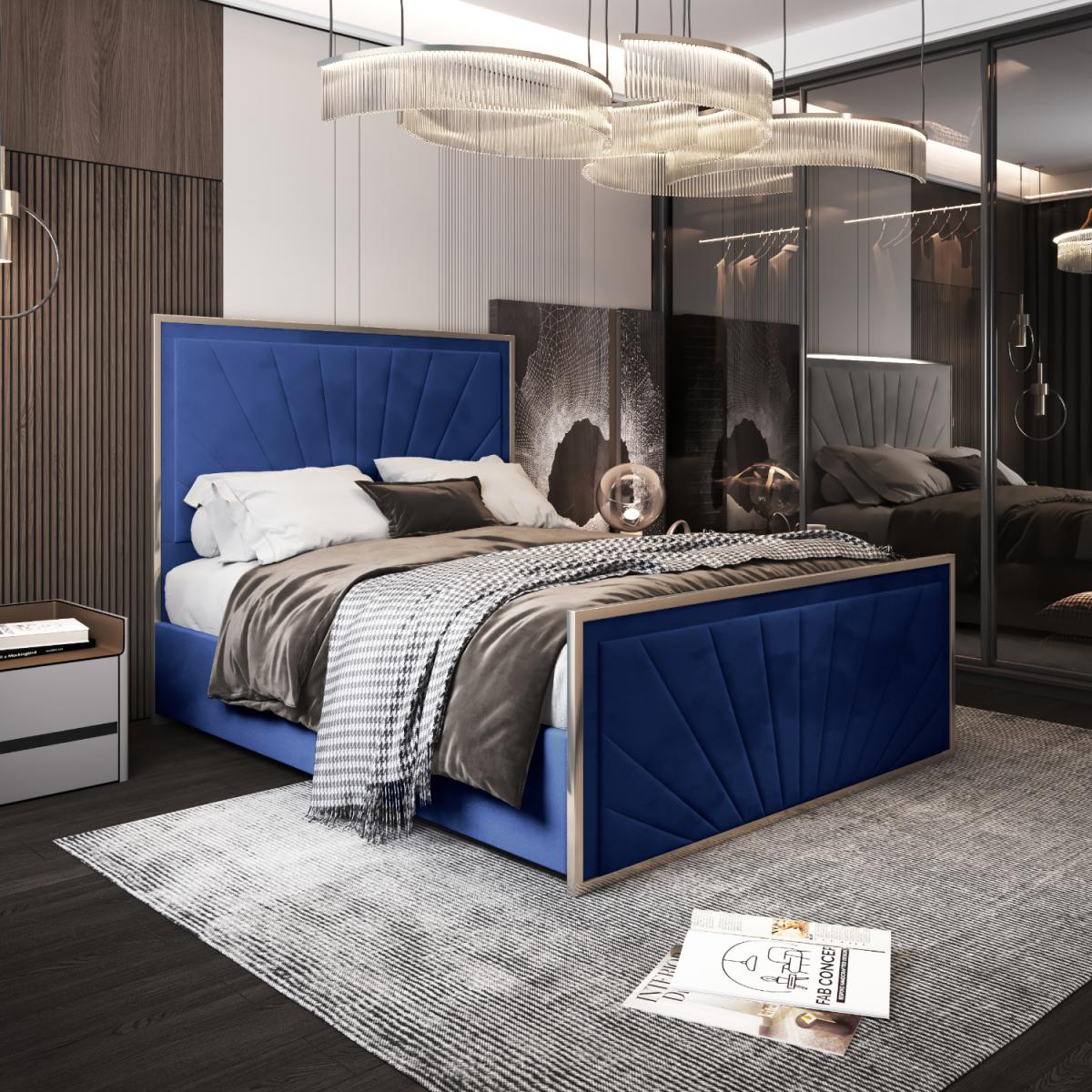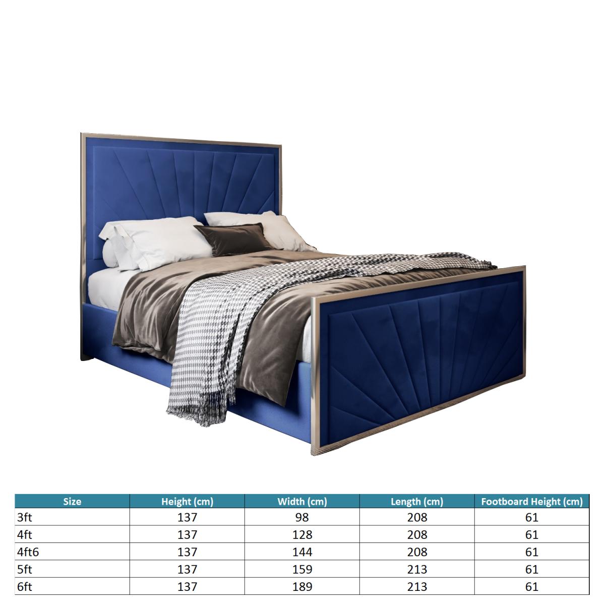 The Roxy metal fabric bed has a one inch narrow metal facing surround. A further two inch fabric surround which draws your attention wonderfully to the geometric modern upholstery design. The Roxy bed frame redefines bespoke by the level of customisation on offer. The upholstery design can be chosen, the metal colour can be changed, the fabric and colour is also personalisable. The Roxy features a strong metal facing around the headboard and foot which really accentuates the fabric upholstery. Make it truly your own signature piece with this stunning surround, making it look like a true work of art in a picture frame. All beds come with quality solid platform board base for robust and durable mattress support. All fittings on the bed are pre-fitted making the bed simple to assemble in two easy steps. It comes as standard with a sunrise chevron design as pictured.