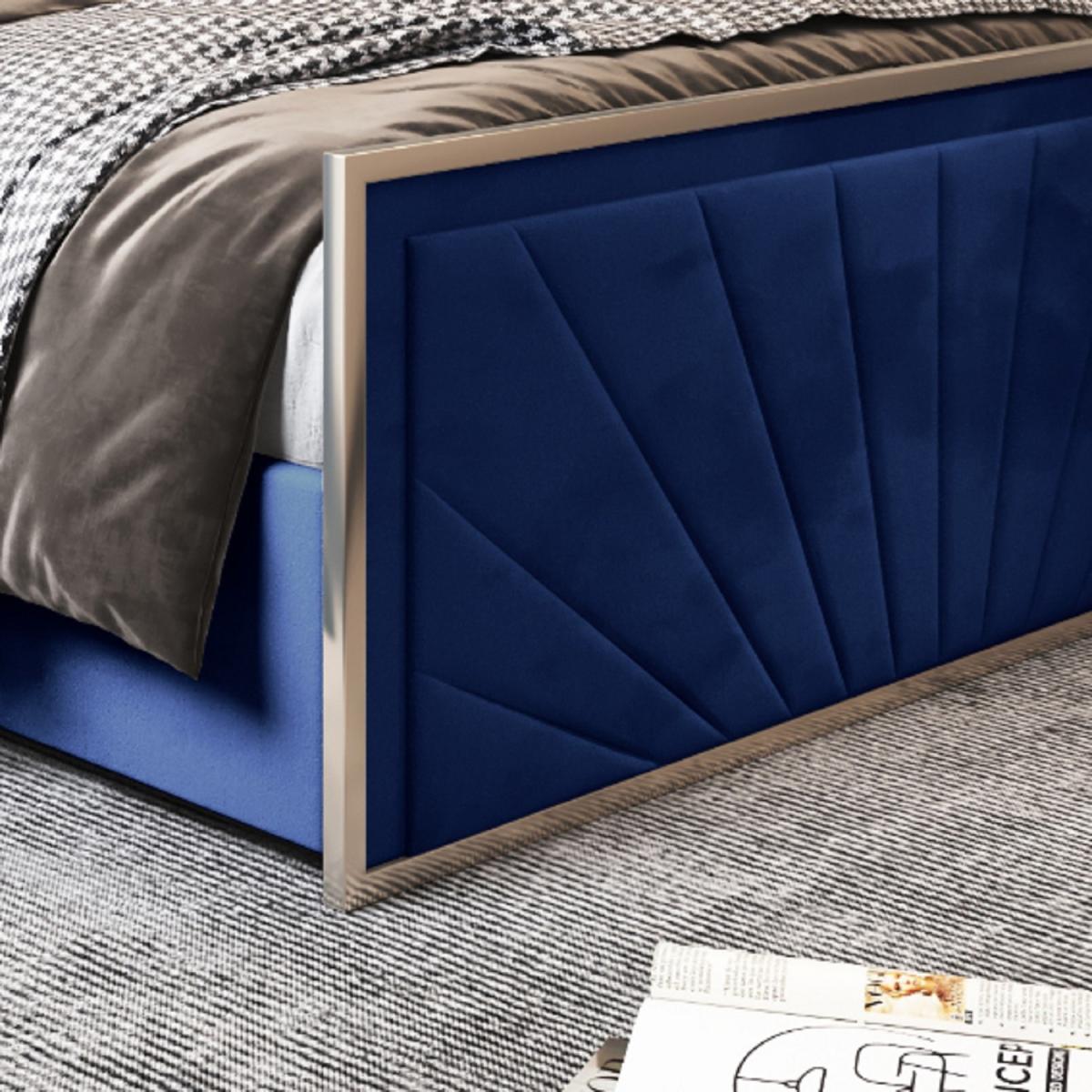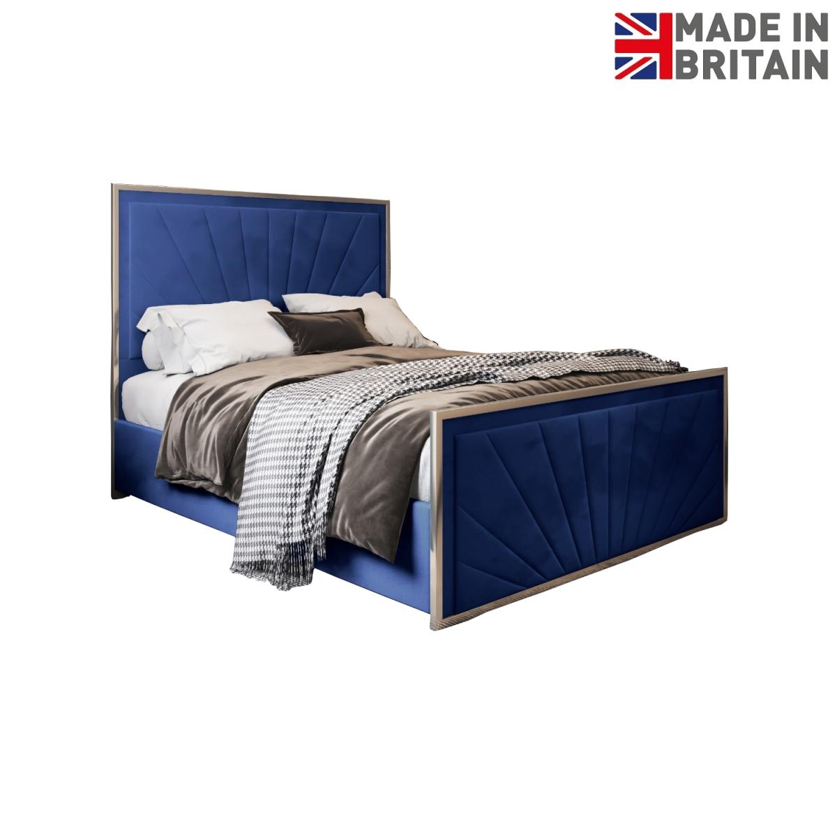 The Roxy metal fabric bed has a one inch narrow metal facing surround. A further two inch fabric surround which draws your attention wonderfully to the geometric modern upholstery design. The Roxy bed frame redefines bespoke by the level of customisation on offer. The upholstery design can be chosen, the metal colour can be changed, the fabric and colour is also personalisable. The Roxy features a strong metal facing around the headboard and foot which really accentuates the fabric upholstery. Make it truly your own signature piece with this stunning surround, making it look like a true work of art in a picture frame. All beds come with quality solid platform board base for robust and durable mattress support. All fittings on the bed are pre-fitted making the bed simple to assemble in two easy steps. It comes as standard with a sunrise chevron design as pictured.