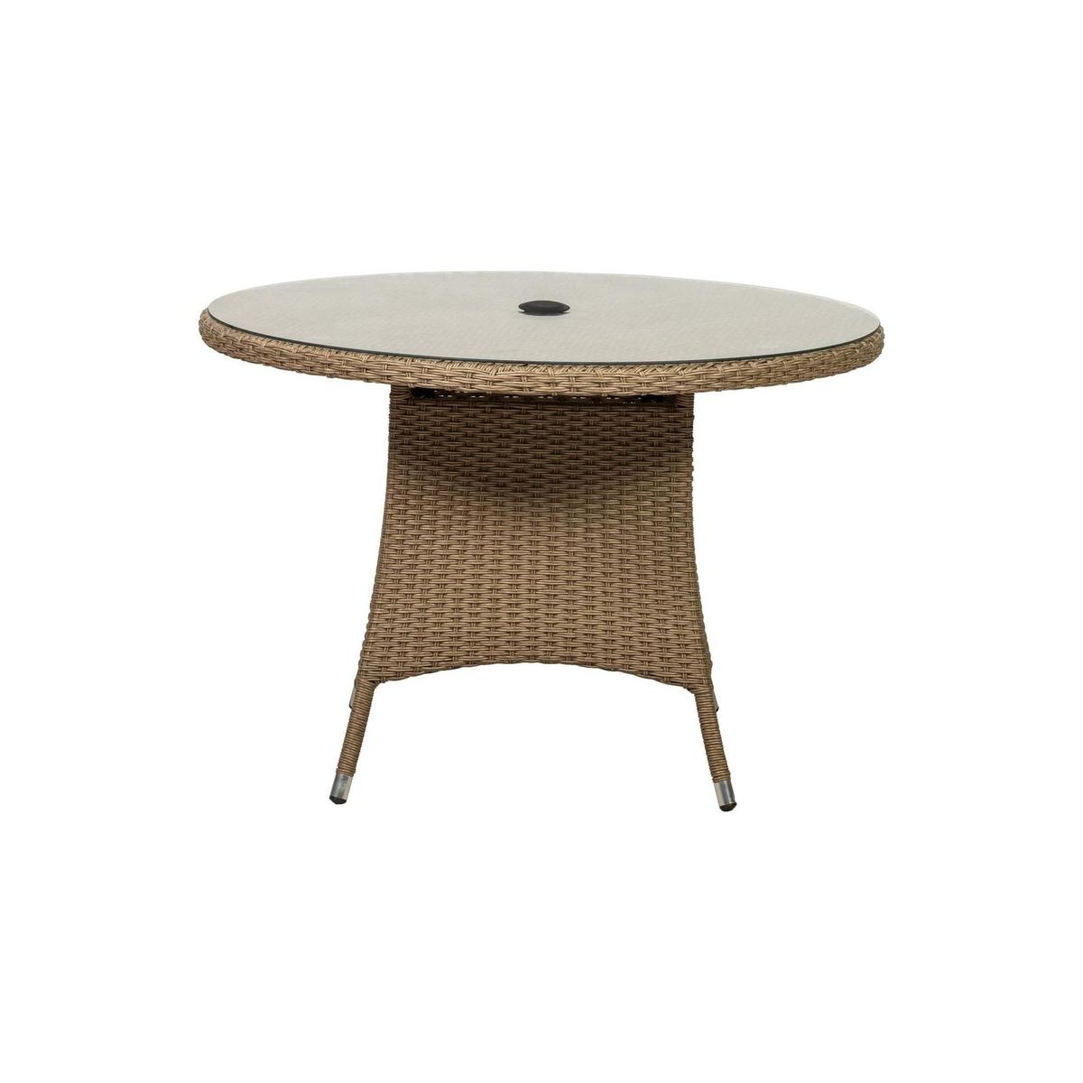 The Bali 110cm Round table is hand woven from brown polyrattan onto a strong aluminium frame, making it as stylish as it is robust. The table also features a parasol hole and a floating glass top ensuring the surface is sturdy and wipe-clean. Please note, unfortunately we cannot deliver this item to the Channel Islands.