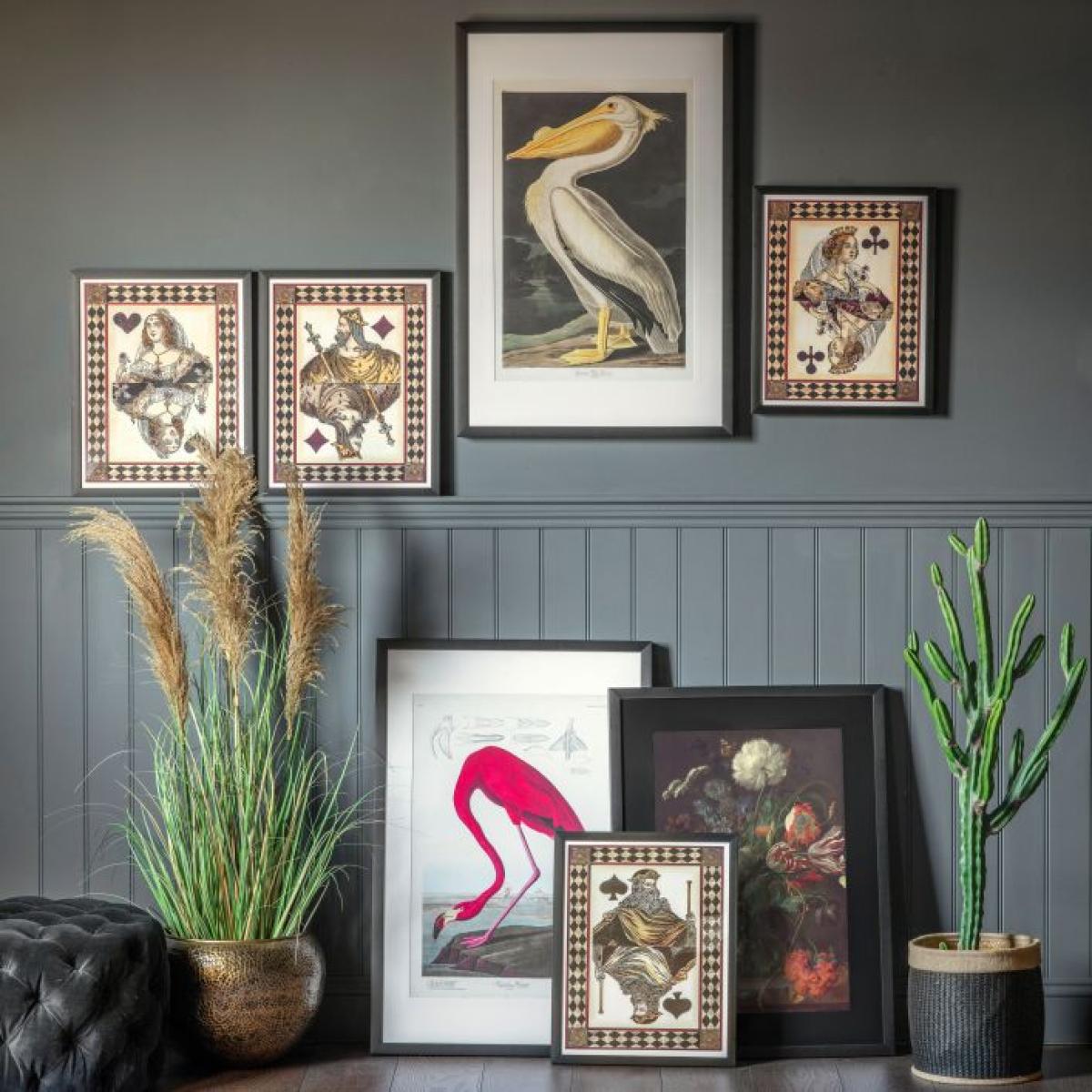 I really like this set of four because it combines a playful yet sophisticated vibe that can elevate various interior styles. It works particularly well in eclectic, modern, or classic interiors where a splash of personality is desired. The cardinal black framing provides a sharp contrast that helps the artwork stand out, making it ideal for placing above a mantelpiece, console table, or even in a gallery wall setting. For styling tips, consider pairing these with minimalised accessories or complementing with other monochrome pieces for a cohesive look. To make the most of the set, hang them at eye level with even spacing, and consider lighting that highlights their details to really draw focus and add visual interest to your space.