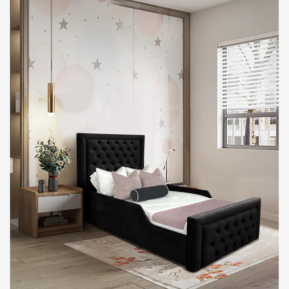 Royal Kids Bed Gaslift Ottoman Plush Velvet with Safety Siderails - Black / Single