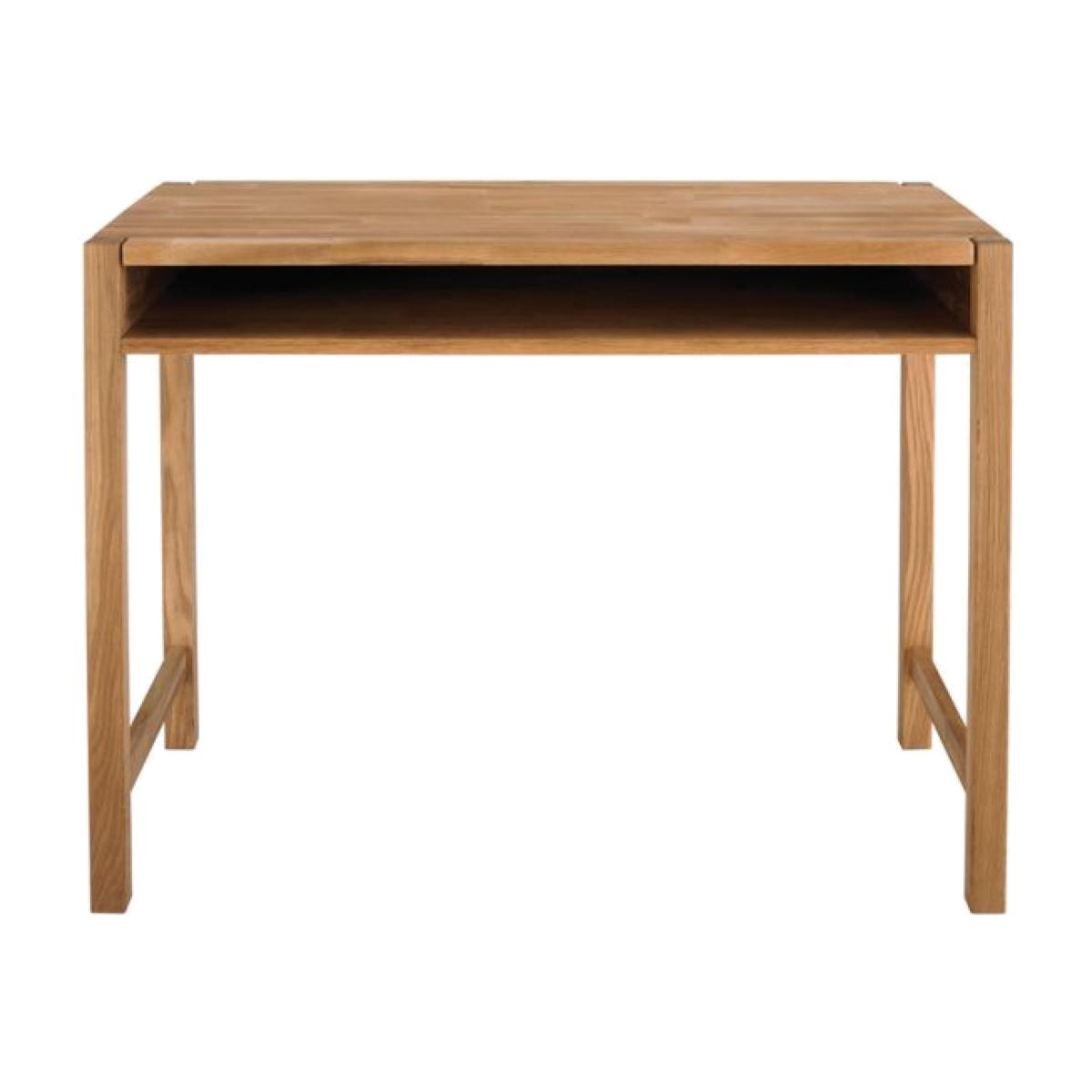 I’m a fan of this oak desk for its simple lines and warm timber tone - it slots straight into Scandinavian, minimalist or contemporary schemes without overwhelming the space. The modest under-surface shelf is ideal for stashing your laptop or a few notebooks, so your desktop can stay clear for work or styling. To keep it looking sharp, pair it with a slim-profile desk lamp, a small pot plant and a neat stationery tray in complementary colours (think muted greens or soft greys). If you need extra storage, hang a slim wall shelf above in the same wood finish, or add a slimline peg rail for notebooks and scissors.