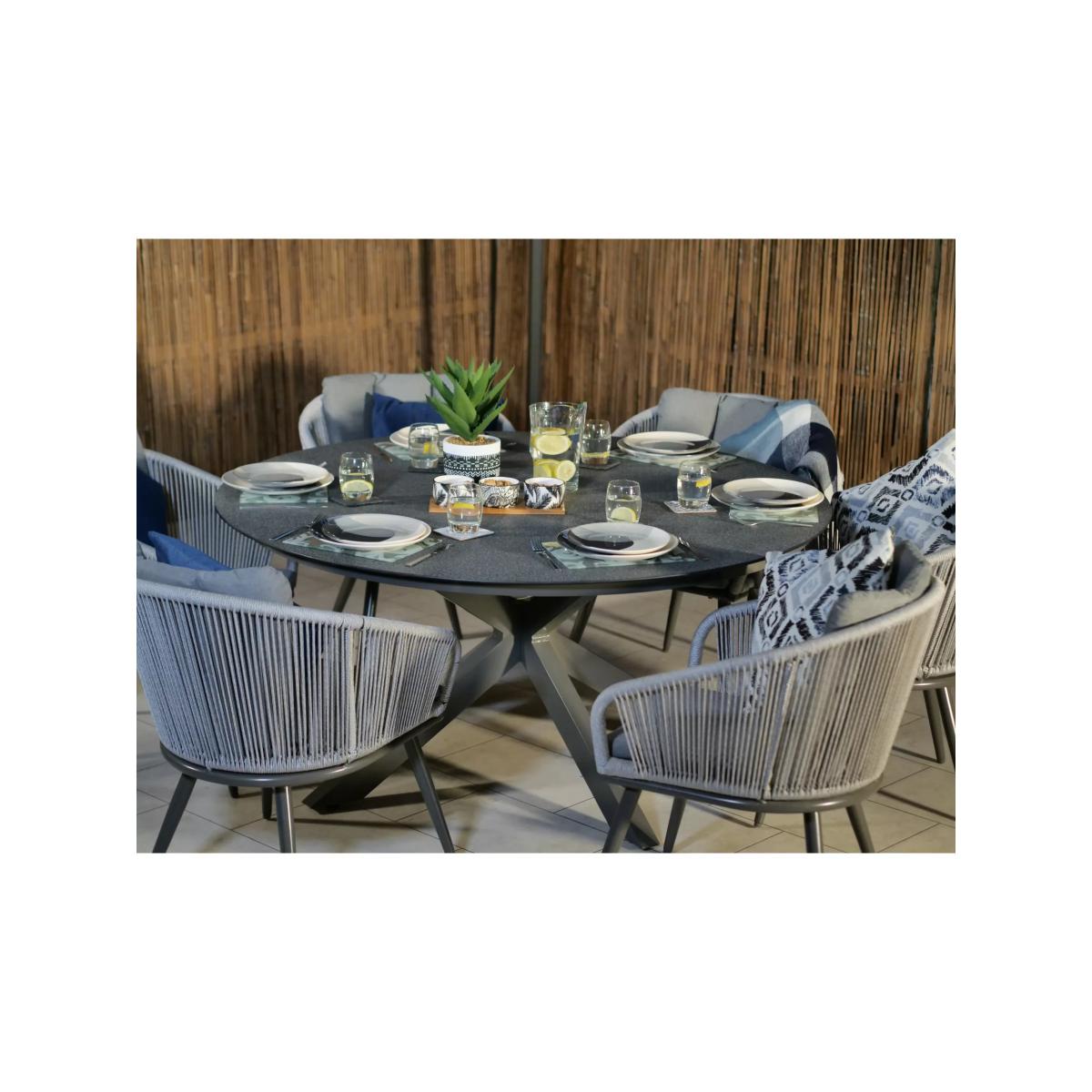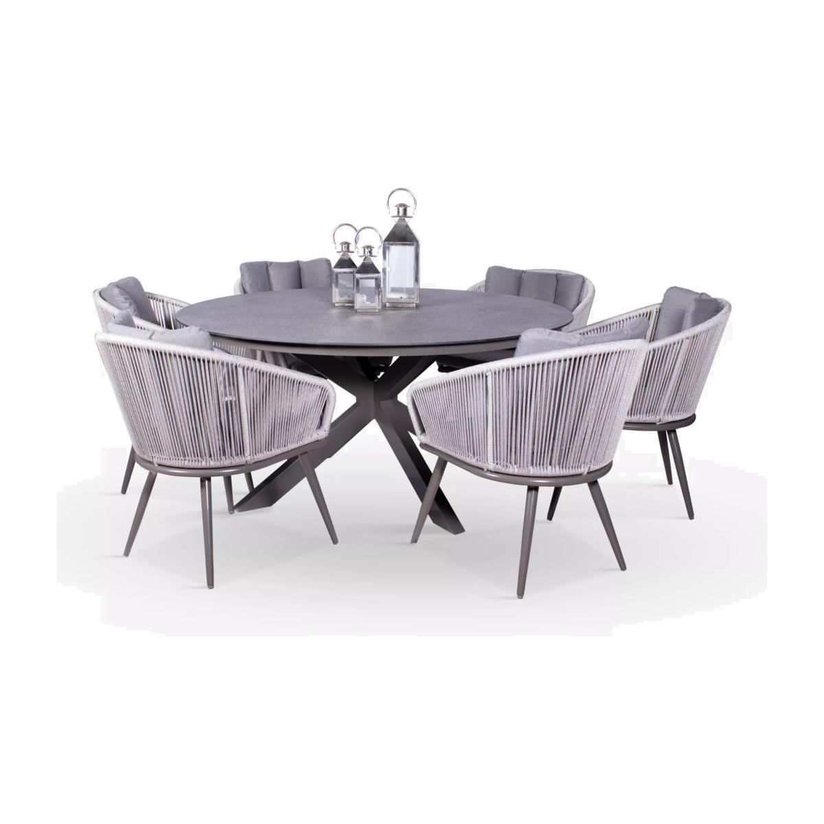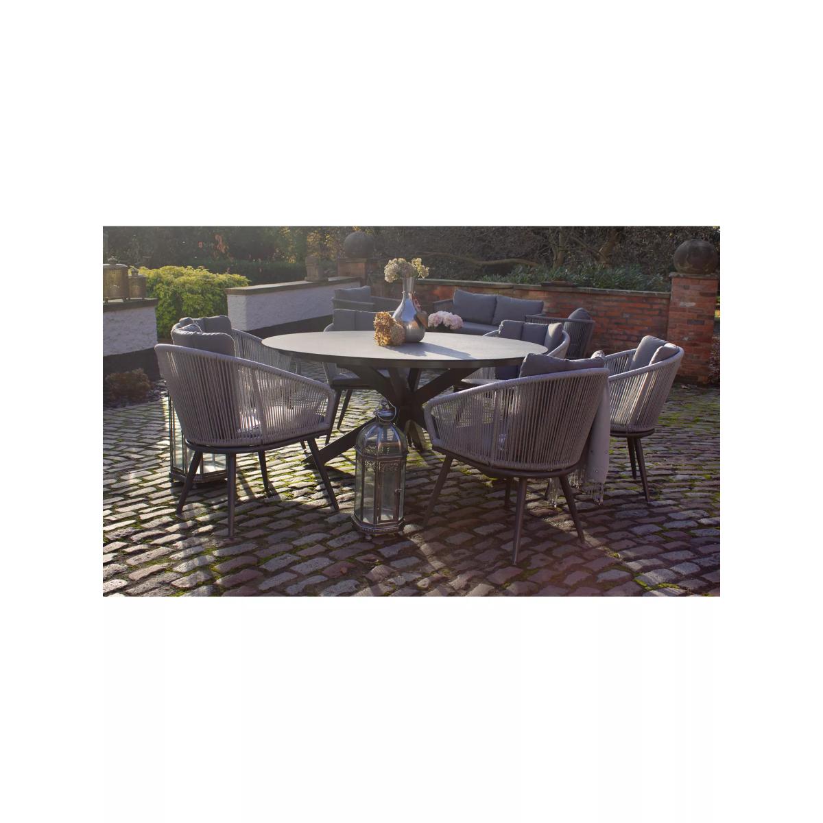 A contemporary design, this Aspen dining set from Royalcraft seats up to six people comfortably in the garden or conservatory. The set includes six dining armchairs with weather-resistant rattan-style rope weaves, hand-woven on powder-coated aluminium frames. The round powder-coated aluminium dining table has a glass spray stone top. Seating cushions and backrest cushions ensure comfortable support. Make sure you bring in the cushions, which are resistant to light rain showers only. Key features: 6 hand-woven rope weave armchairs Round dining table with glass spray stone top Robust weather-resistant aluminium frames Shower-resistant seat and backrest cushions Seat height: 46cm Want to see it first? You may want to see and get a feel for the product in one of our shops before ordering. We'll be able to tell you where the range you'd like to view is on display.