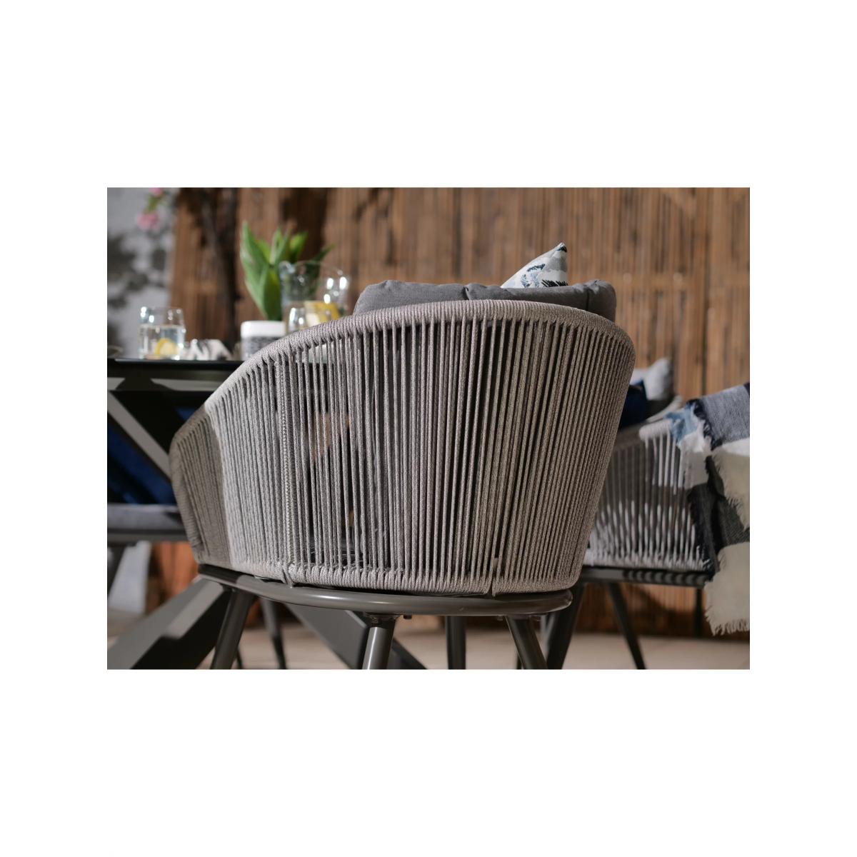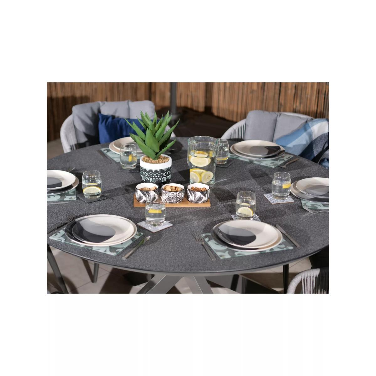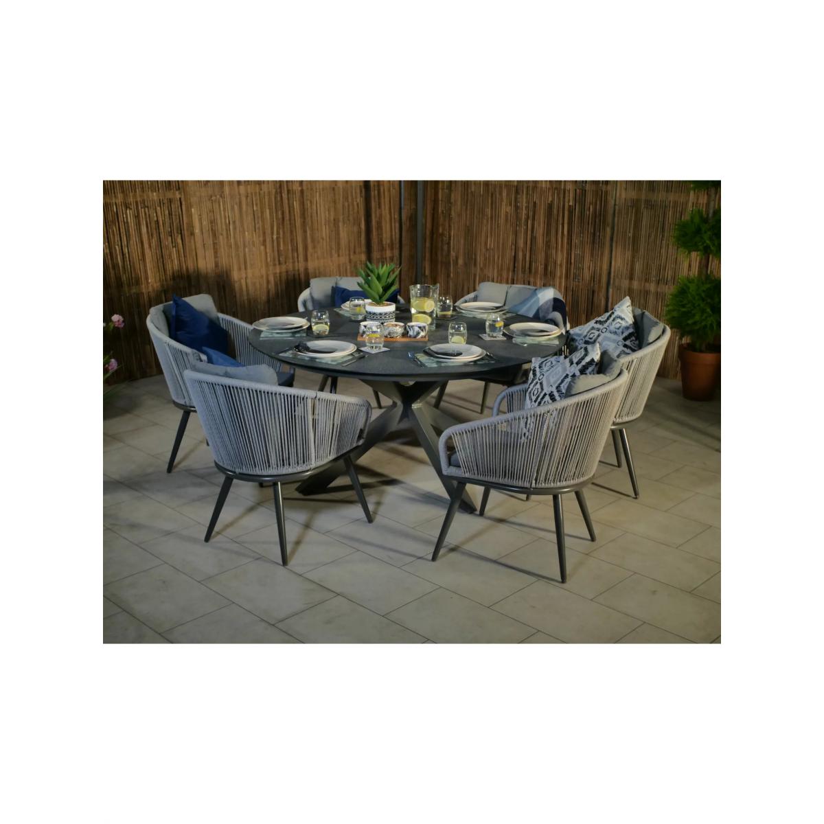 A contemporary design, this Aspen dining set from Royalcraft seats up to six people comfortably in the garden or conservatory. The set includes six dining armchairs with weather-resistant rattan-style rope weaves, hand-woven on powder-coated aluminium frames. The round powder-coated aluminium dining table has a glass spray stone top. Seating cushions and backrest cushions ensure comfortable support. Make sure you bring in the cushions, which are resistant to light rain showers only. Key features: 6 hand-woven rope weave armchairs Round dining table with glass spray stone top Robust weather-resistant aluminium frames Shower-resistant seat and backrest cushions Seat height: 46cm Want to see it first? You may want to see and get a feel for the product in one of our shops before ordering. We'll be able to tell you where the range you'd like to view is on display.