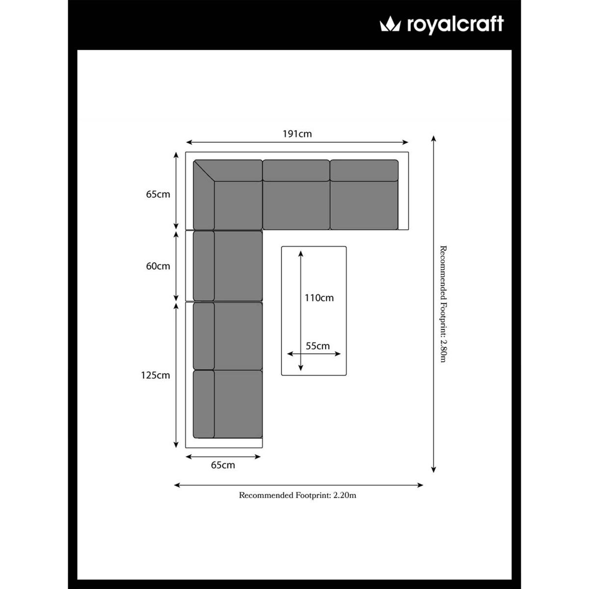Create a relaxing space in your garden with this Royalcraft lounge set. It's made with a durable metal frame covered in synthetic rattan for a timeless look. The corner sofa includes comfy cushions and provides plenty of space for the family. A glass-topped coffee table completes the set.