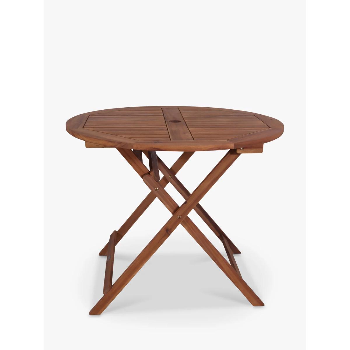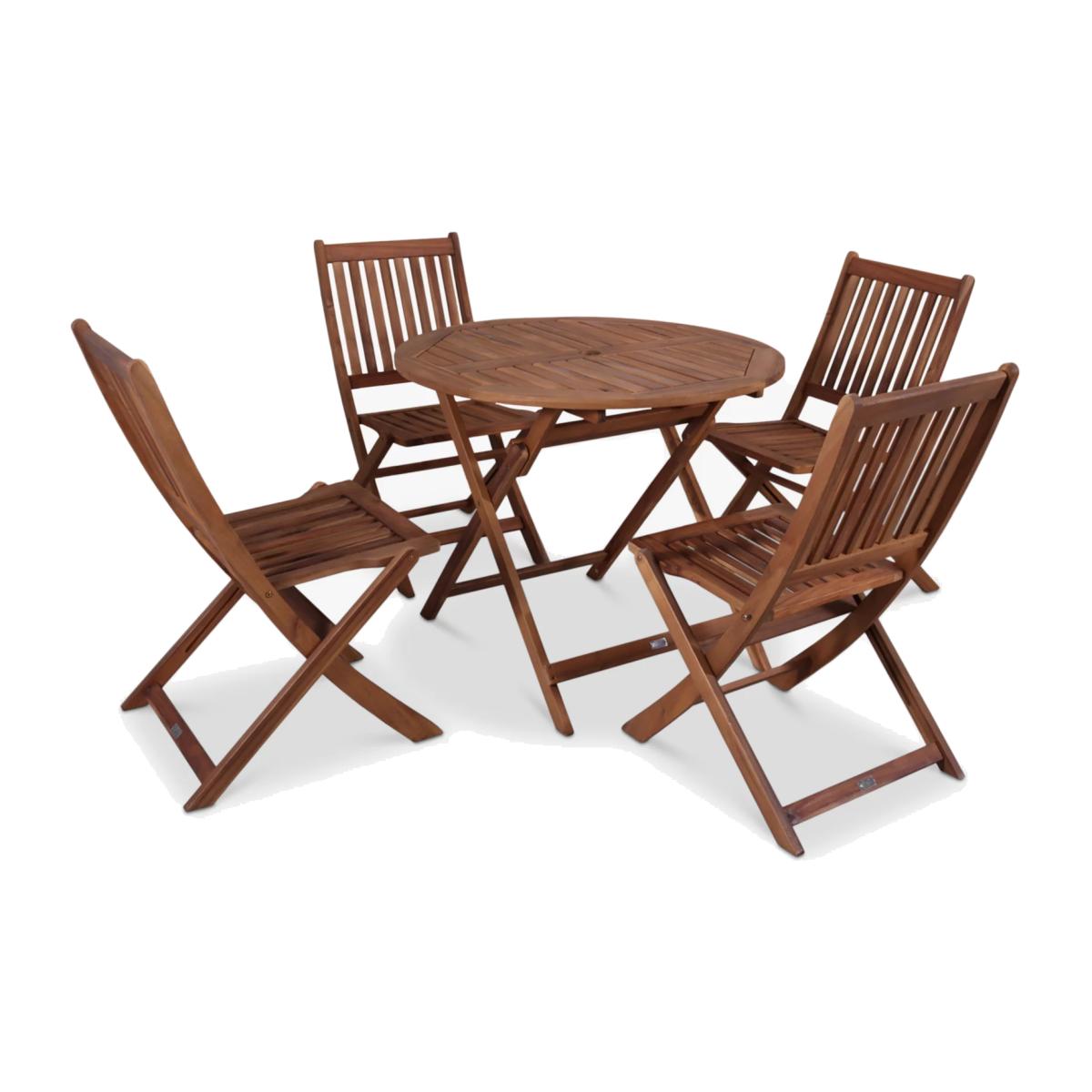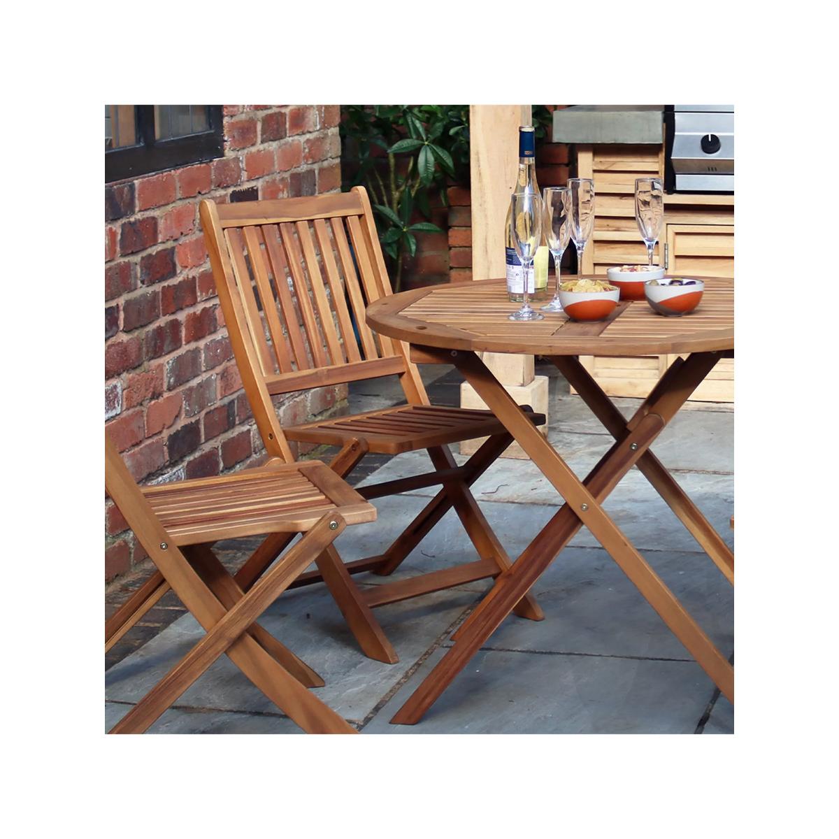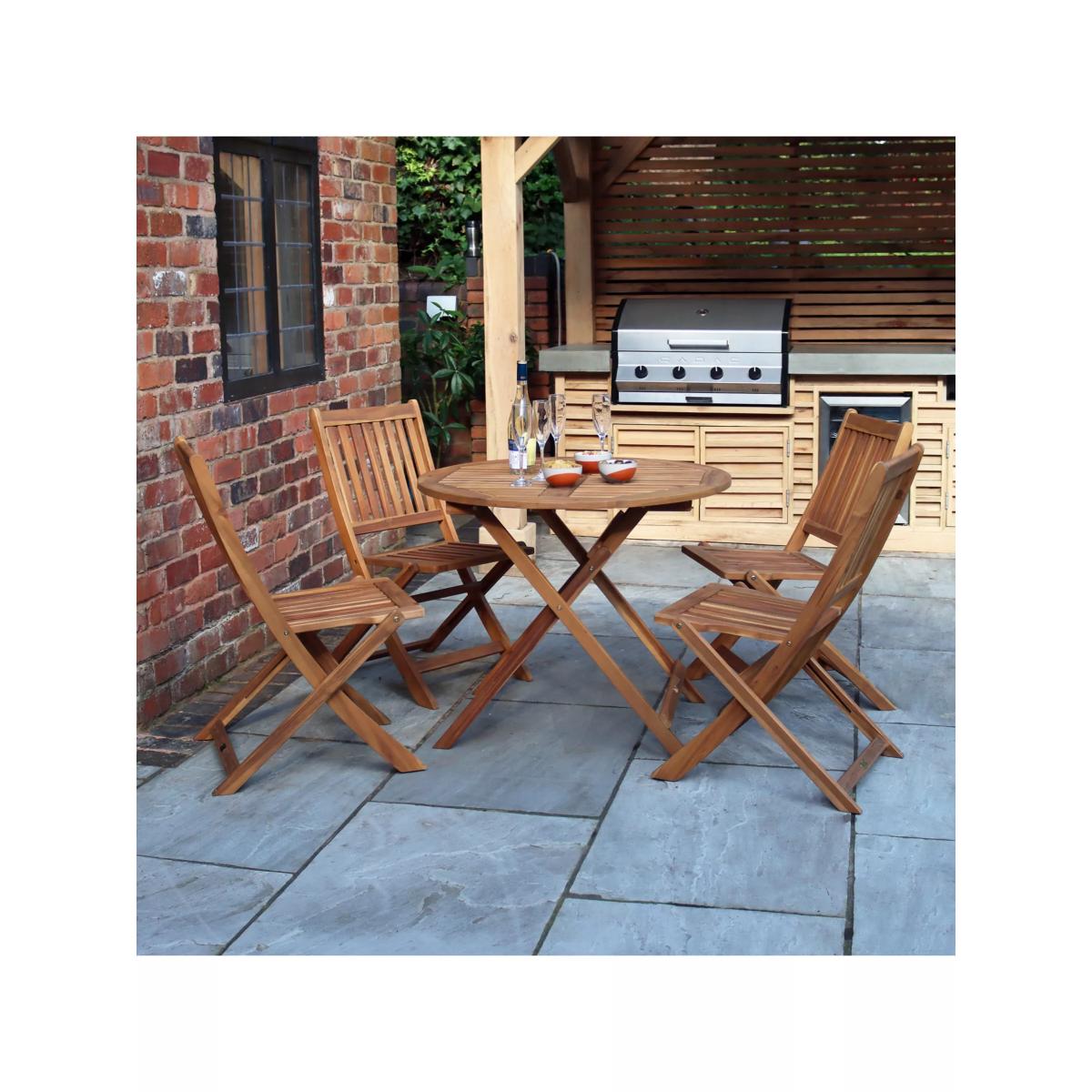 Round Brooklyn garden dining table and four Manhattan garden chairs from Royalcraft. Made from FSC-certified naturally weather-resistant acacia wood, the table and all the chairs fold for easy storage. Key features: Four garden dining chairs Round 90cm dining bistro table with a parasol hole Naturally weather-resistant FSC-certified acacia wood Chairs and table fold for easy storage Easy to maintain By choosing this product you are supporting responsible management of the world's forests. The Forest Stewardship Council® (FSC®) is a global, not-for-profit organisation that helps take care of forests and the people and wildlife that call them home. To learn more, visit fsc.org. Choose the perfect outdoor furniture We have a selection of wooden furniture for you to choose from which will suit the home or garden. Below are a few options to consider when choosing your perfect outdoor furniture. TeakA premium and popular wood with an attractive appearance which ages beautifully. Strong, durable and resistant to rot and decay, this furniture requires little maintenanceEucalyptusDistinctive scent and appearance which darkens as it ages. Provides similar natural benefits to teak including moisture resistance, hardness and durability. It's plentiful in supply which makes the furniture an inexpensive choice. AcaciaNaturally durable, this wood is incredibly hard and is unlikely to suffer damage during everyday use. It provides similar natural benefits to teak, yet unlike many other hardwoods, acacia is also relatively fast growing which minimises the environmental impact.