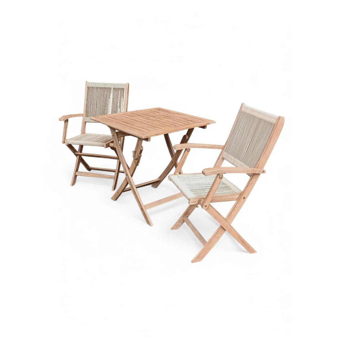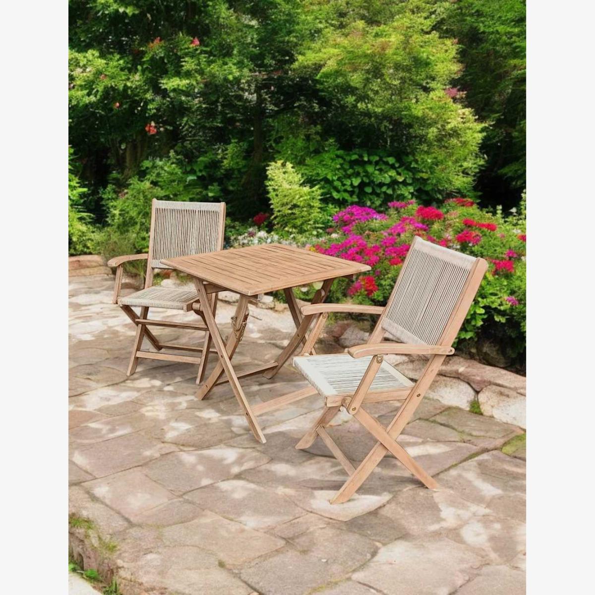 This wooden bistro table and chairs set from Royalcraft will add a stylish look to your outside space. It includes a square table and two armchairs featuring textured rope detailing on the seat and back. Each piece can be folded away for easy storage and is wipe-clean.