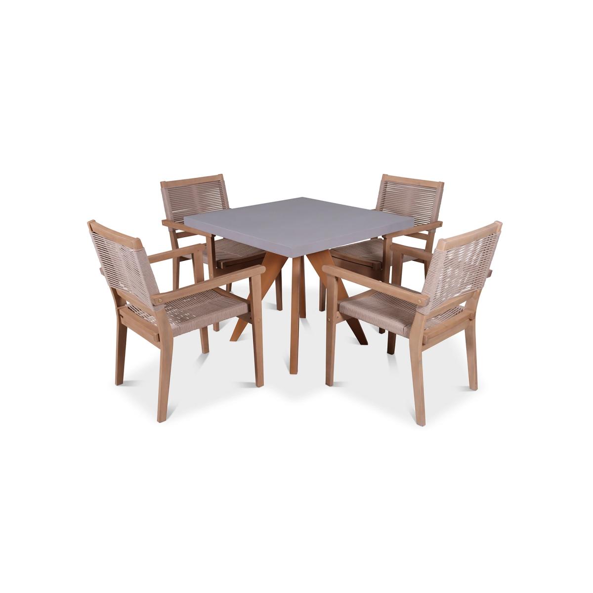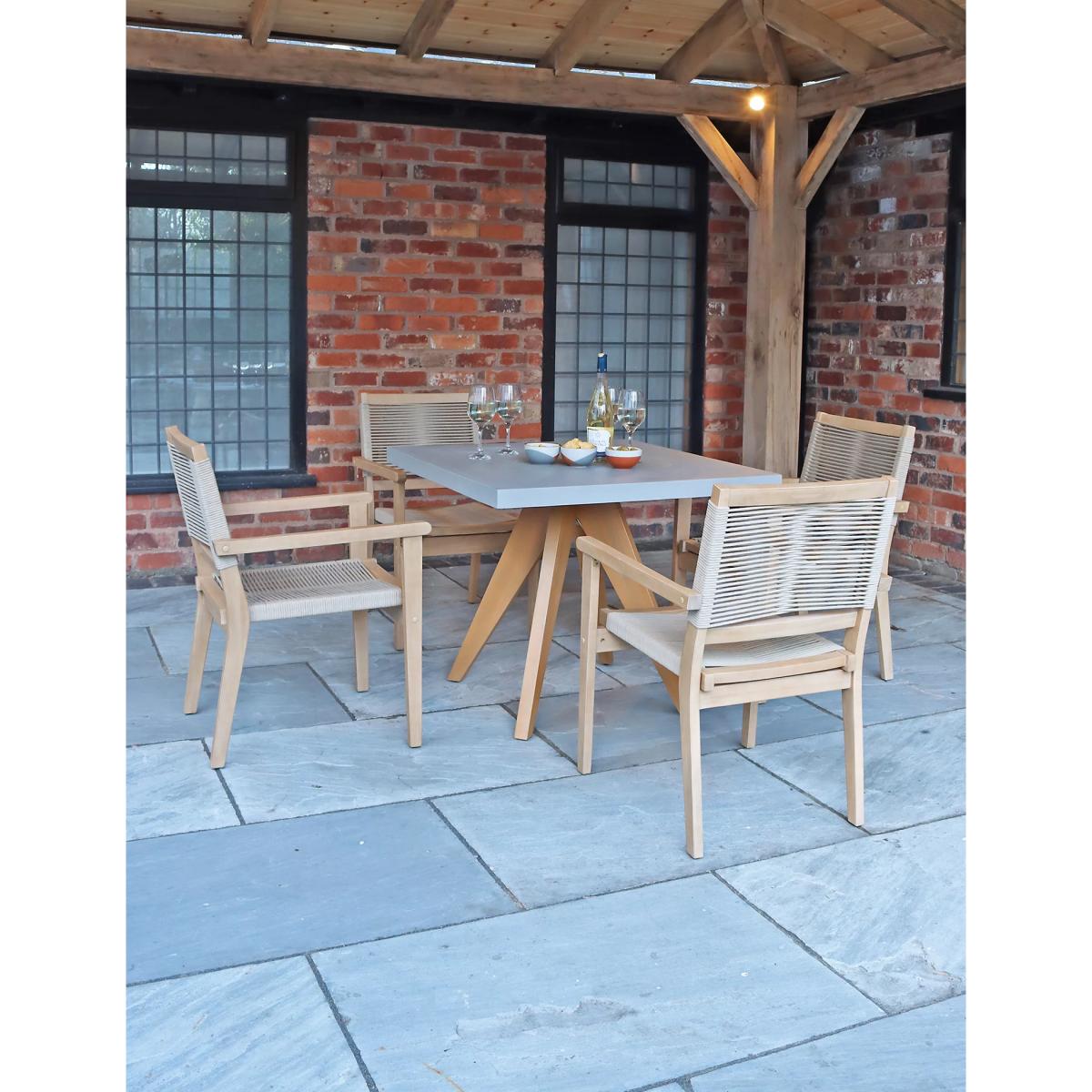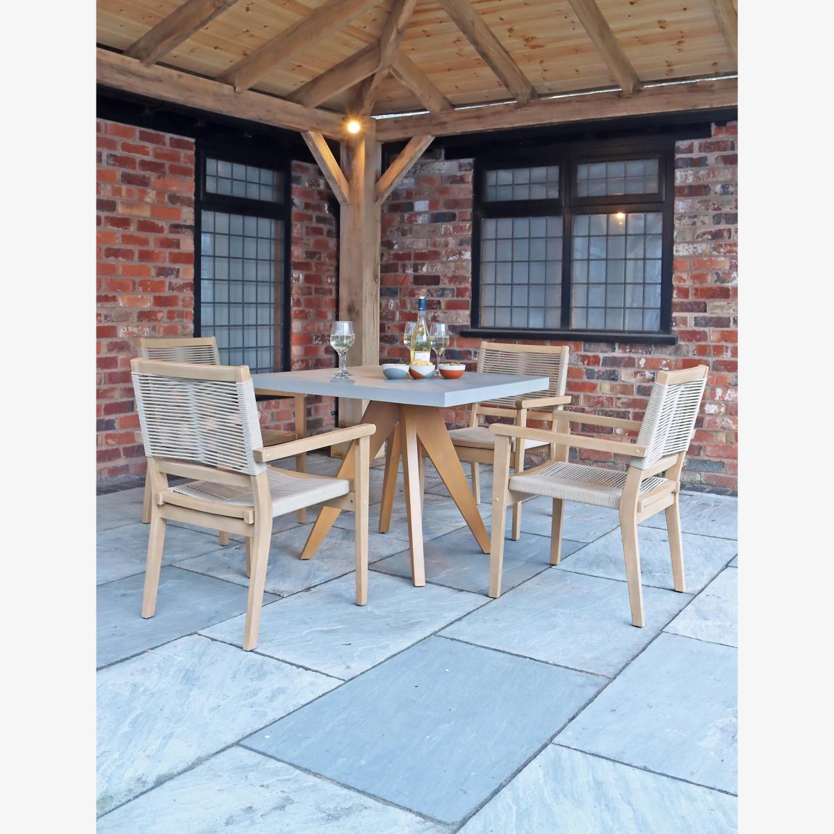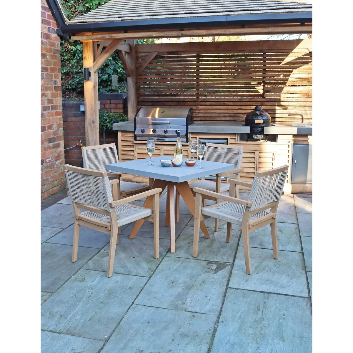 Add a stylish edge to your outdoor space with this Royalcraft Luna dining set. It includes four lounge chairs crafted with textured rope detail across the back and seats. These can be stacked up when not in use for easy storage. The set is complete with a square table which features angular legs for a modern look.