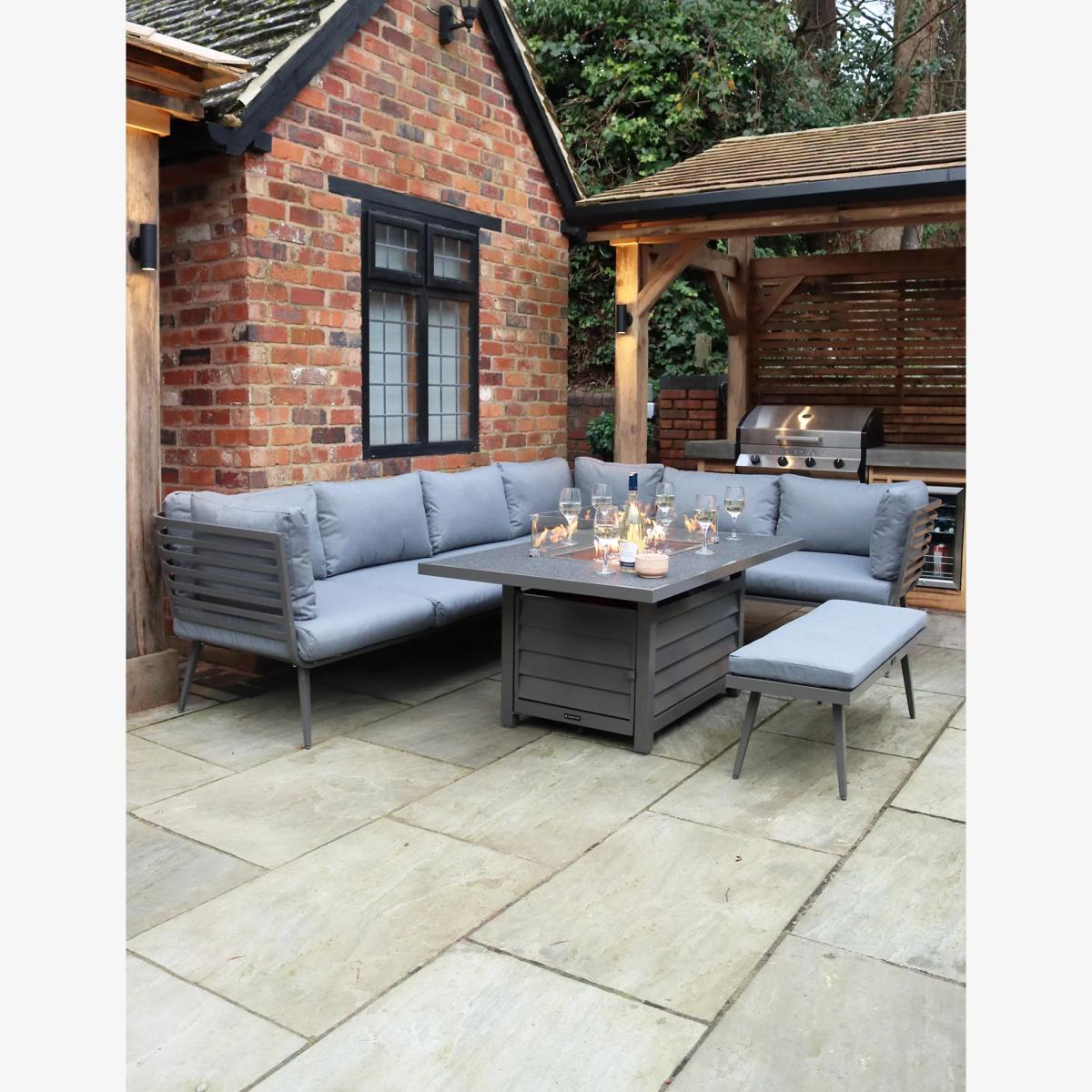 Enjoy the outdoors year-round with the Mayfair dining set from Royalcraft. This elegant design features a fire-pit in the centre of the rectangular table to create a stunning, warming centrepiece when the evenings get chilly. The corner sofa and matching bench provide ample space for socialising with family and friends and are complete with plush cushions.
