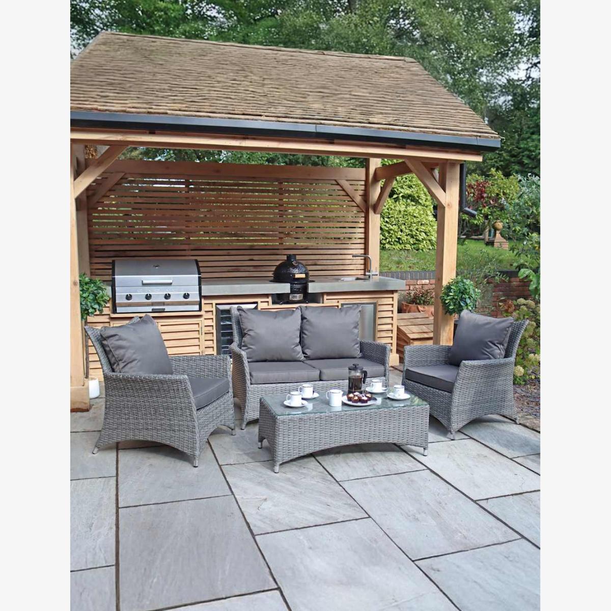 I love how the Paris four seater lounge set brings a contemporary, neutral tone to outdoor spaces, making it a versatile choice that blends seamlessly with various garden styles. Its grey upholstery is sleek and modern, but also practical for hiding dirt and wear, ideal for regular outdoor use. This set works well in both minimalist and cosy, traditional gardens when paired with greenery or colourful accessories like cushions or throws to add warmth. For styling tips, consider layering with textured cushions or a patterned outdoor rug to soften the look. Additionally, complementing it with wooden or rattan accents can enhance a natural aesthetic, while string lights overhead will create inviting evening ambiance.