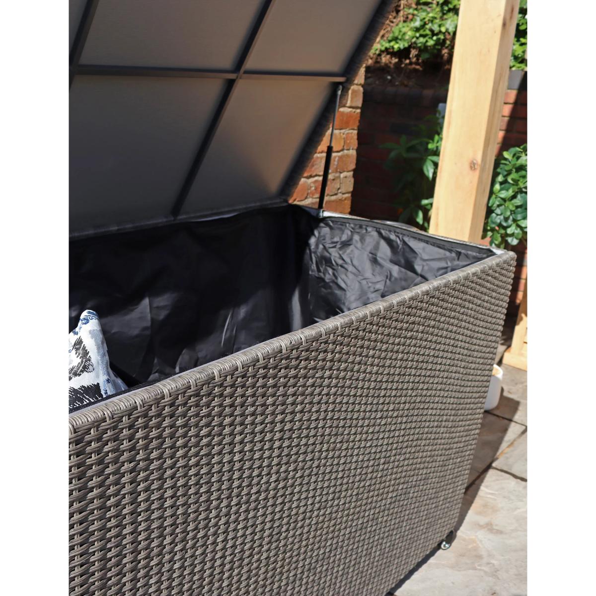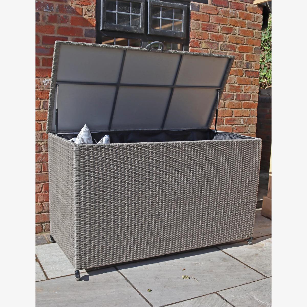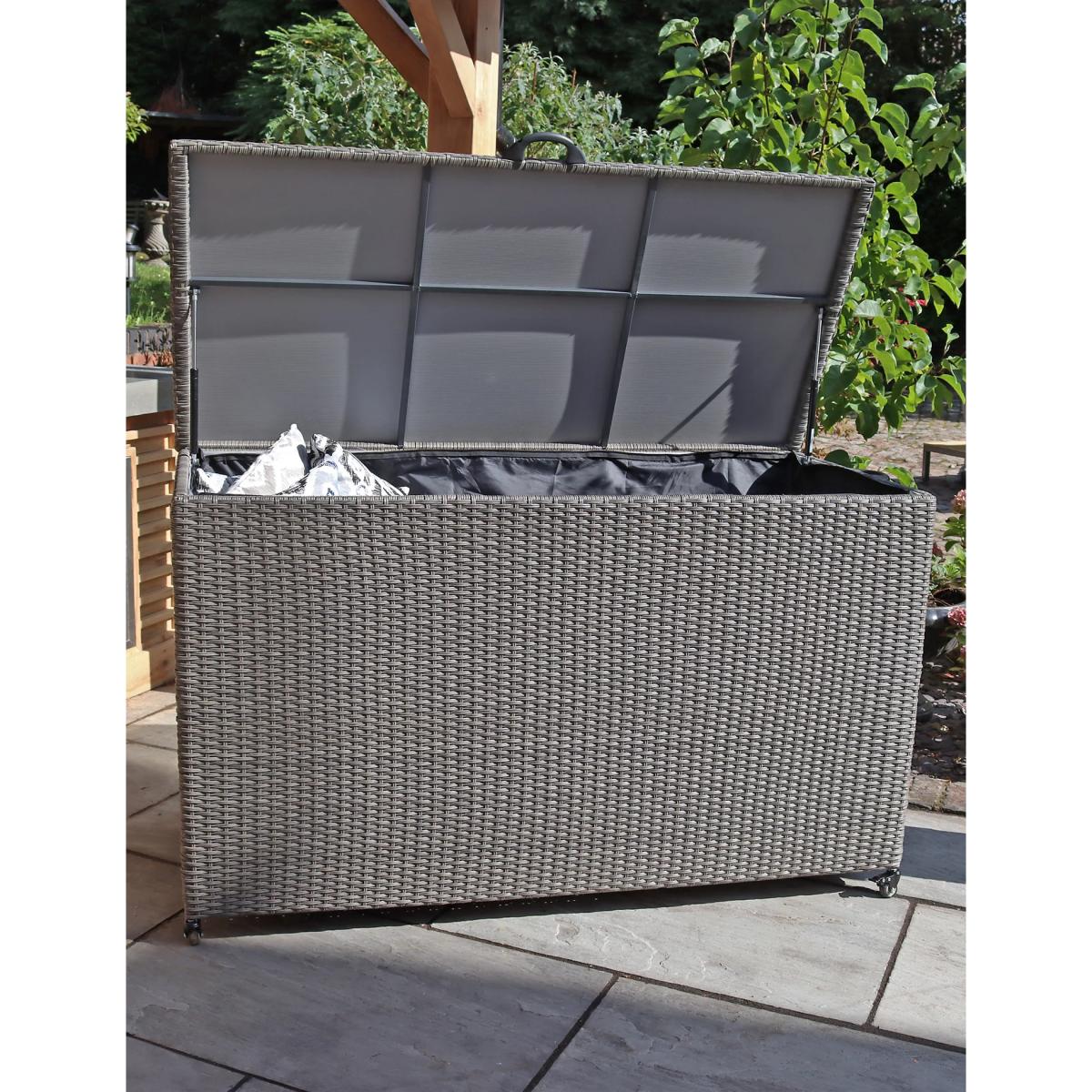Keep your outdoor cushions and throws protected from the elements in the Paris garden cushion box from Royalcraft. This large, rectangular chest is made from durable synthetic rattan with a robust galvanised steel frame and a waterproof inner lining. Hydraulic hinges hold the lid securely open when you're placing items inside. Wheels on the base make this piece easy to move around.