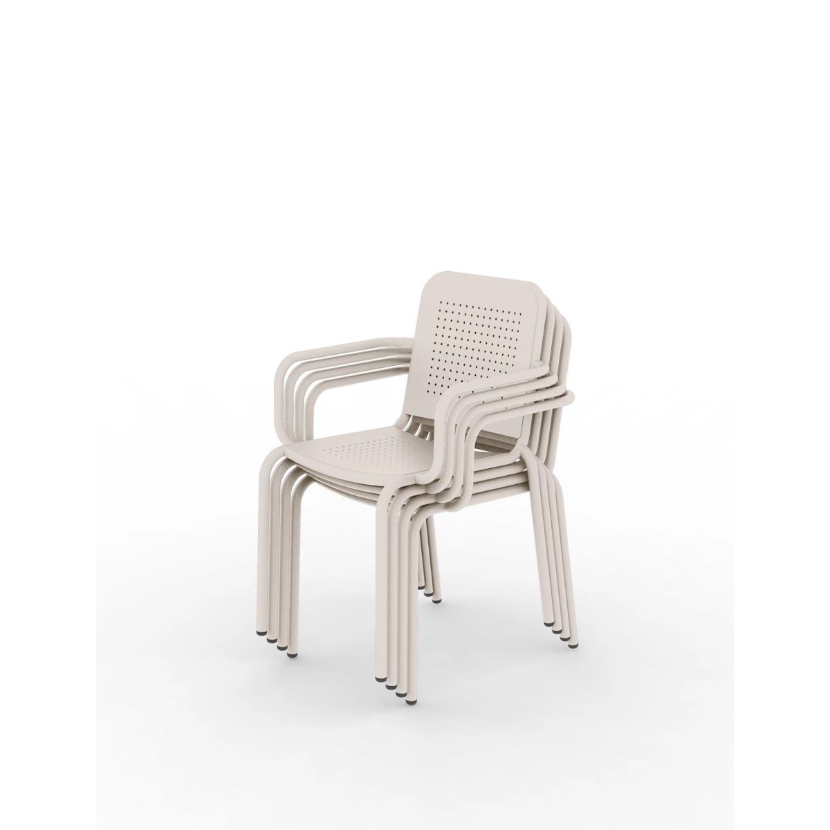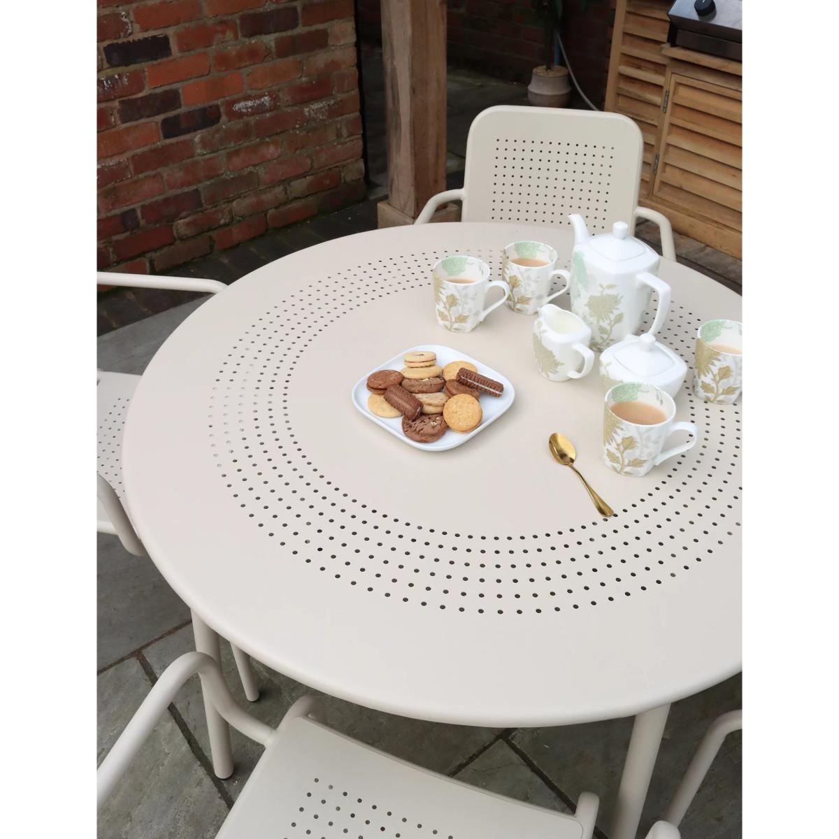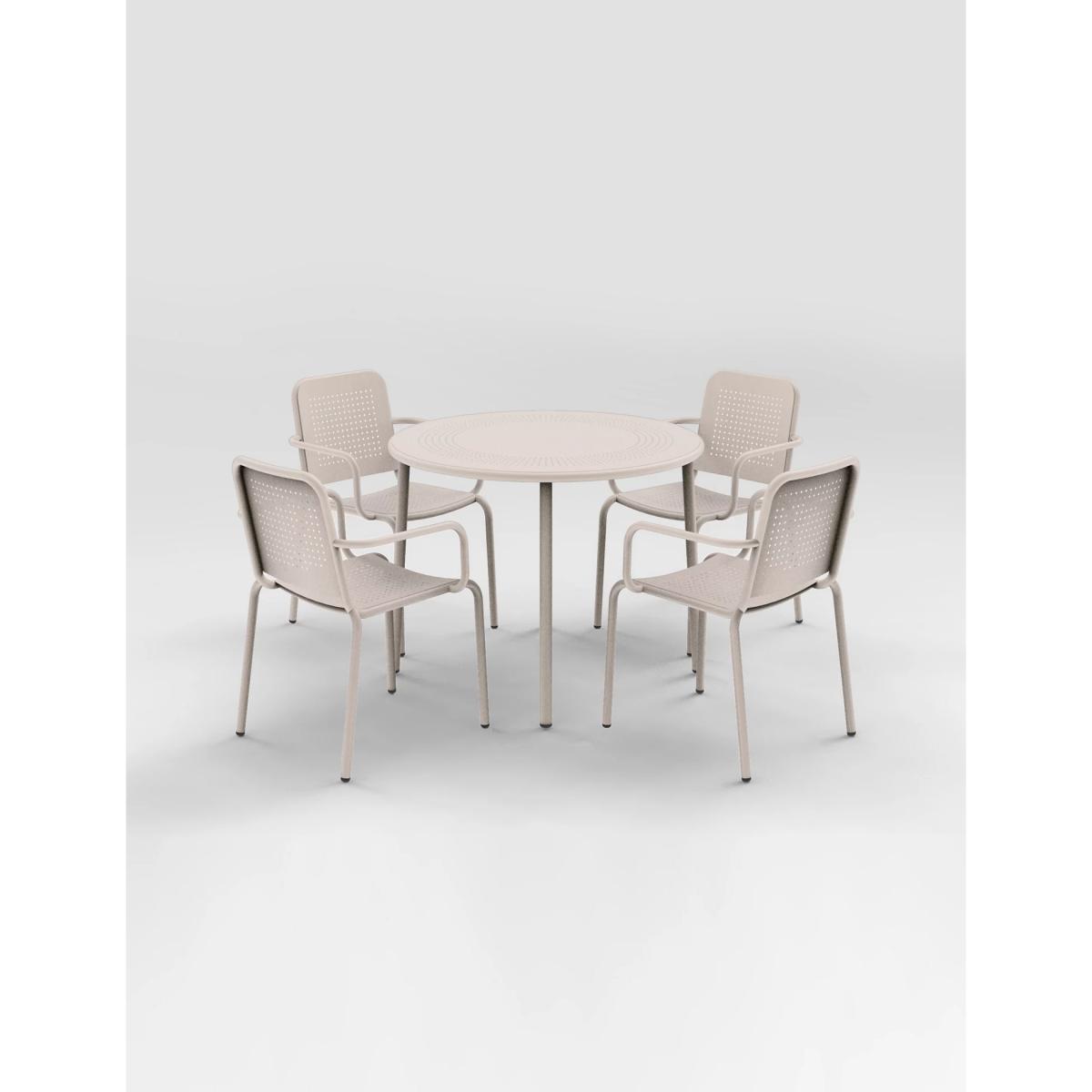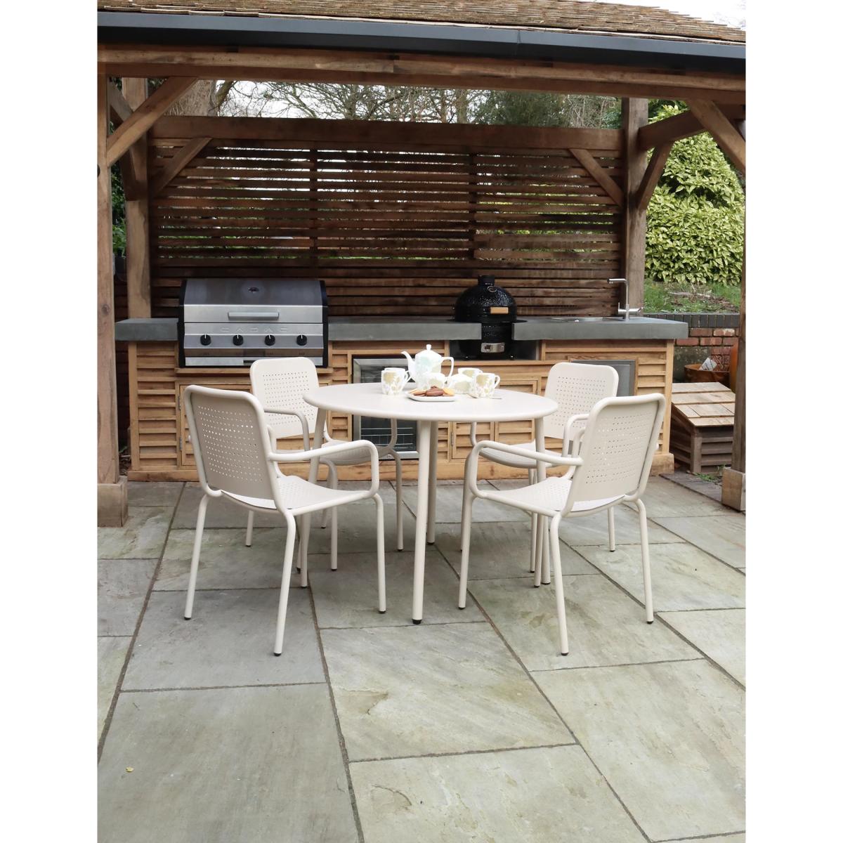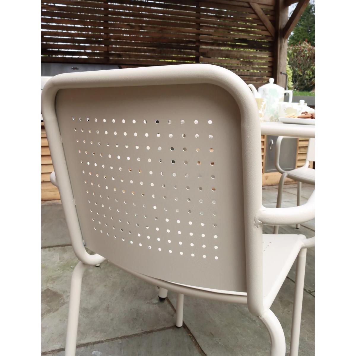 Embrace modern minimalism with the Porto dining set from Royalcraft. This sleek garden furniture is made from durable metal in a coloured matte coating. The set includes four chairs with armrests and a rounded table set on four slightly splayed legs for stability. Each piece is stackable to ensure effortless storage when not in use.